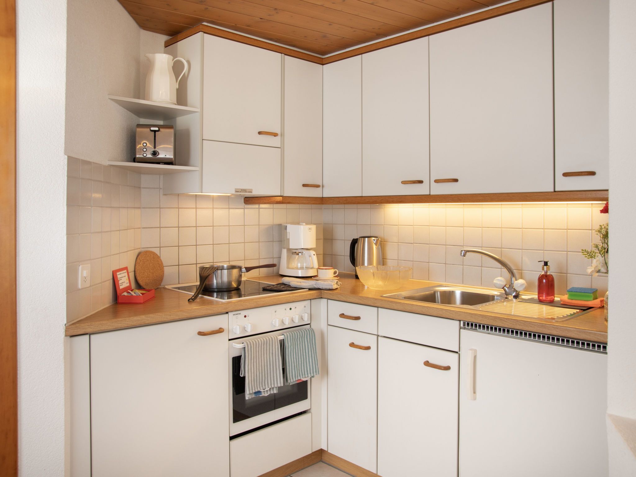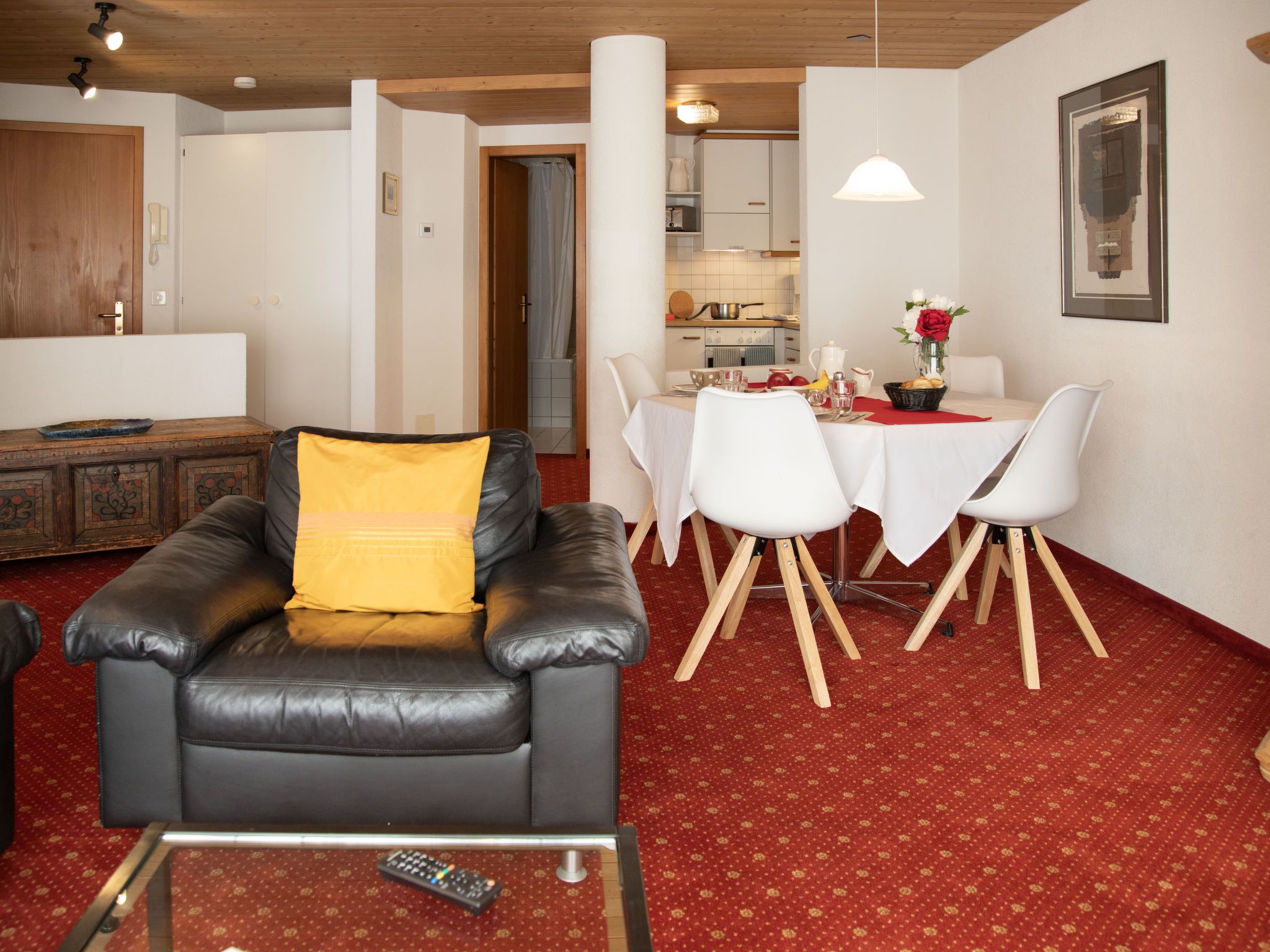 2-Zimmer-Wohnung 47 m2 im 1. Stock, Südlage. Wohn-/Esszimmer mit Kabel-TV (Flachbildschirm). 1 Doppelzimmer. Offene Küche (Backofen, 4 Glaskeramikplatten, Toaster, Wasserkocher, elektrische Kaffeemaschine). Bad/WC. Kleiner Balkon, Südlage. Schöne Sicht auf die Berge und Eiger. Zur Verfügung: Haartrockner. Internet (Wireless LAN, gratis). Bitte beachten: Nichtraucher-Unterkunft. Maximal 1 Haustier/Hund erlaubt. Ein Fondue Set (Fleisch oder Käse) sowie ein Raclette Ofen kann an der Rezeption ausgeliehen werden. Sehr schmaler Balkon. Keine Balkonmöbel.