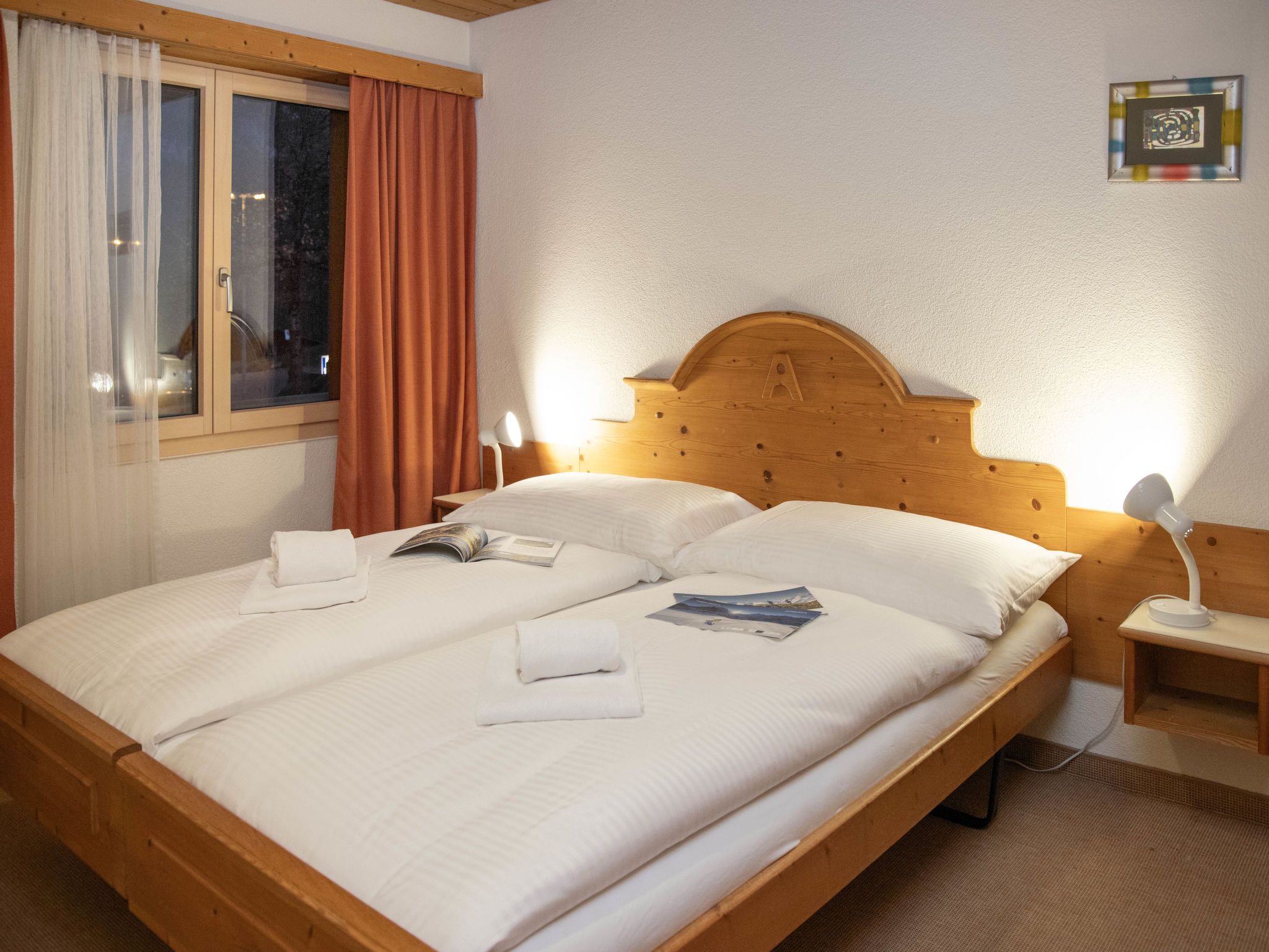 2-Zimmer-Wohnung 64 m2 im 1. Stock, Südlage. Wohn-/Esszimmer mit 2 Betten und Kabel-TV (Flachbildschirm). 1 Doppelzimmer. Offene Küche (Backofen, 4 Glaskeramikplatten, Wasserkocher, elektrische Kaffeemaschine, Kapseln für die Kaffeemaschine (Nespresso) extra). Bad/WC. Bodenheizung. Kleiner Balkon, Südlage. Balkonmöbel. Schöne Sicht auf die Berge und Eiger. Zur Verfügung: Haartrockner. Internet (WLAN, gratis). Bitte beachten: Nichtraucher-Unterkunft. Maximal 1 Haustier/Hund erlaubt. Ein Fondue Set (Fleisch oder Käse) sowie ein Raclette Ofen kann an der Rezeption ausgeliehen werden.