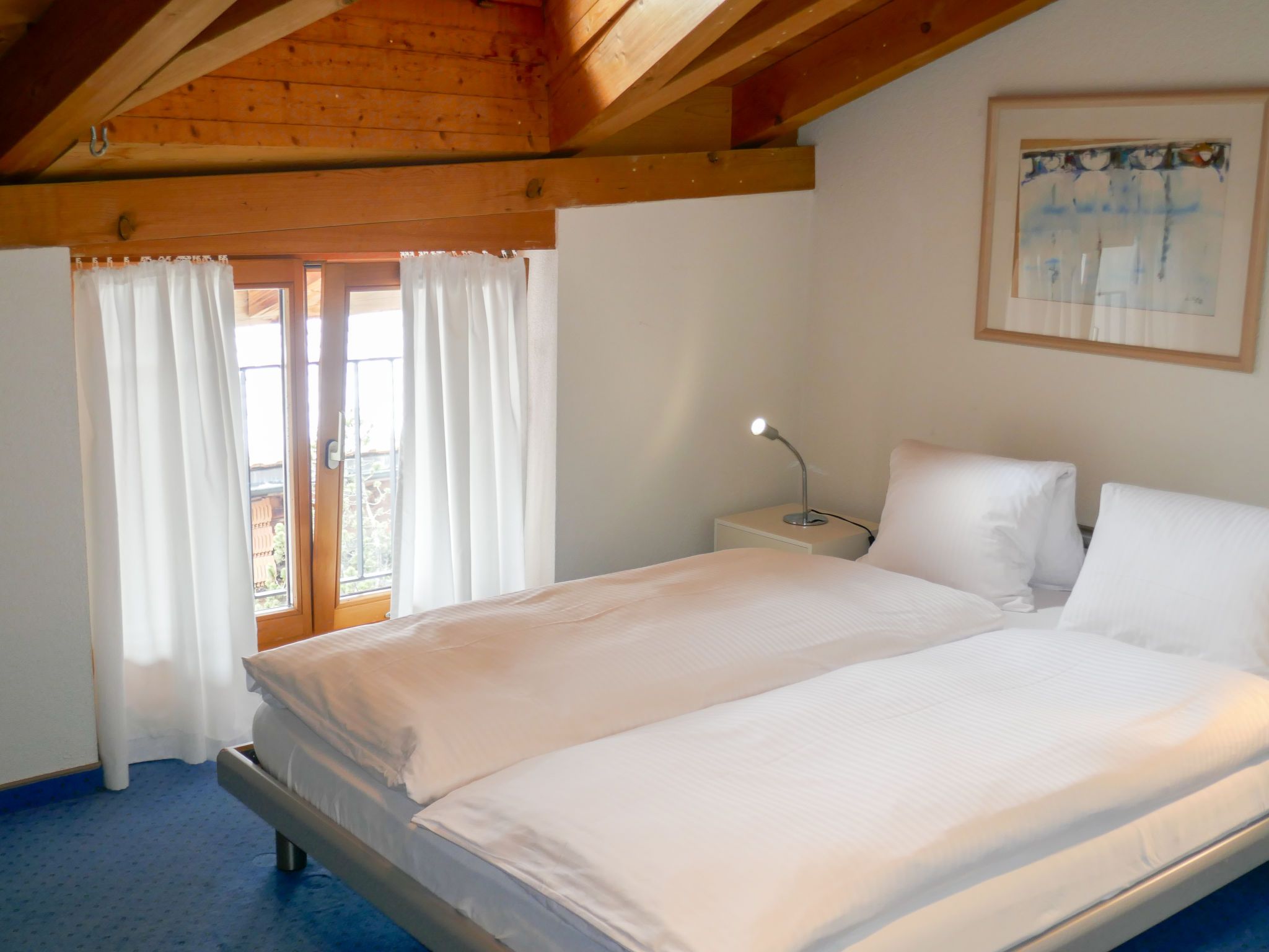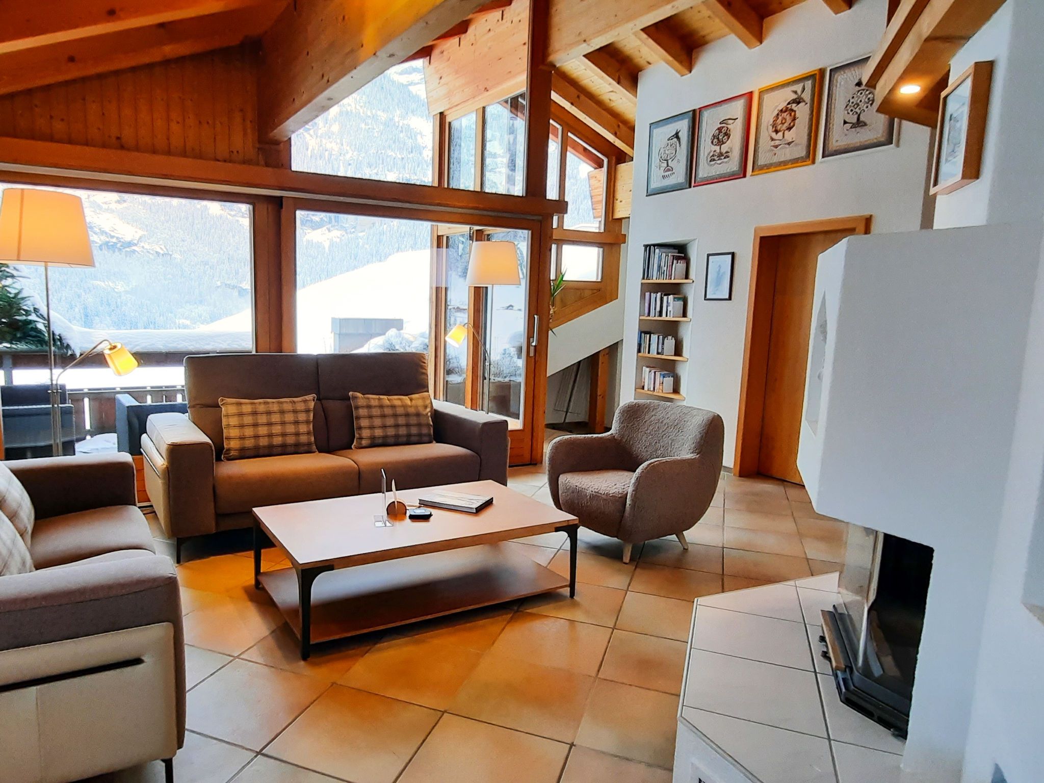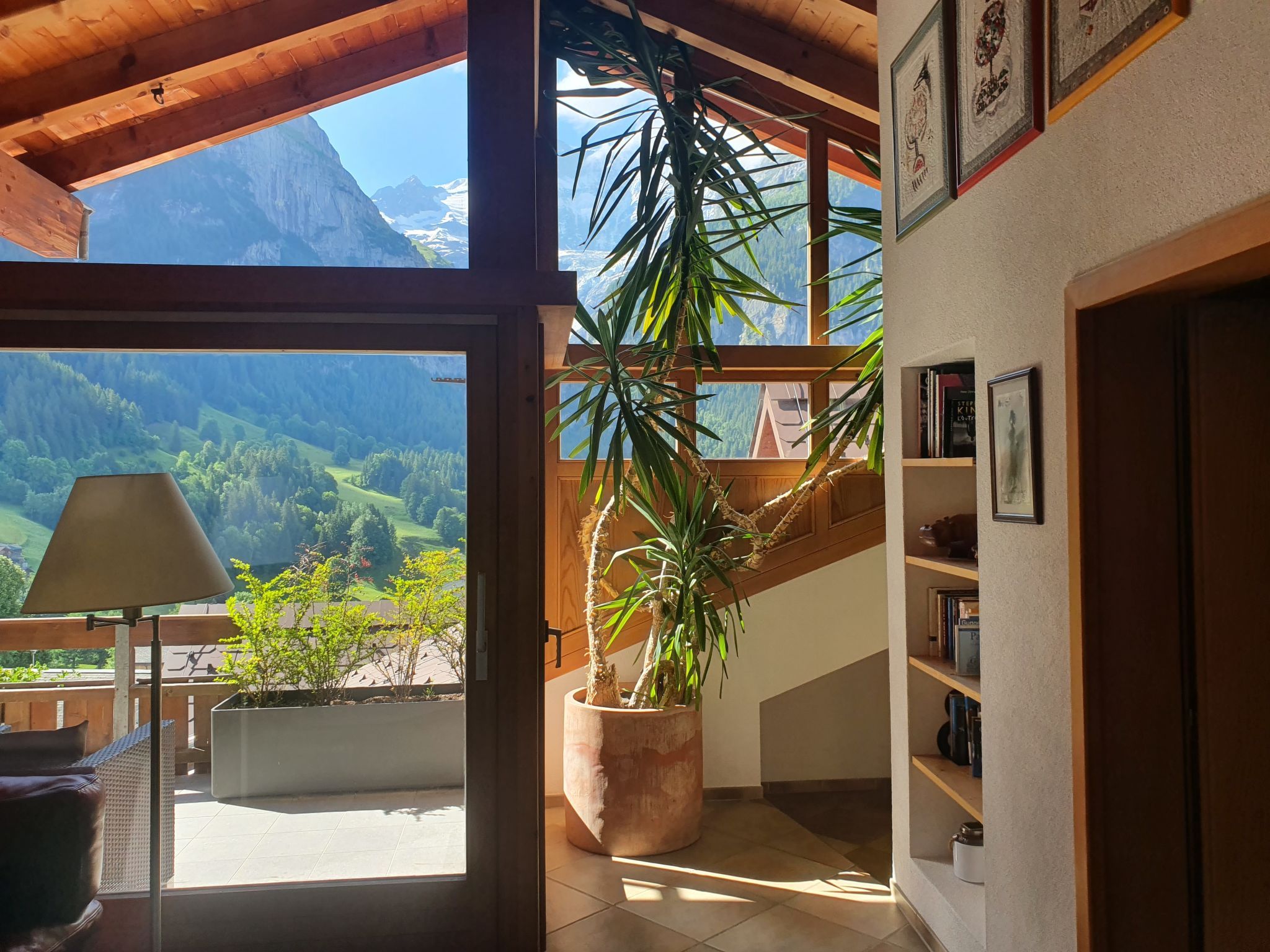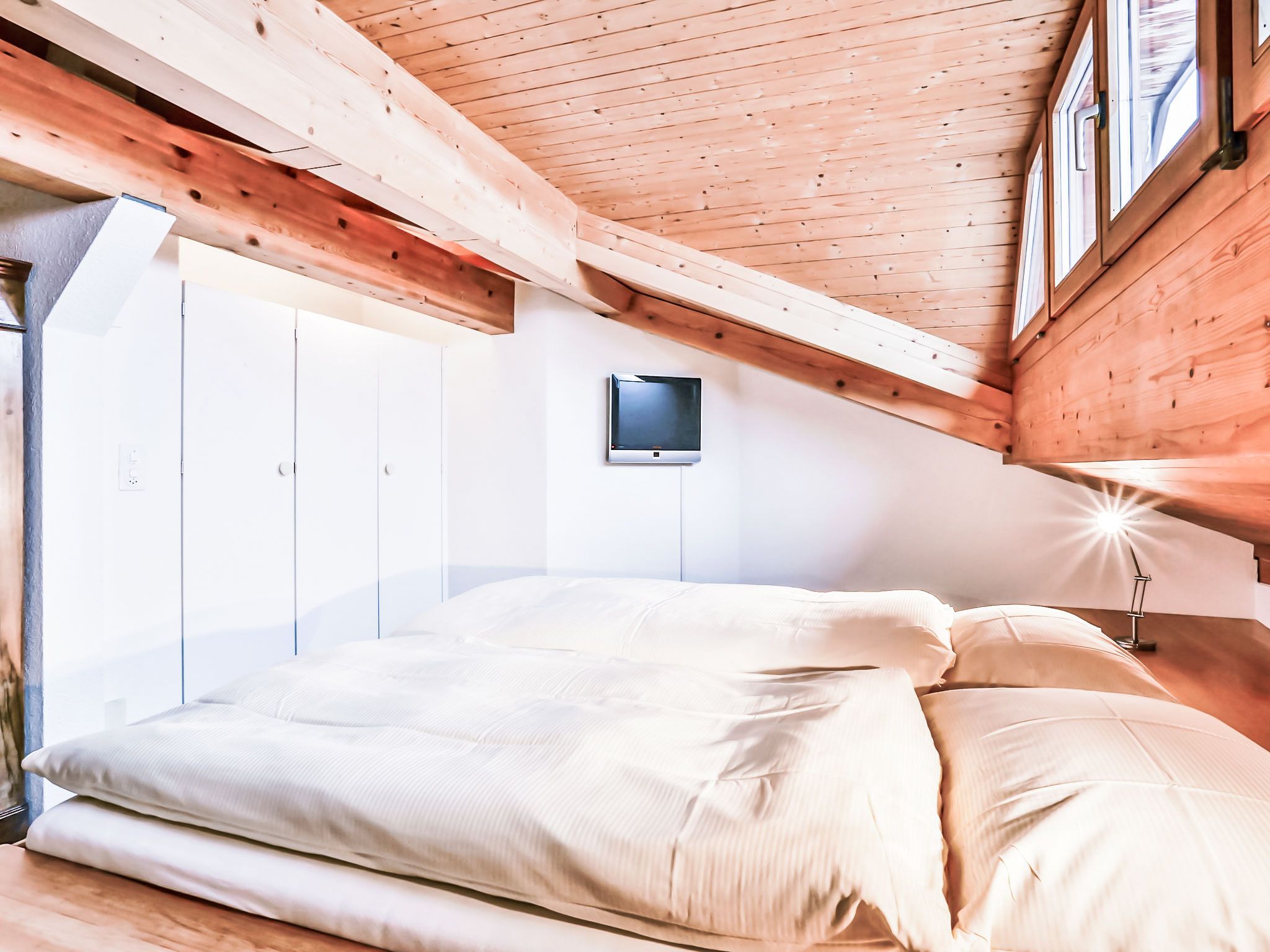 4-Zimmer-Wohnung 124 m2, im Dachgeschoss. Teilweise abgeschrägt, komfortabel und gemütlich eingerichtet: Wohn-/Esszimmer mit offenem Kamin und Kabel-TV (Flachbildschirm). Ausgang zum Balkon, Richtung Süden. 1 Zimmer mit 1 franz. Bett (180 cm, Länge 200 cm). 1 Zimmer mit 1 franz. Bett (140 cm, Länge 200 cm). 1 Doppelzimmer mit 2 Betten (90 cm, Länge 190 cm), Bad/Dusche/WC und Kabel-TV. Offene Küche (Backofen, Geschirrspüler, 4 Glaskeramikplatten, Toaster, Wasserkocher, Mikrowelle, elektrische Kaffeemaschine, Kapseln für die Kaffeemaschine (Nespresso) extra). Bad/WC, sep. WC. Balkon 16 m2, Südlage. Terrassenmöbel. Herrliche Sicht auf die Berge und Eiger. Zur Verfügung: Haartrockner. Internet (WLAN, gratis). Bitte beachten: Nichtraucher-Unterkunft. Maximal 1 Haustier/Hund erlaubt. Ein Fondue Set (Fleisch oder Käse) sowie ein Raclette Ofen kann an der Rezeption ausgeliehen werden. Zutritt zur Wohnung mit Aufzug und Treppe rauf.
