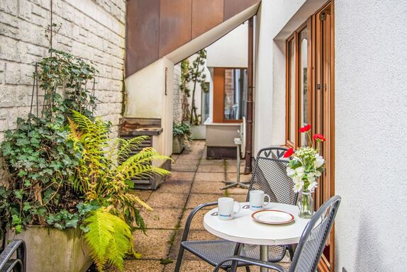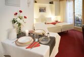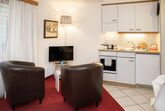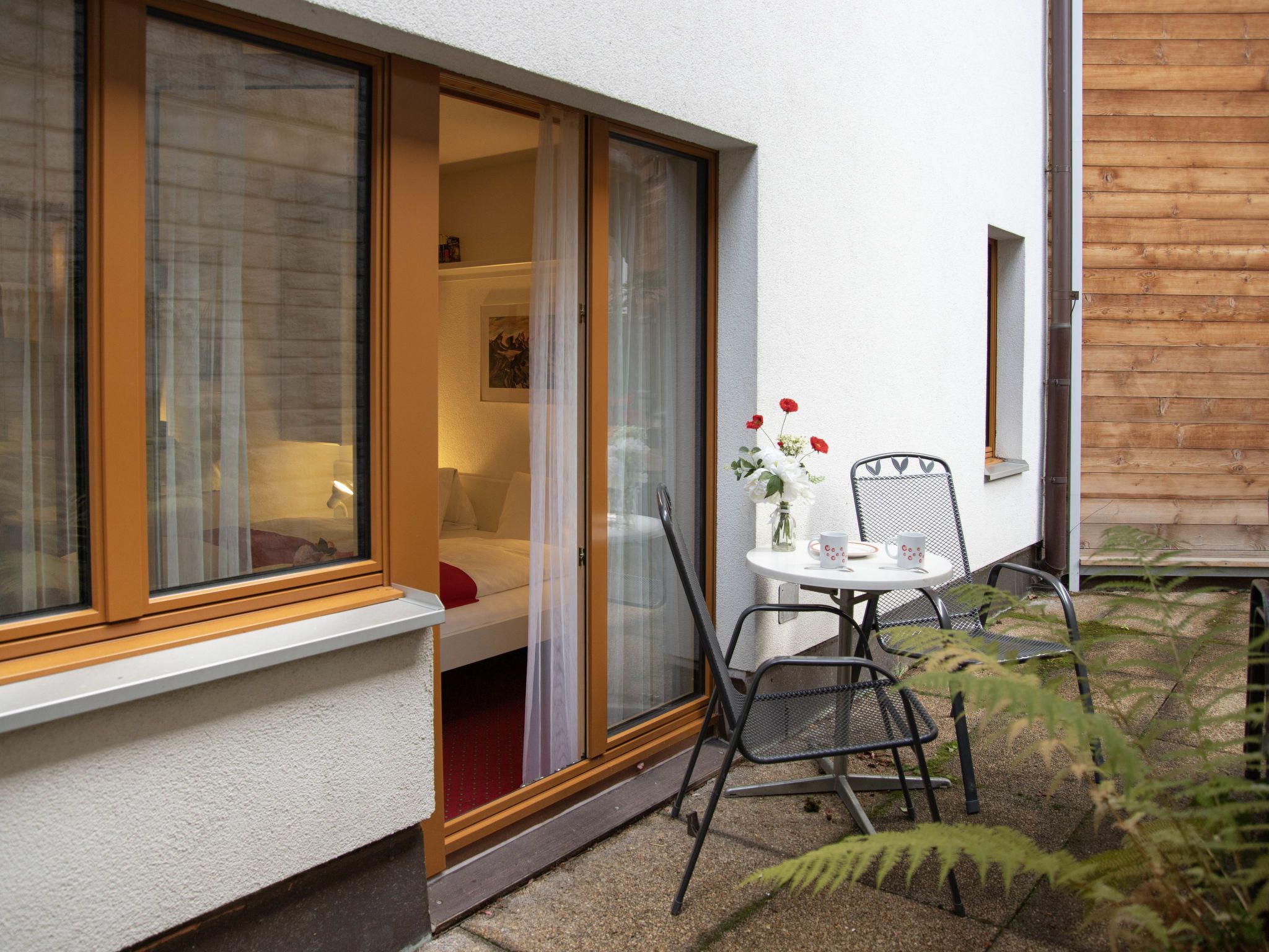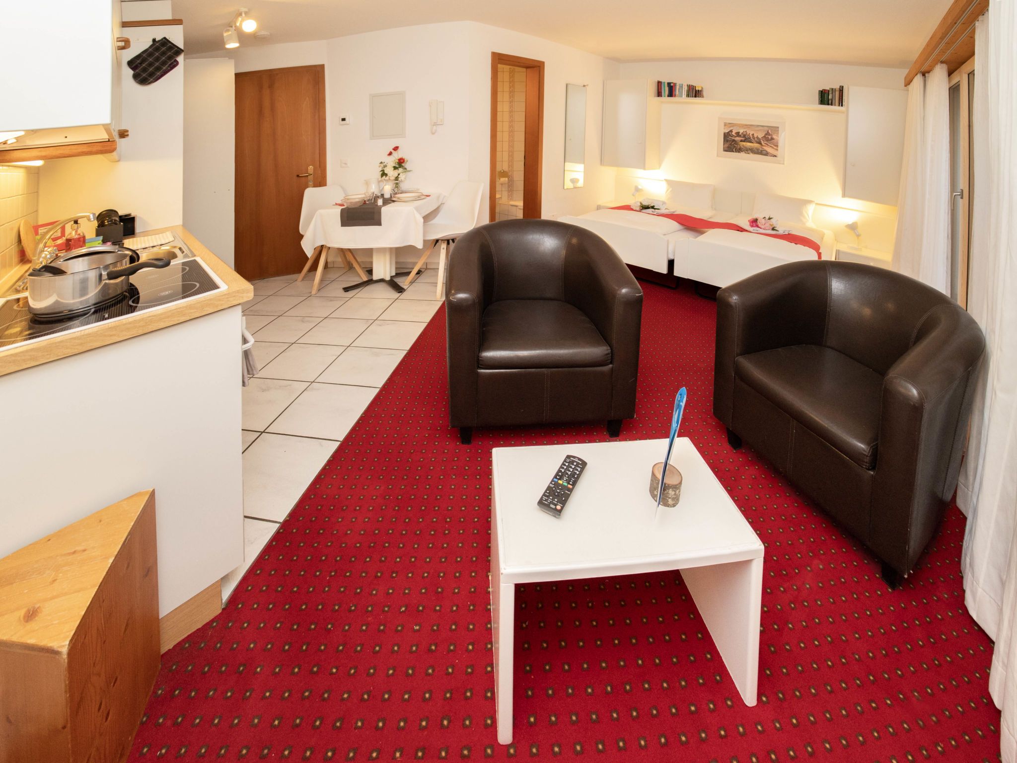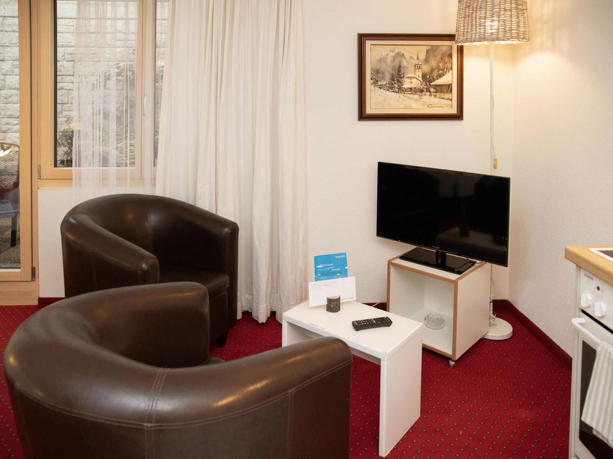 1-Zimmer-Wohnung 22 m2 im 2. Stock. Wohn-/Esszimmer mit 2 Betten und Kabel-TV (Flachbildschirm). Kochnische (Backofen, 4 Glaskeramikplatten, Toaster, Wasserkocher, elektrische Kaffeemaschine). Dusche/WC. Keine Sicht. Zur Verfügung: Haartrockner. Internet (Wireless LAN, gratis). Bitte beachten: Wohnung auf Hofseite. Nichtraucher-Unterkunft. Maximal 1 Haustier/Hund erlaubt. Ein Fondue Set (Fleisch oder Käse) sowie ein Raclette Ofen kann an der Rezeption ausgeliehen werden.