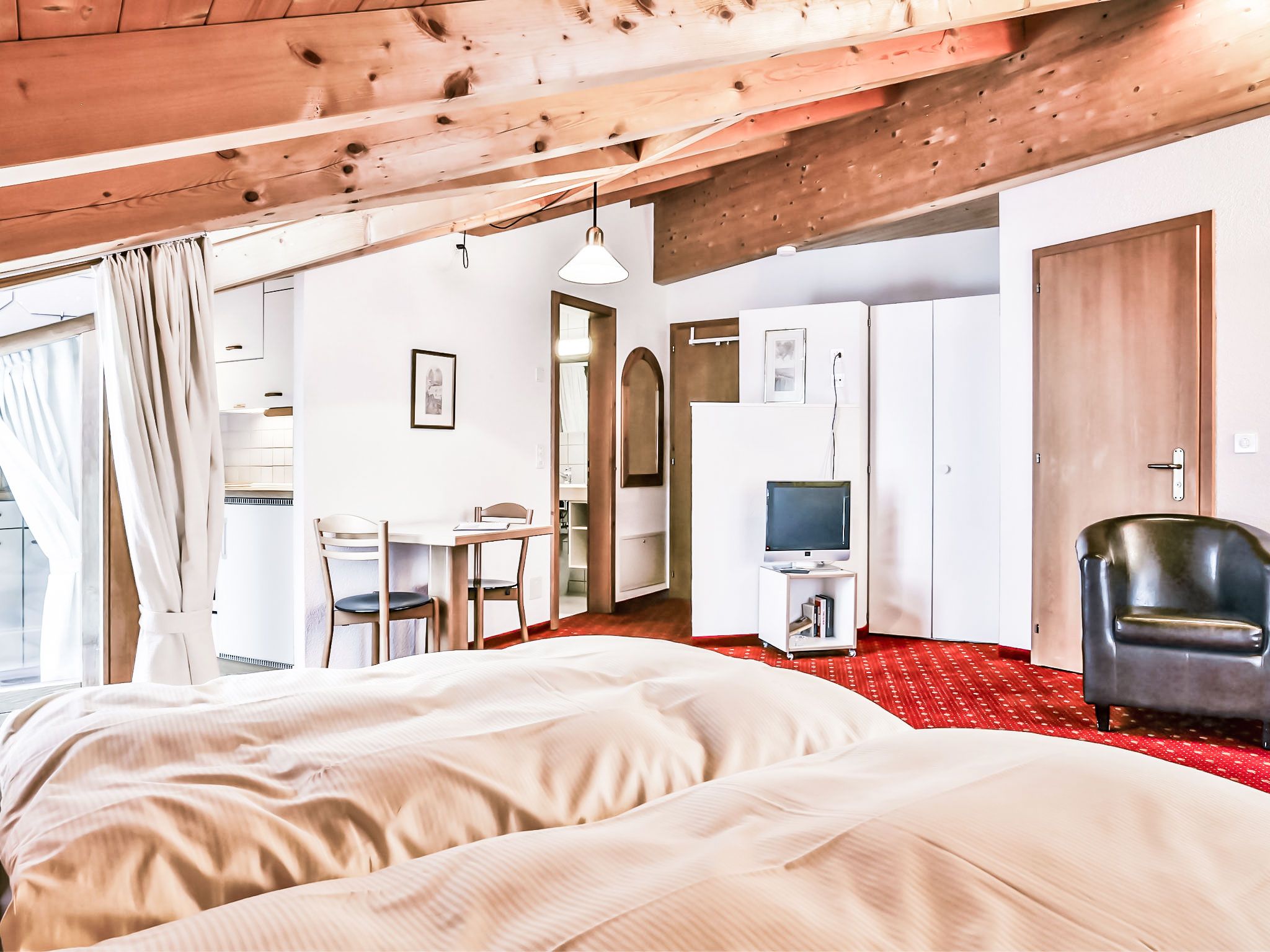 1-Zimmer-Wohnung 29 m2 im 4. Stock, Südlage. Wohn-/Schlafzimmer mit 2 Betten und Kabel-TV (Flachbildschirm). Offene Küche (Backofen, Toaster, Wasserkocher, elektrische Kaffeemaschine) mit Esstisch. Bad/WC. Balkon, Südlage Balkon, Westlage. Terrassenmöbel. Sicht auf die Berge und Eiger. Zur Verfügung: Haartrockner. Internet (Wireless LAN, gratis). Bitte beachten: Nichtraucher-Unterkunft. Maximal 1 Haustier/Hund erlaubt. Ein Fondue Set (Fleisch oder Käse) sowie ein Raclette Ofen kann an der Rezeption ausgeliehen werden.