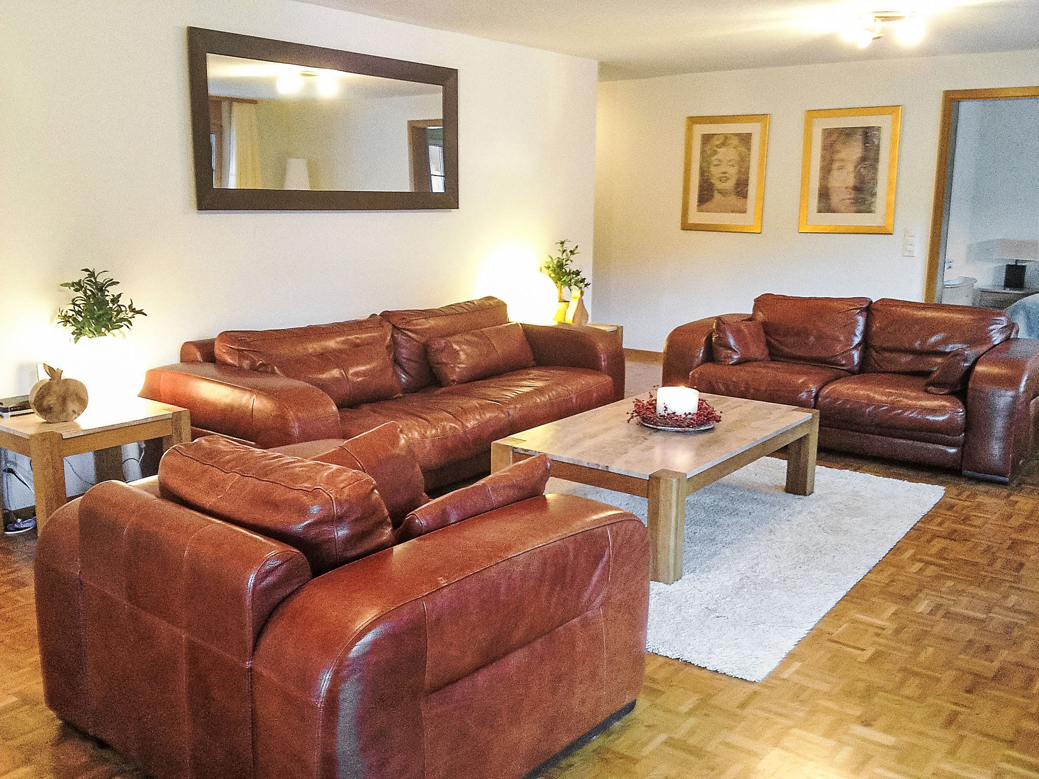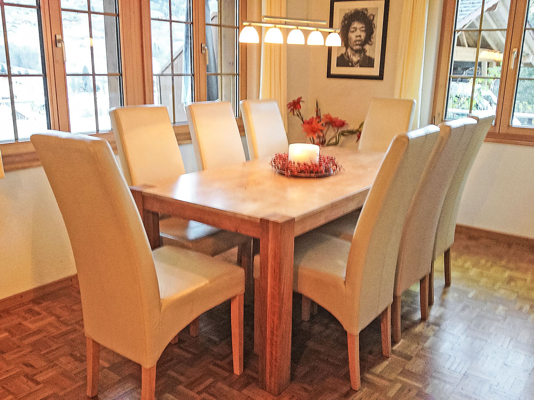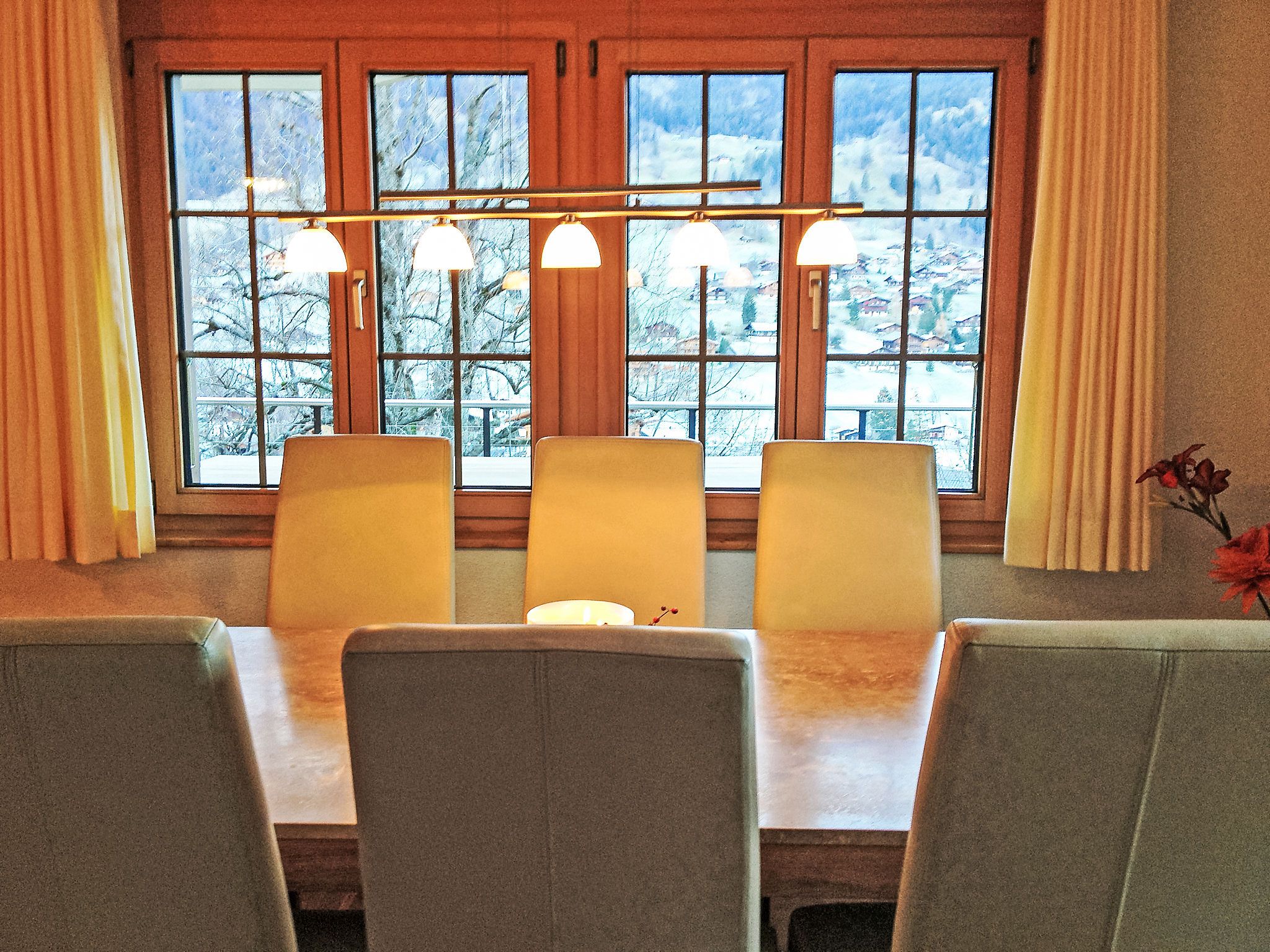 5-Zimmer-Wohnung 140 m2, im erhöhten Erdgeschoss, Südlage. Geschmackvoll und gemütlich eingerichtet: Wohn-/Esszimmer mit Digital-TV und Flachbildschirm. Ausgang zur Terrasse, Richtung Süden und Richtung Westen. 2 Zimmer, jedes Zimmer mit 2 Betten (90 cm, Länge 200 cm). 1 Zimmer mit 1 Doppelbett (180 cm, Länge 200 cm). 1 Zimmer mit 1 franz. Bett (150 cm, Länge 200 cm). Offene Küche (Backofen, Geschirrspüler, 4 Glaskeramikplatten, Toaster, Wasserkocher, Mikrowelle, elektrische Kaffeemaschine, Racletteofen, Fondue Set (Käse)). Bad/WC, Dusche/WC, sep. WC. Bodenheizung. Holzdielenboden. Grosse Terrasse, Südlage und Westlage. Terrassenmöbel, Liegestühle (2), Abstellkammer. Herrliche Sicht auf die Berge und Eigernordwand. Zur Verfügung: Waschmaschine, Wäschetrockner, Haartrockner. Internet (Wireless LAN, gratis). Parkplatz Nr. EG 5 (1 Auto). Bitte beachten: Nichtraucher-Unterkunft. Feuerlöscher.