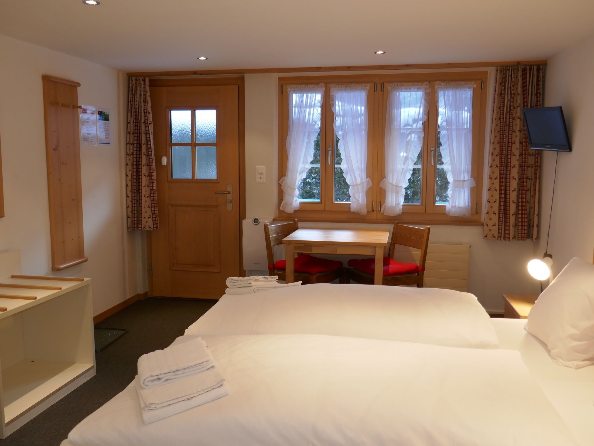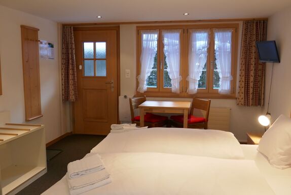 Schwendihus, 1-Zimmer-Wohnung 25 m2, im Erdgeschoss, Südlage. Zweckmässig und gemütlich eingerichtet: Wohn-/Schlafzimmer mit 1 Doppelbett (2 x 90 cm, Länge 200 cm), Kabel-TV (Flachbildschirm). Ausgang zum Gartensitzplatz, Richtung Süden. Kochnische (2 Kochplatten, Toaster, Wasserkocher, elektrische Kaffeemaschine). Dusche/WC. Schöne Sicht auf die Berge und Eiger. Zur Verfügung: Haartrockner. Internet (Wireless LAN, gratis). Parkplatz beim Haus. Bitte beachten: Wohnung auf Strassenseite. Maximal 1 Haustier/Hund erlaubt. Eigener Eingang, Feuerlöscher.
