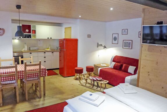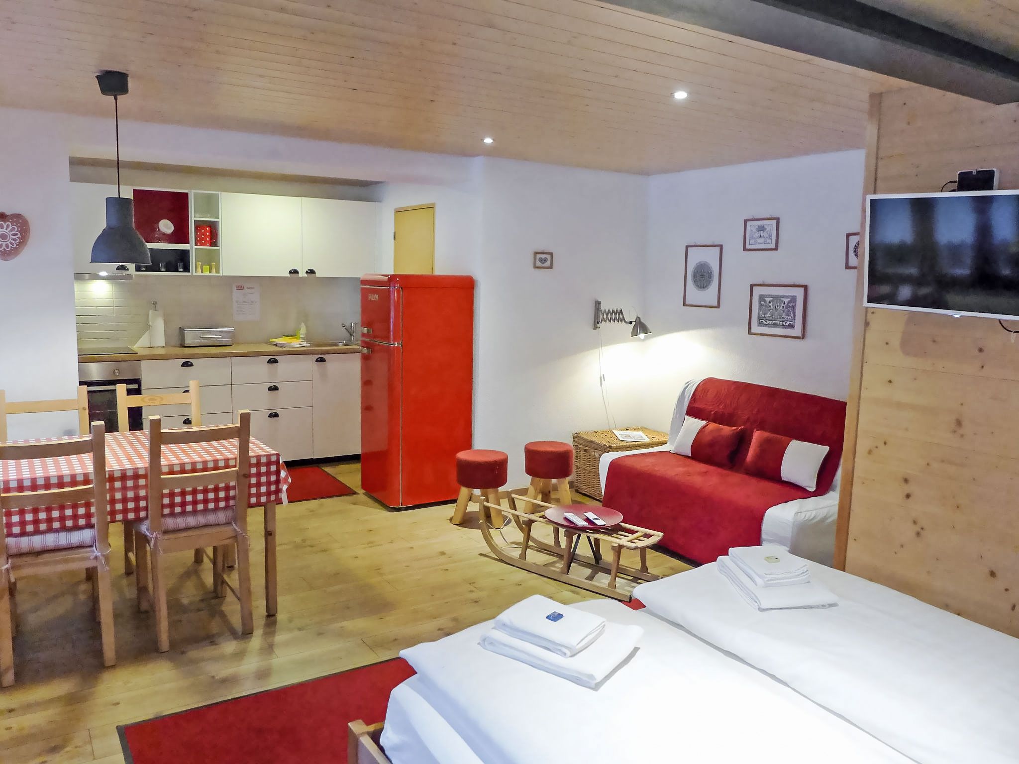1-Zimmer-Wohnung 30 m2, unteres Geschoss, Südlage. Renoviert im Jahre 2015, schön und gemütlich eingerichtet: Wohn-/Schlafzimmer mit 1 Doppeldiwanbett (160 cm, Länge 200 cm), 1 franz. Bett (160 cm, Länge 200 cm), Sat-TV (Flachbildschirm). Ausgang zum Gartensitzplatz, Richtung Süden. Offene Küche (Backofen, Geschirrspüler, 4 Glaskeramikplatten, Toaster, Wasserkocher, elektrische Kaffeemaschine, Kapseln für die Kaffeemaschine (Nespresso) extra, Racletteofen, Fondue Set (Käse)). Ausgang zum Gartensitzplatz. Dusche/WC. E-Heizung. Parkettboden. Gartensitzplatz, Südlage. Terrassenmöbel. Herrliche Sicht auf die Berge und Eigernordwand. Zur Verfügung: Kinderhochstuhl, Babybett bis 2 Jahre, Haartrockner. Internet (Wireless LAN, gratis). Parkplatz beim Haus. Bitte beachten: geeignet für Familien. Nichtraucher-Unterkunft. Eigener Eingang, Feuerlöscher.