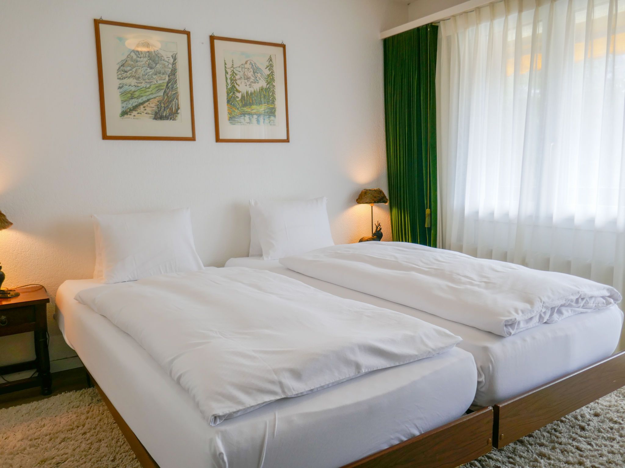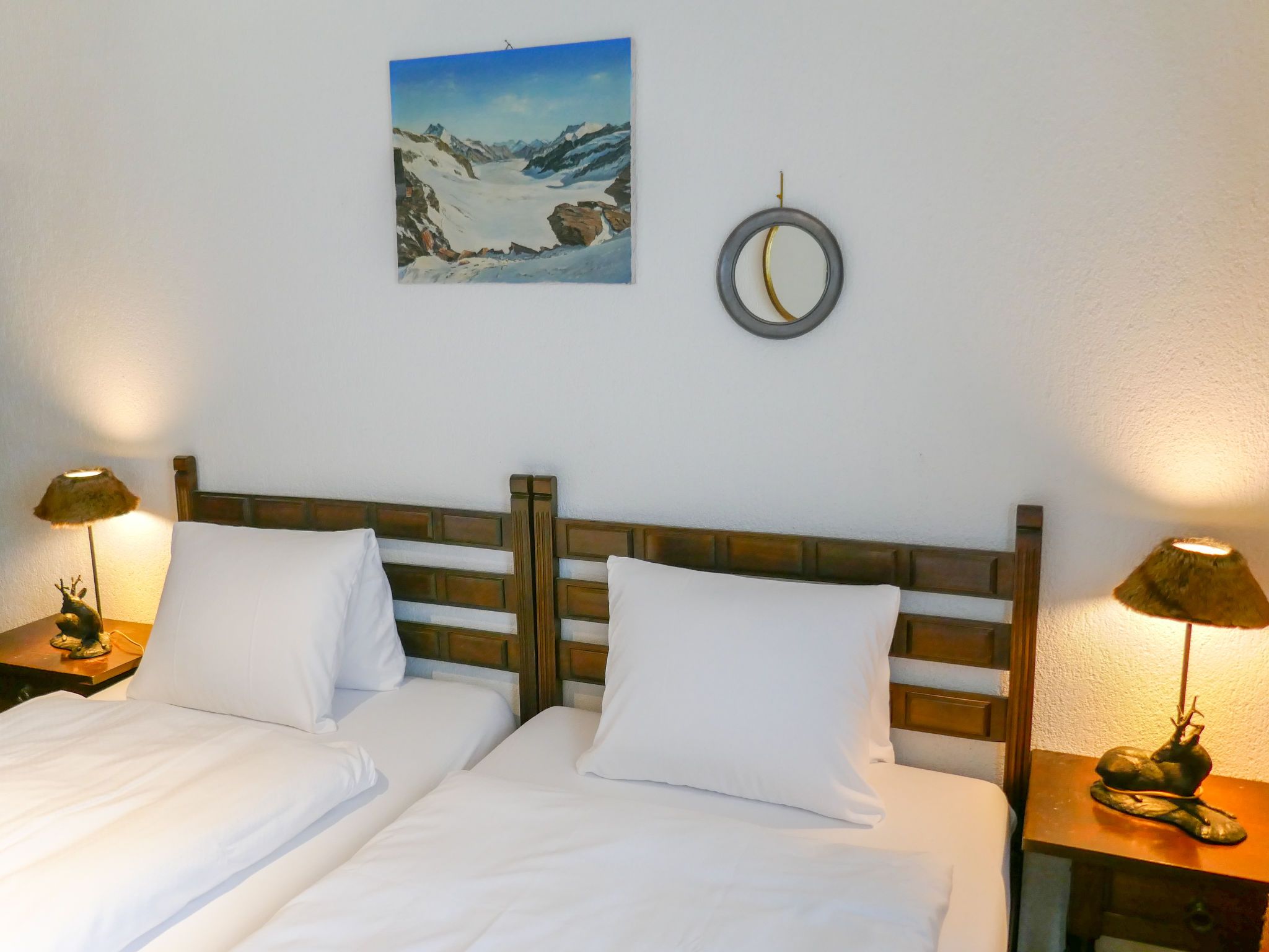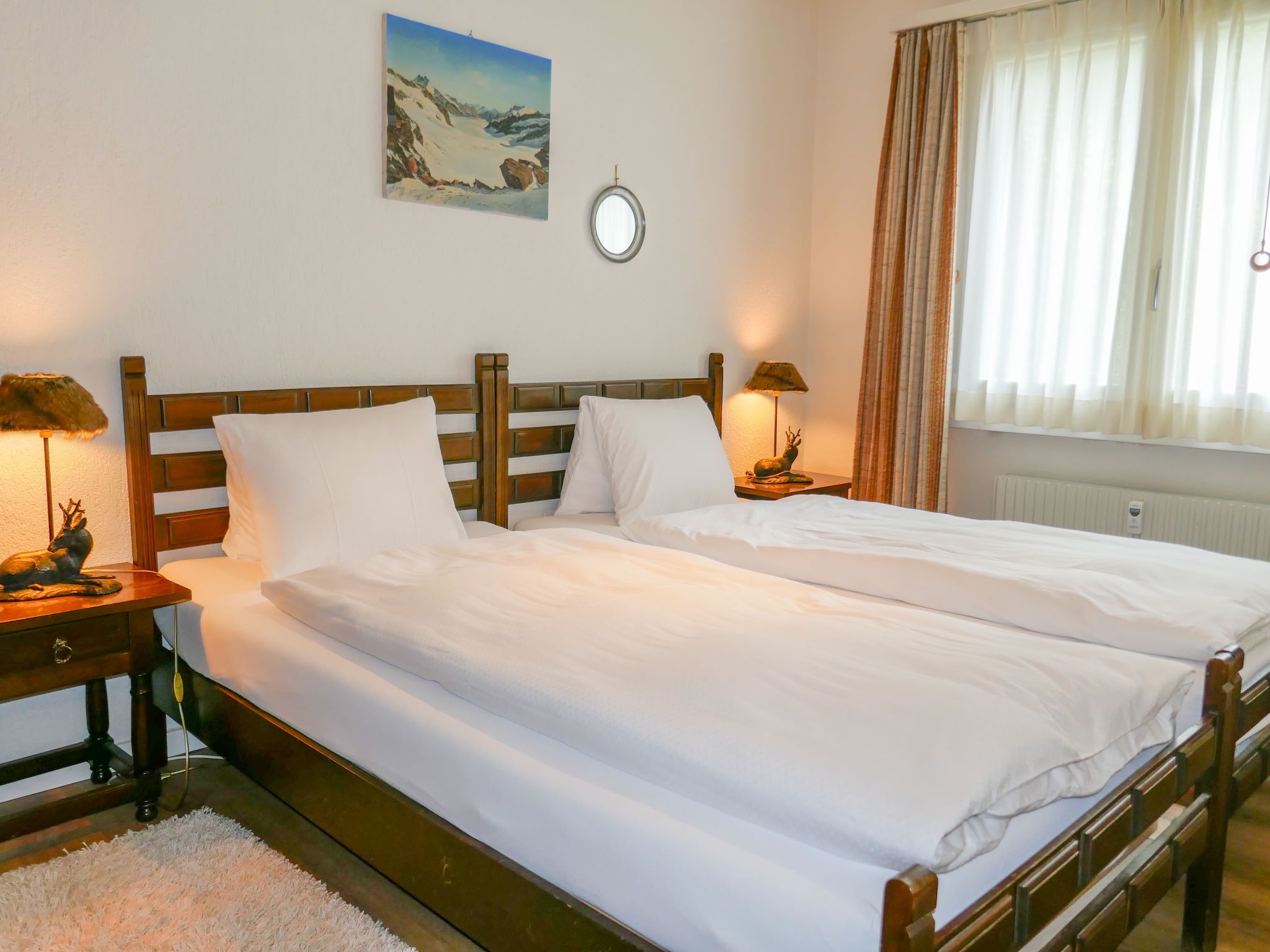 4-Zimmer-Wohnung 100 m2, im erhöhten Erdgeschoss, Südlage. Komfortabel und gemütlich eingerichtet: Wohn-/Esszimmer mit Sat-TV (Flachbildschirm). Ausgang zum Balkon. 2 Zimmer, jedes Zimmer mit 2 Betten (90 cm, Länge 200 cm). 1 Zimmer mit 1 Bett (90 cm, Länge 200 cm). Offene Küche (Backofen, Geschirrspüler, 4 Glaskeramikplatten, Wasserkocher, Mikrowelle, elektrische Kaffeemaschine, Kapseln für die Kaffeemaschine (Nespresso) extra, Racletteofen, Fondue Set (Chinoise, Käse)). Bad/WC. Parkettboden. Grosser Balkon, Südlage und Westlage. Balkonmöbel. Herrliche Sicht auf die Berge und Eigernordwand. Zur Verfügung: Haartrockner. Internet (Wireless LAN, gratis). Parkplatz beim Haus. Bitte beachten: Nichtraucher-Unterkunft. Feuerlöscher.