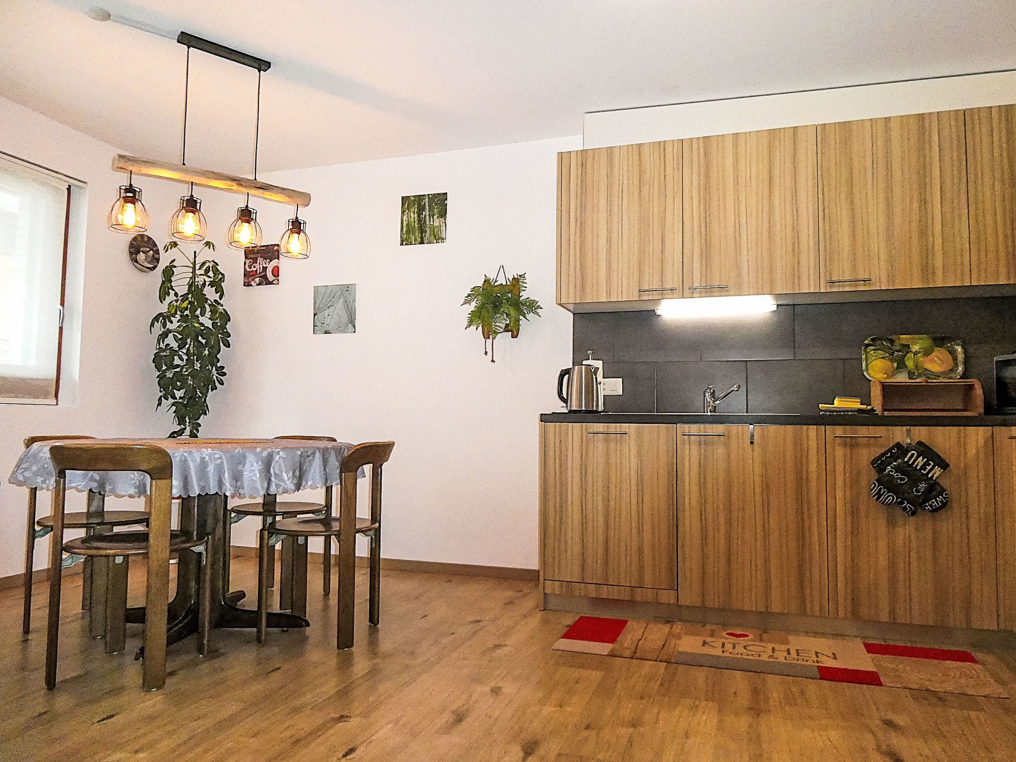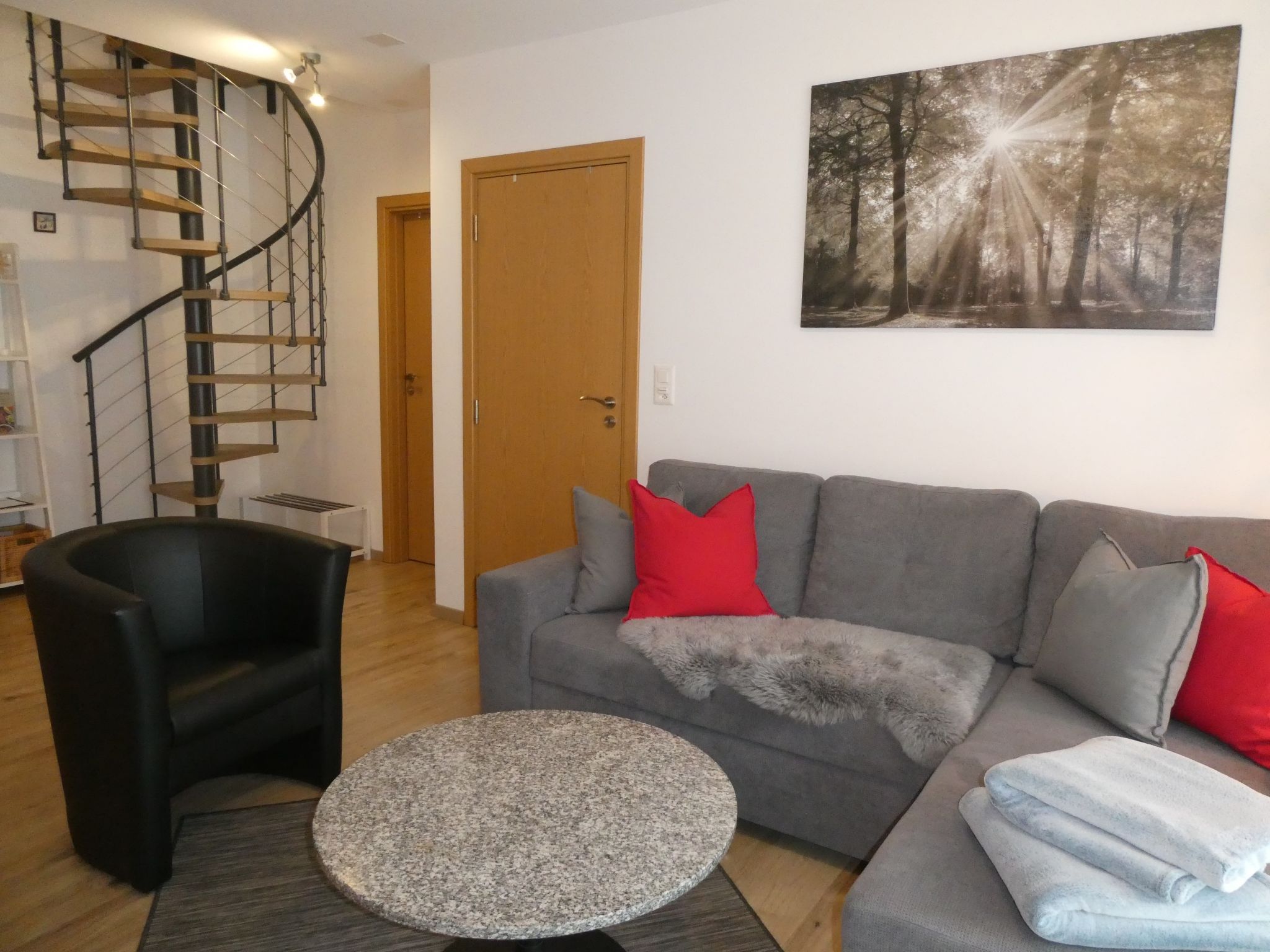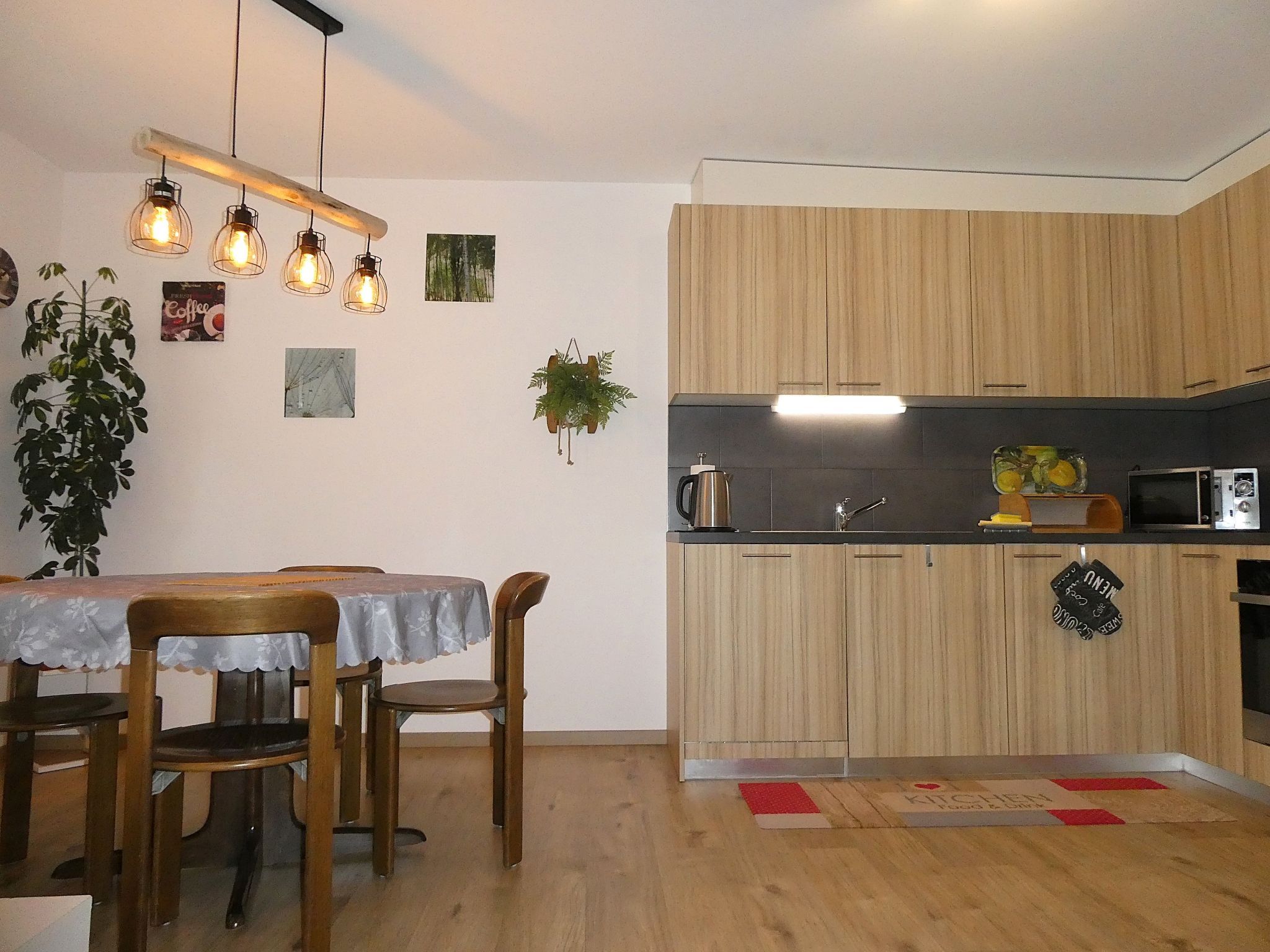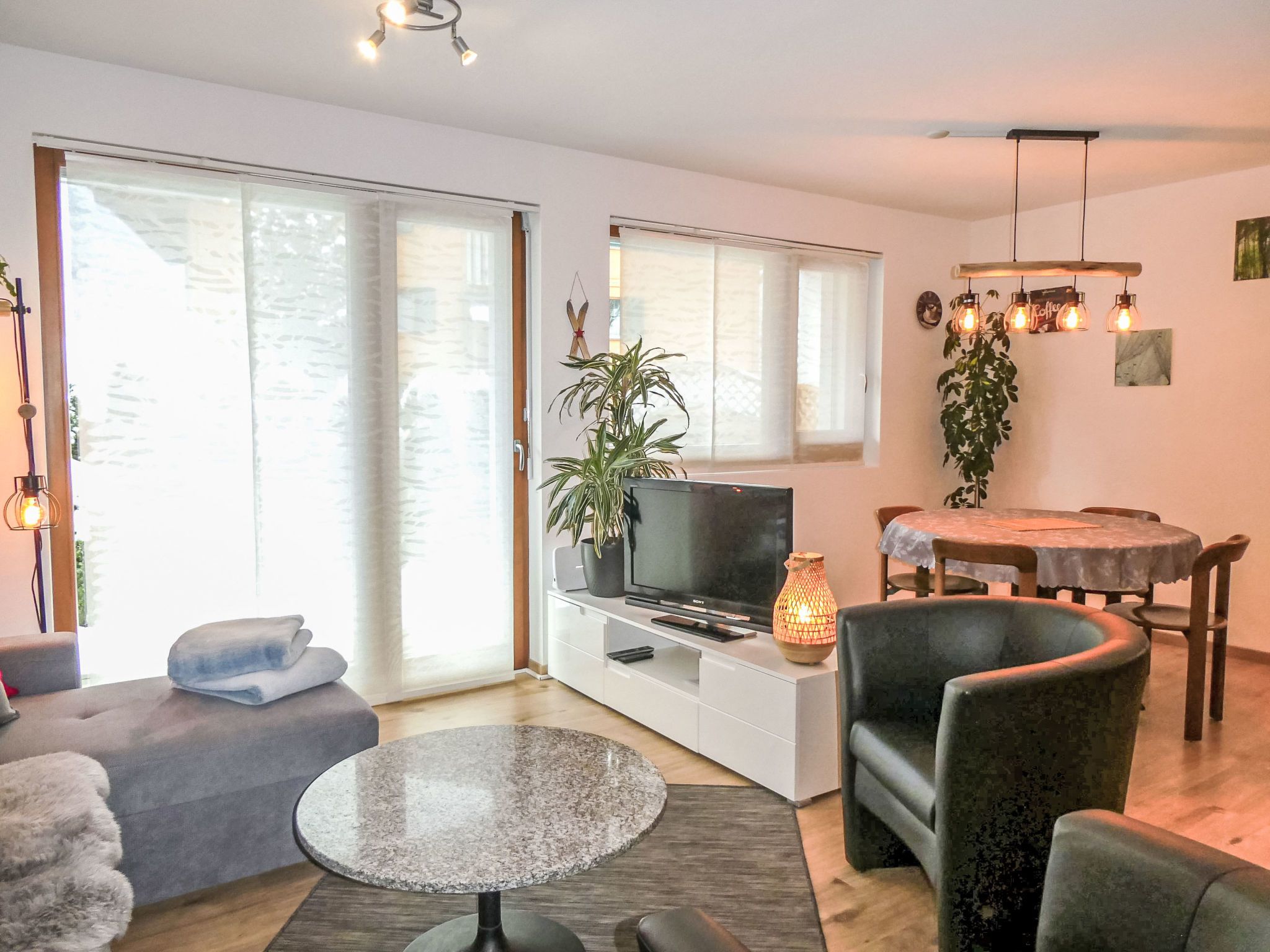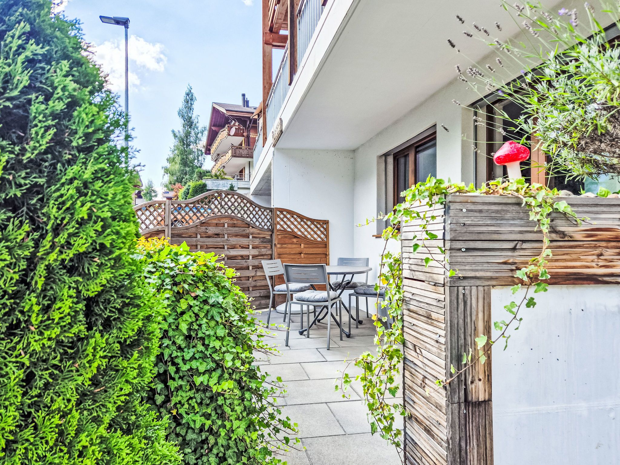 3-Zimmer-Wohnung 60 m2 auf 2 Stockwerken, im Erdgeschoss, Südlage. Hell, modern und gemütlich eingerichtet: Wohn-/Esszimmer mit Digital-TV. Ausgang zum Gartensitzplatz, Richtung Süden. 1 Zimmer mit 1 Doppelbett (2 x 90 cm, Länge 200 cm). Offene Küche (Backofen, Geschirrspüler, 4 Glaskeramikplatten, Toaster, Wasserkocher, Mikrowelle, elektrische Kaffeemaschine, Kapseln für die Kaffeemaschine (Nespresso) extra, Racletteofen, Fondue Set (Käse)). Dusche/WC. Fussbodenheizung. Obergeschoss: (Wendeltreppe) 1 Zimmer mit 2 Betten (90 cm, Länge 200 cm). Parkettboden, Natursteinboden. Gartensitzplatz, Südlage. Terrassenmöbel, Liegestühle. Herrliche Sicht auf die Berge und Eigernordwand. Zur Verfügung: Waschmaschine, Wäschetrockner, Kinderhochstuhl, Babybett, Haartrockner. Internet (Wireless LAN, gratis). Parkplatz (überdacht). Bitte beachten: Nichtraucher-Unterkunft. Feuerlöscher.