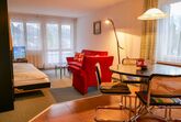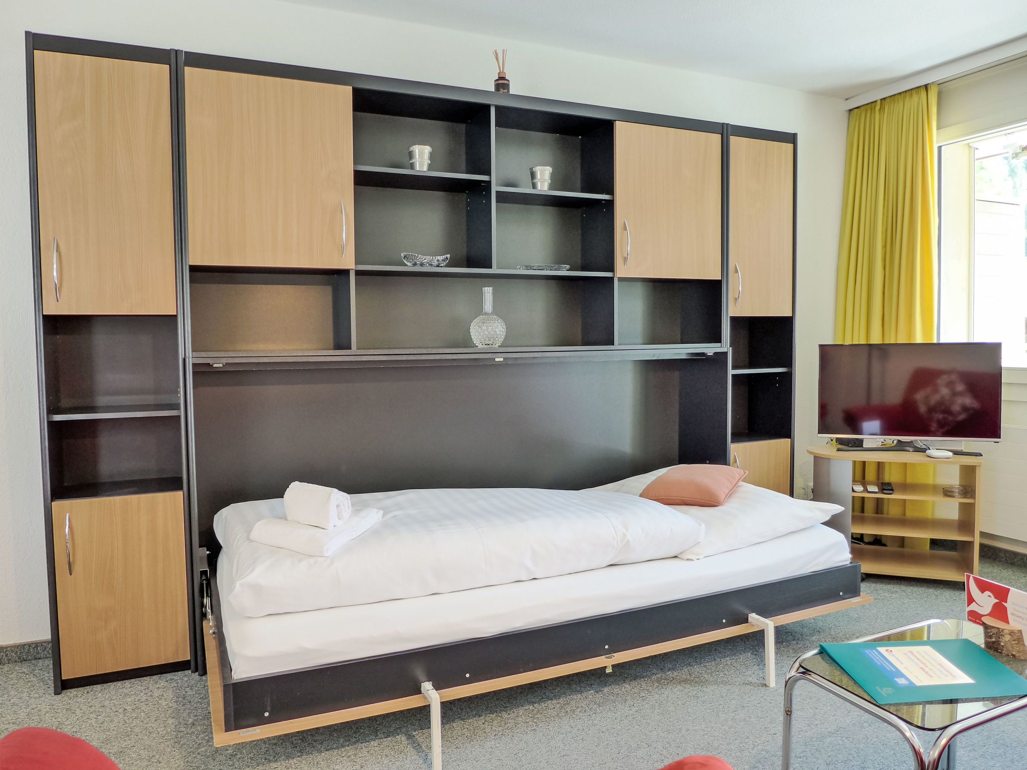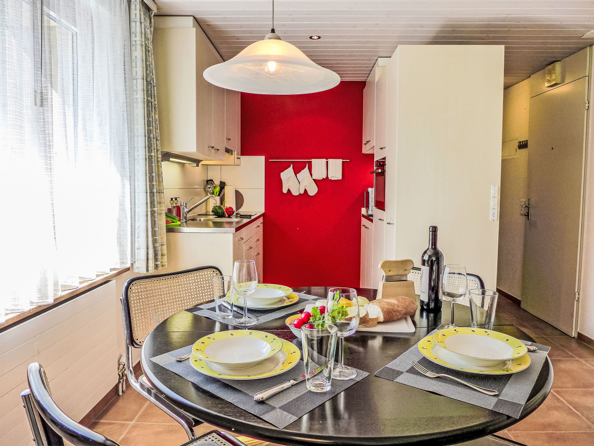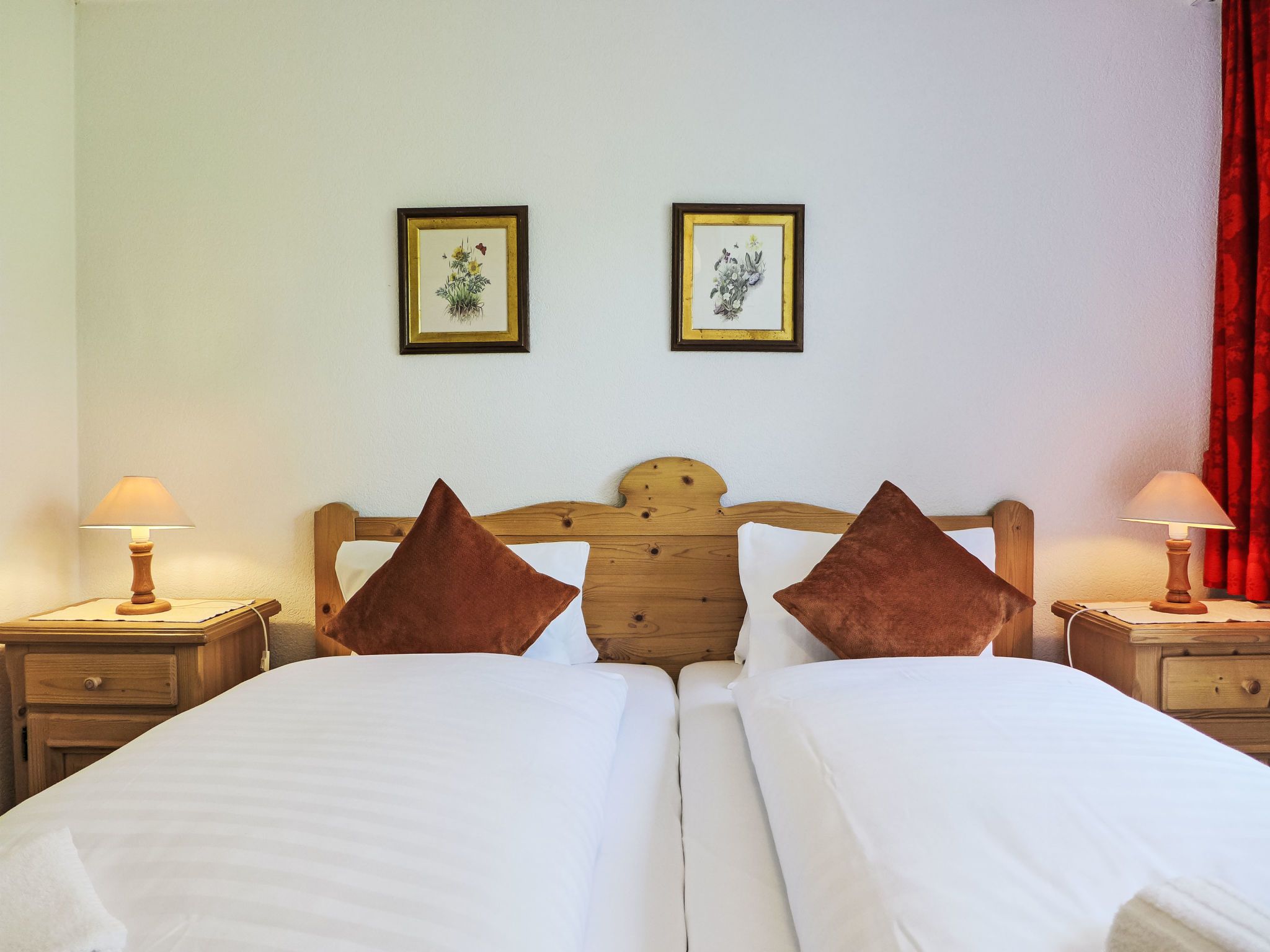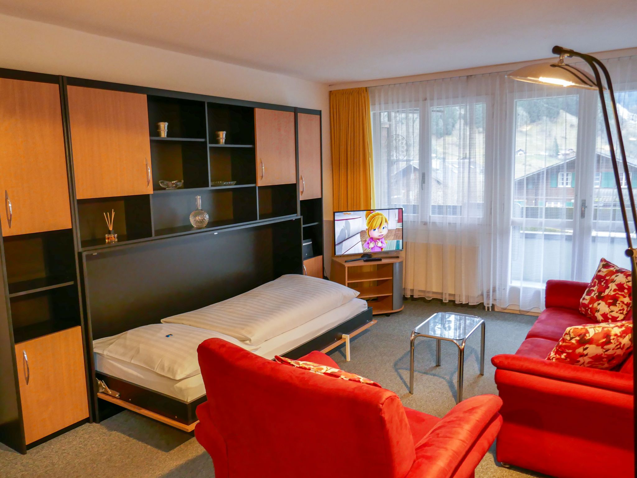 2-Zimmer-Wohnung 40 m2 im 1. Stock, Südlage. Hell, zweckmässig und gemütlich eingerichtet: offenes Wohn-/Schlafzimmer mit 1 Wandklappbett (90 cm, Länge 200 cm), Esstisch und Sat-TV. Ausgang zum Balkon. 1 Zimmer mit 1 Doppelbett (2 x 90 cm, Länge 200 cm). Offene Küche (Backofen, Geschirrspüler, 2 Glaskeramikplatten, Toaster, Wasserkocher, Mikrowelle, elektrische Kaffeemaschine, Racletteofen, Fondue Set (Käse)). Bad/WC. Teppichboden. Balkon, Südlage. Balkonmöbel. Herrliche Sicht auf die Berge, die Landschaft und Eigernordwand. Zur Verfügung: Haartrockner. Internet (WLAN, gratis). Parkplatz beim Haus. Maximal 1 Haustier/Hund erlaubt.