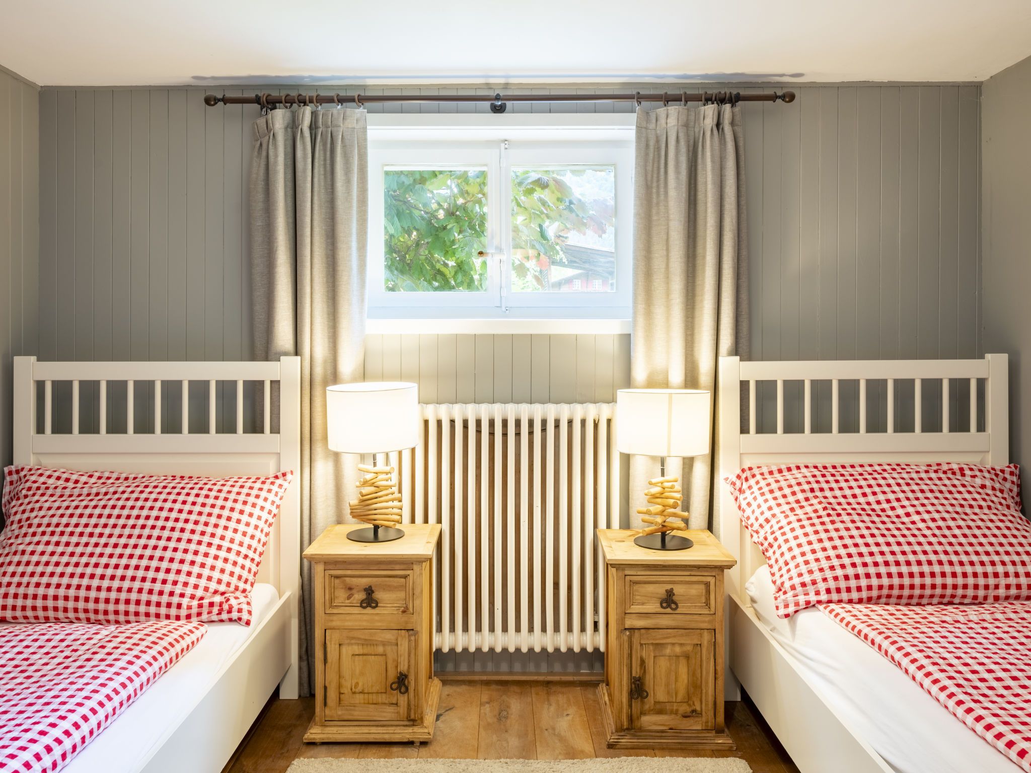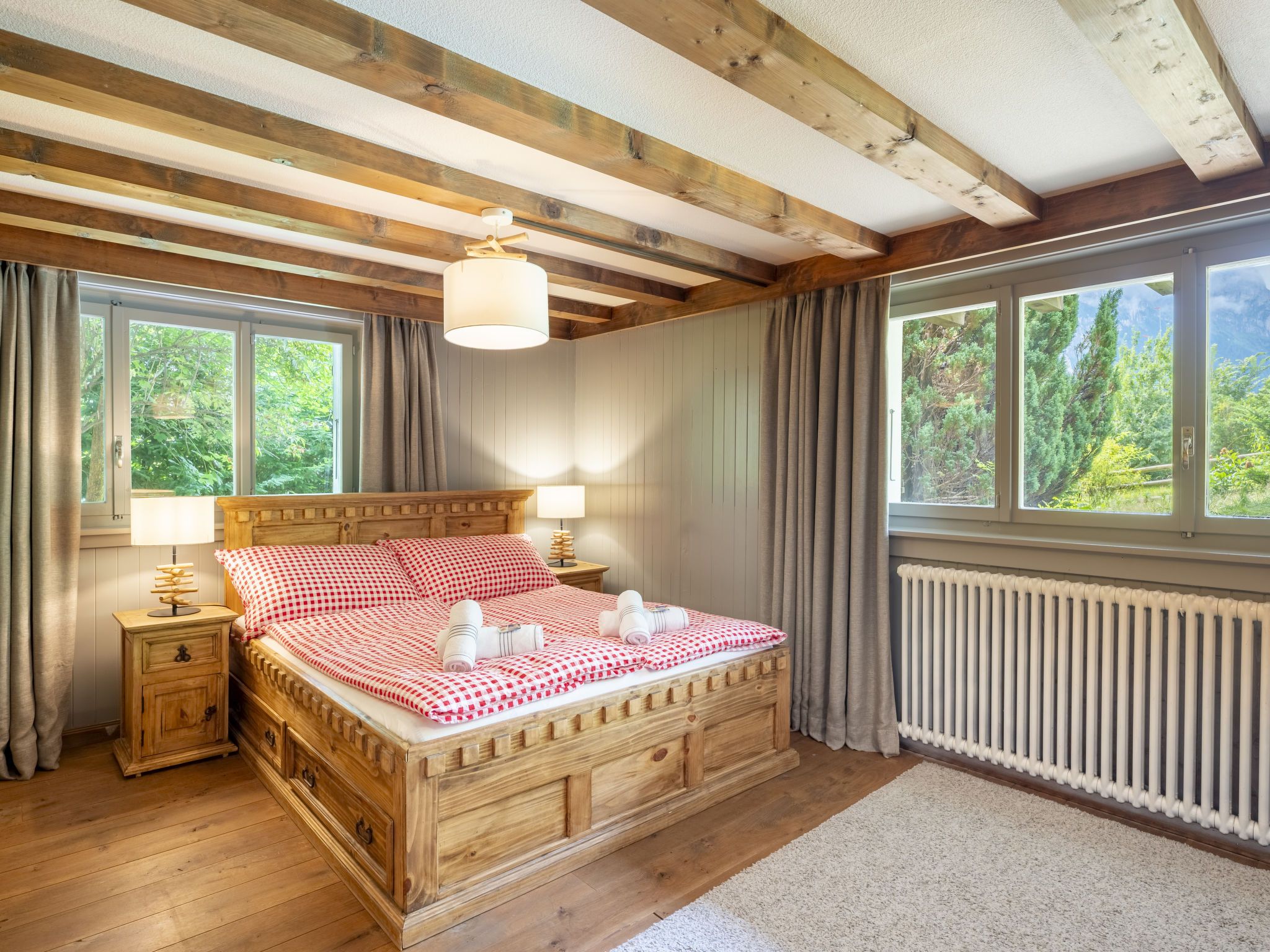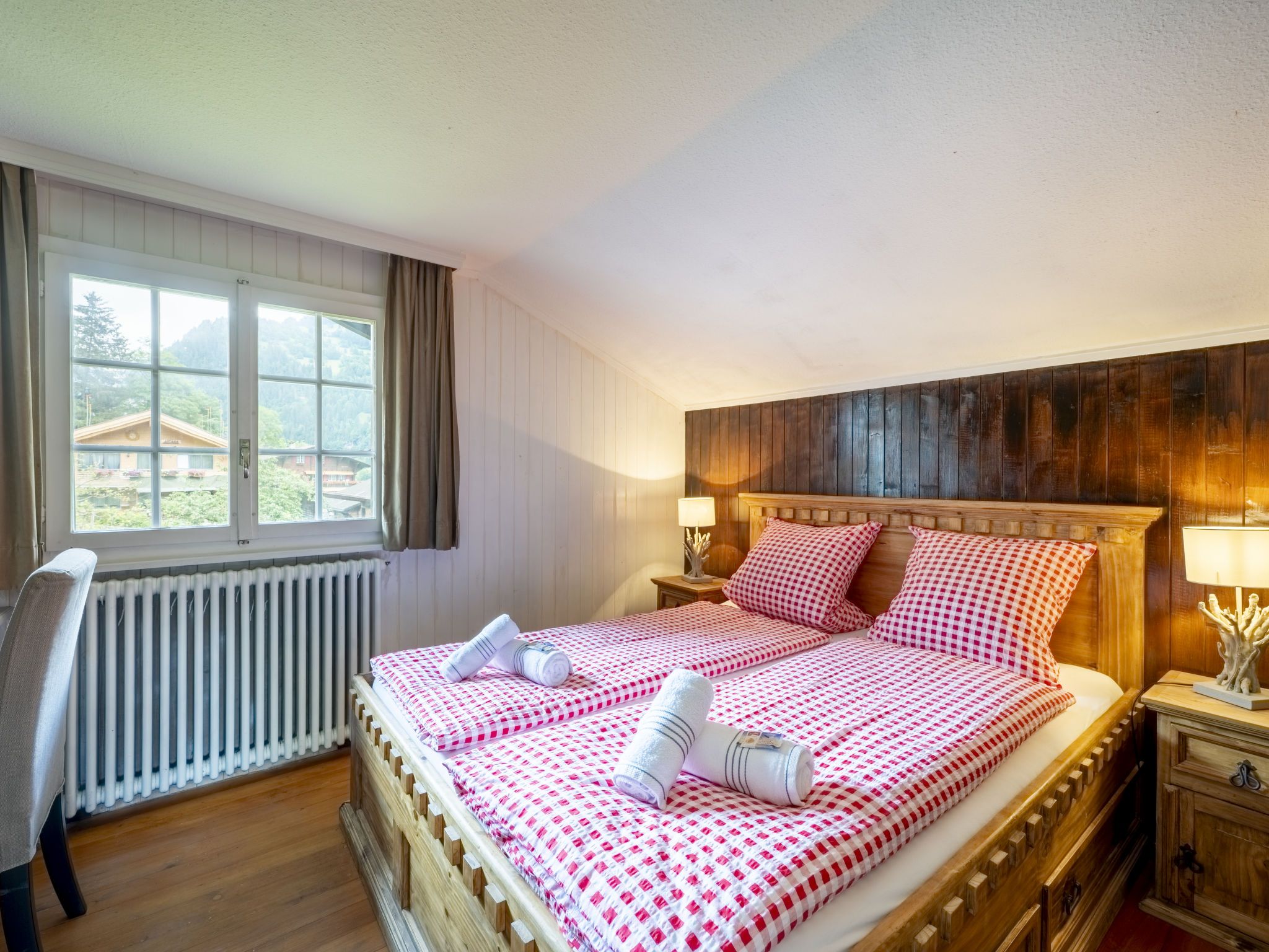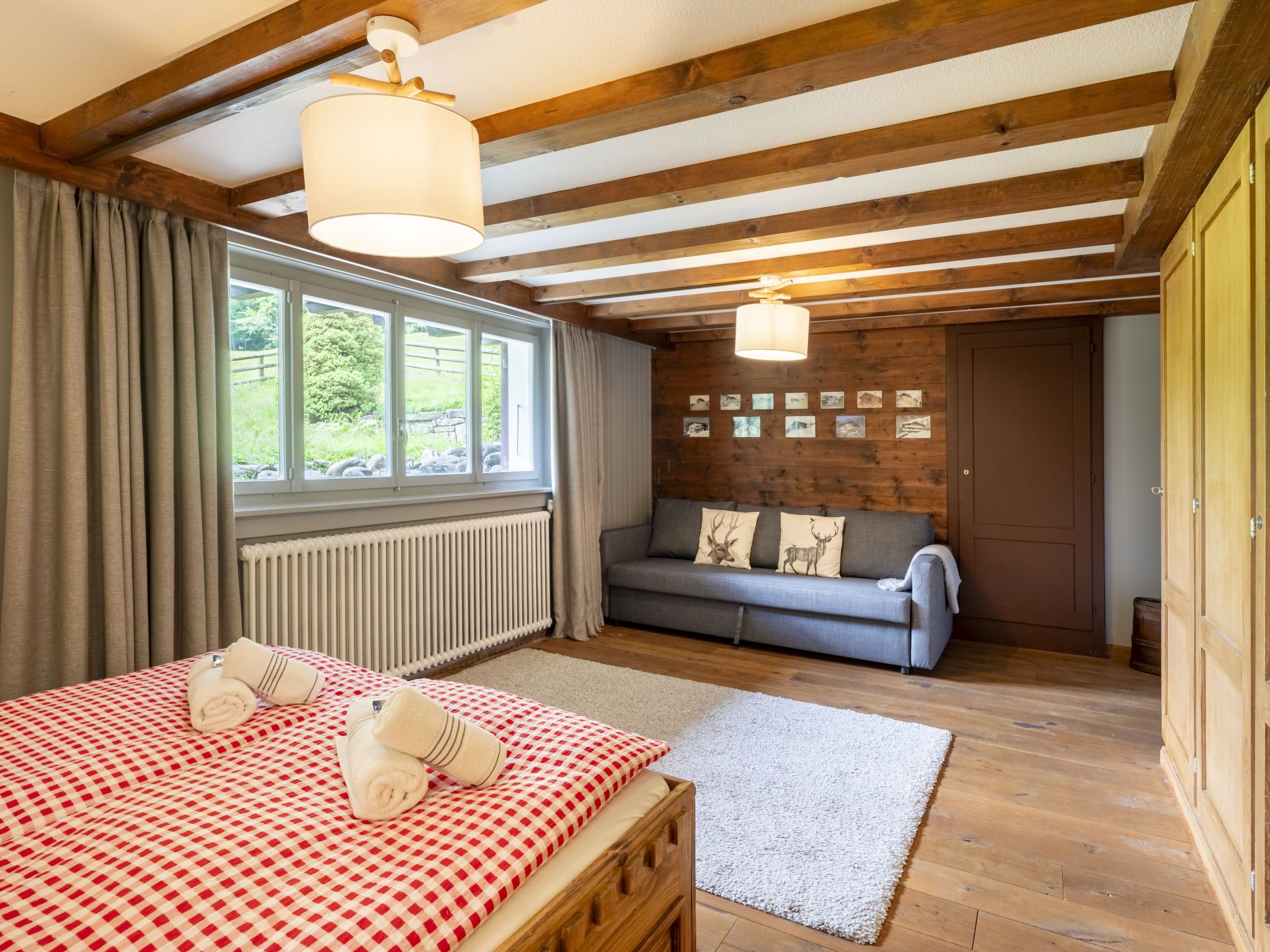 Chalet am Schärm, 7-Zimmer-Chalet 200 m2 auf 3 Stockwerken. Geräumig und hell, teilweise renoviert im Jahre 2022, geschmackvoll und gemütlich eingerichtet: offenes Wohn-/Esszimmer 35 m2 mit offenem Kamin, Kabel-TV, Digital-TV, Internationale TV-Sender und Flachbildschirm. Ausgang zum Balkon. 1 Zimmer 20 m2 mit 1 franz. Bett (160 cm, Länge 200 cm). Offene Küche 12 m2 (Backofen, Geschirrspüler, 5 Glaskeramikplatten, Mikrowelle, Tiefkühler, elektrische Kaffeemaschine, Racletteofen, Fondue Set (Käse)). Dusche/WC. Unteres Geschoss: 1 Zimmer 28 m2 mit 1 Diwanbett (130 cm, Länge 200 cm), 1 franz. Bett (160 cm, Länge 200 cm). 1 Zimmer 15 m2 mit 2 Betten (90 cm, Länge 200 cm). Ausgang zum Garten. Bad/WC, Doppelwaschbecken. Obergeschoss: 3 abgeschrägte Zimmer, jedes Zimmer mit 1 franz. Bett (160 cm, Länge 200 cm). Dusche/WC. Balkon 35 m2, Gartensitzplatz. Balkonmöbel, Liegestühle (6), Abstellkammer. Herrliche Panoramasicht auf die Berge und die Landschaft. Zur Verfügung: Bügeleisen, Kinderhochstuhl, Babybett bis 4 Jahre (extra), Haartrockner. Internet (Wireless LAN, gratis). Bitte beachten: Nichtraucher-Haus. Rauchmelder, Feuerlöscher.