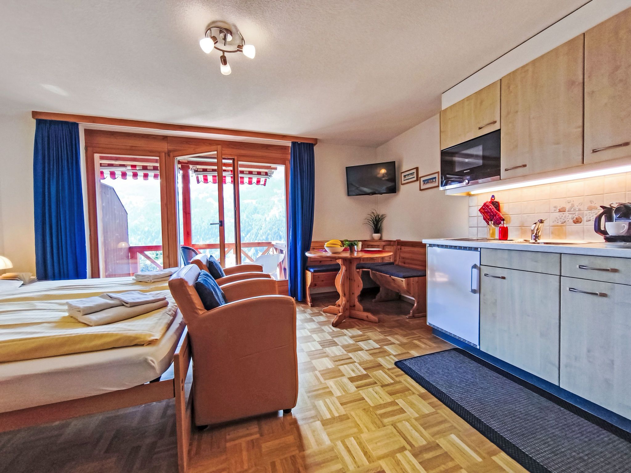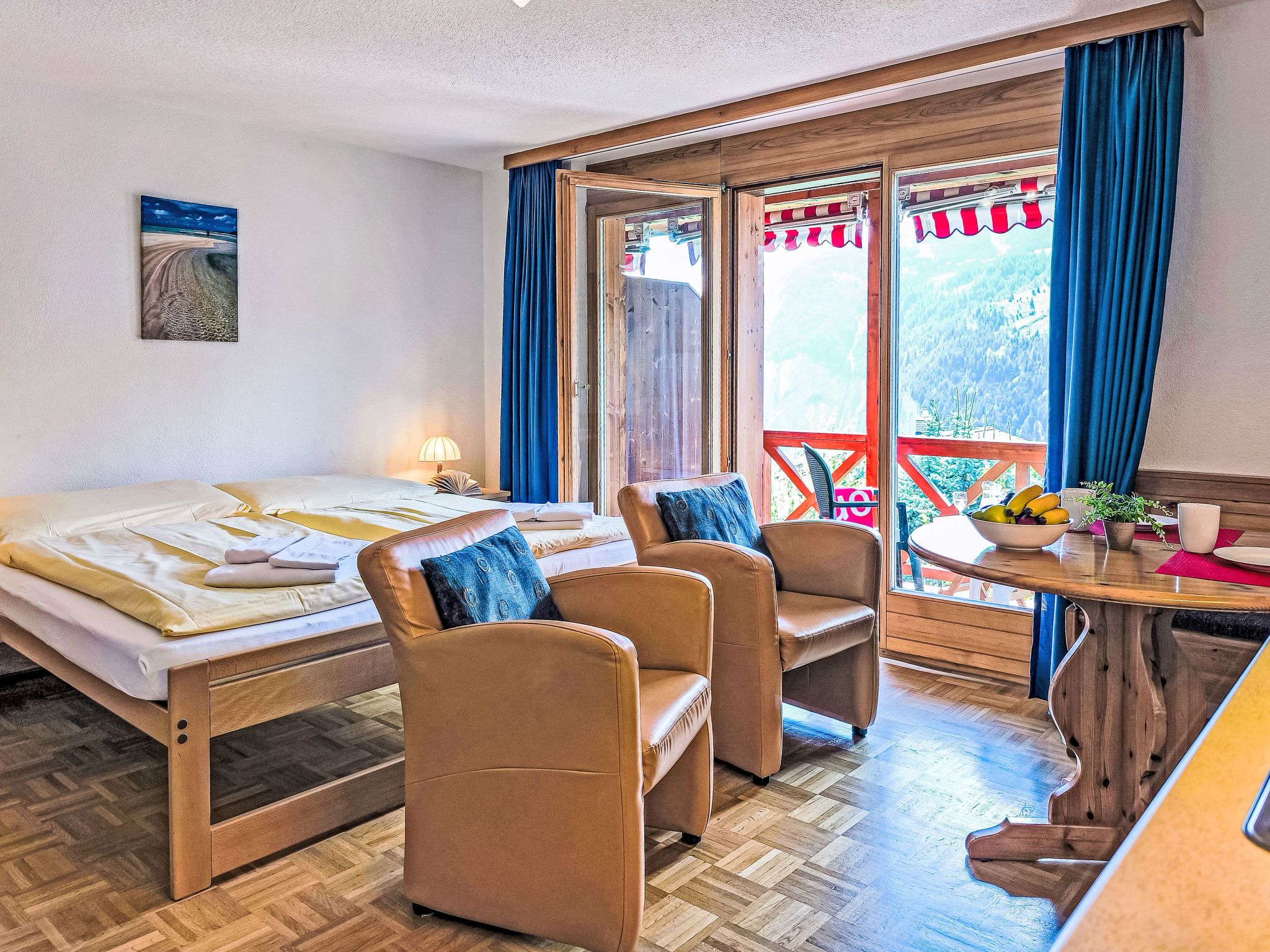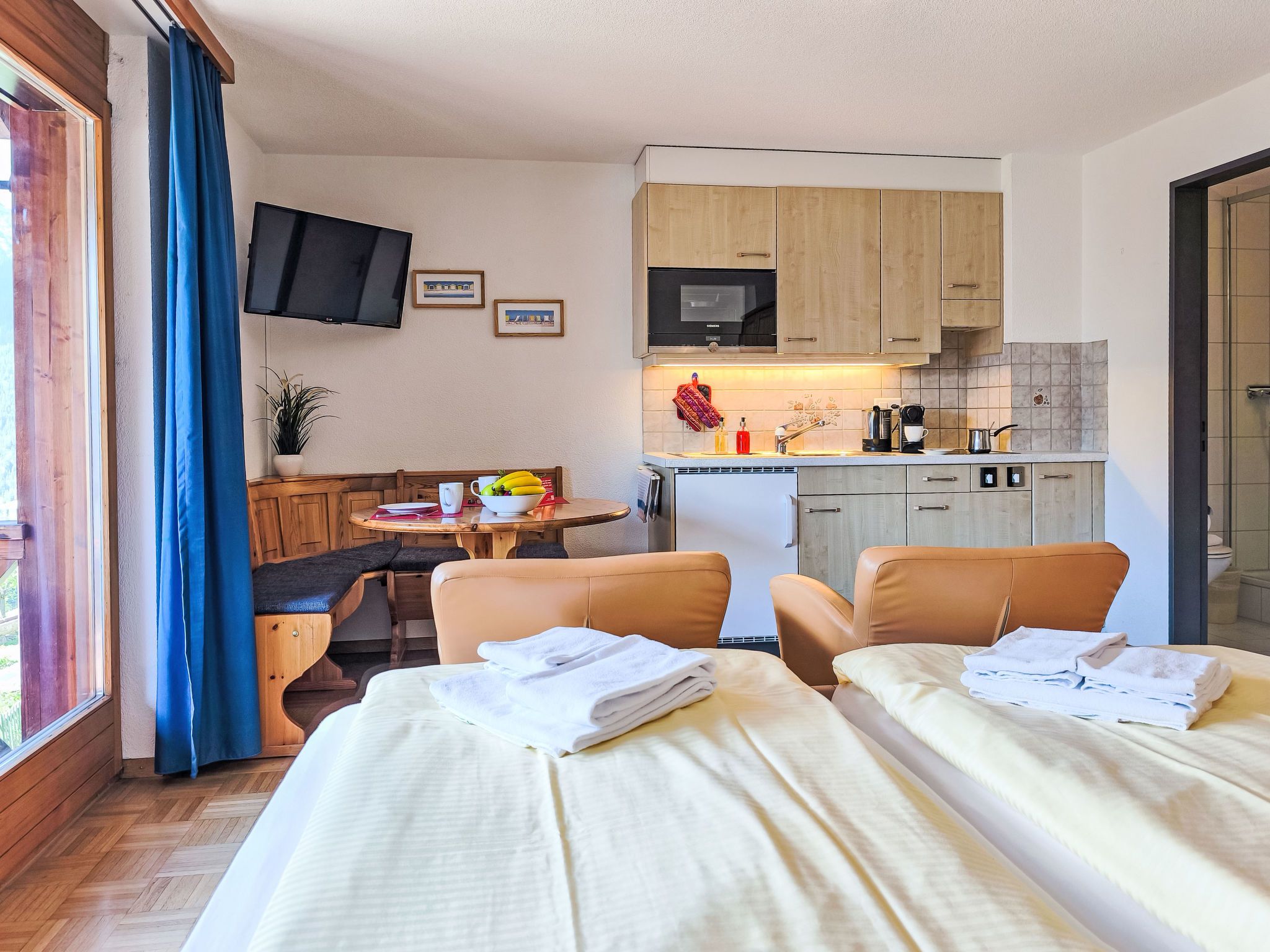 Rose Studio Y, 1-Zimmer-Wohnung 20 m2 im 2. Stock. Schön eingerichtet: Wohn-/Esszimmer mit 1 Doppelbett und Kabel-TV (Flachbildschirm). Ausgang zum Balkon. Kochnische (2 Glaskeramikplatten, Toaster, Wasserkocher, elektrische Kaffeemaschine, Kapseln für die Kaffeemaschine (Nespresso) extra, Kombinationsmikrowelle). Dusche/WC. Fussbodenheizung. Balkon, Südwestlage. Terrassenmöbel. Sehr schöne Panoramasicht auf die Berge und das Tal. Zur Verfügung: Haartrockner. Internet (WLAN, gratis). Maximal 1 Haustier/Hund erlaubt.
