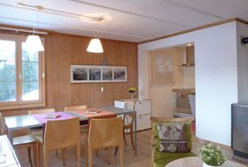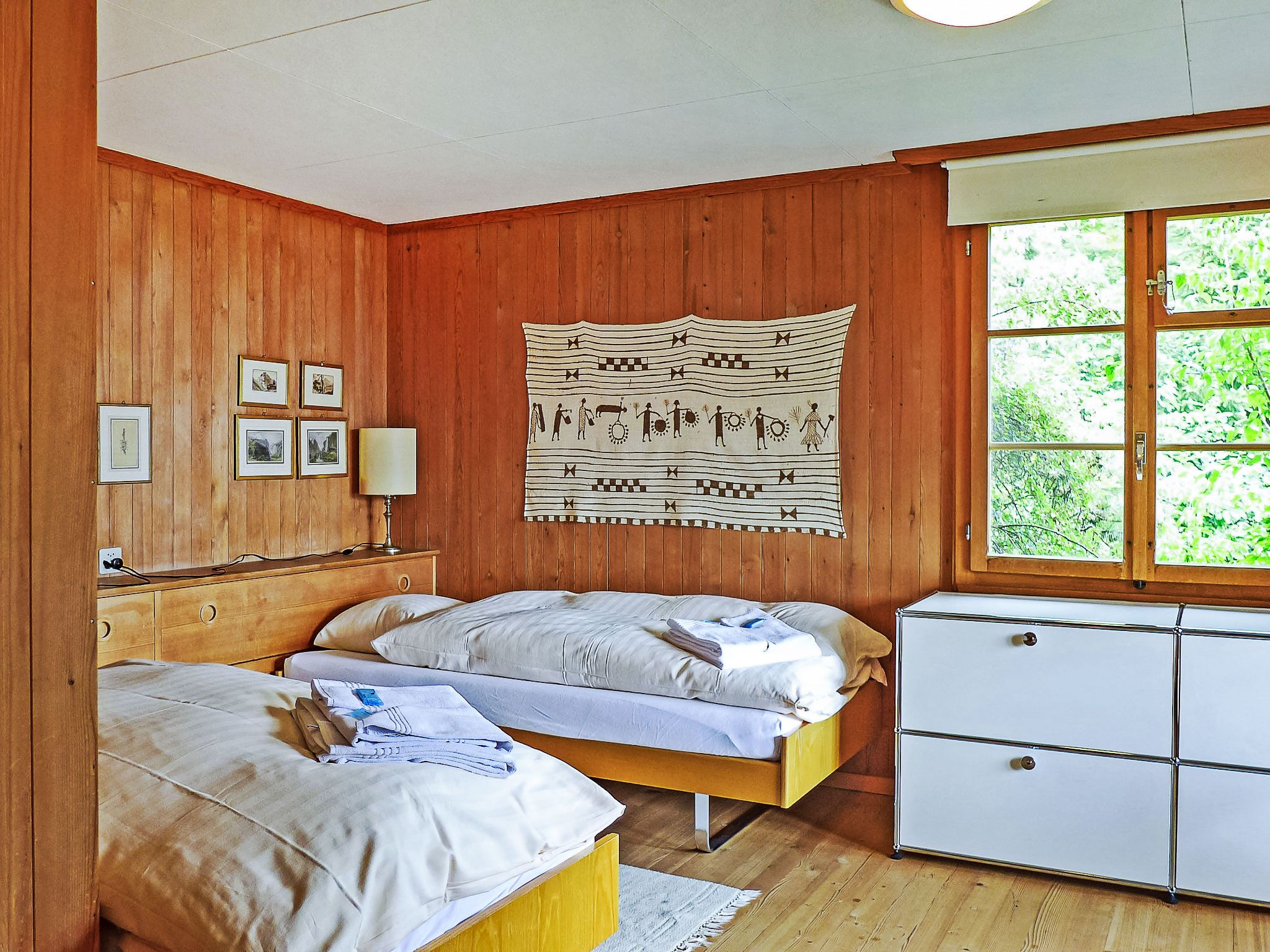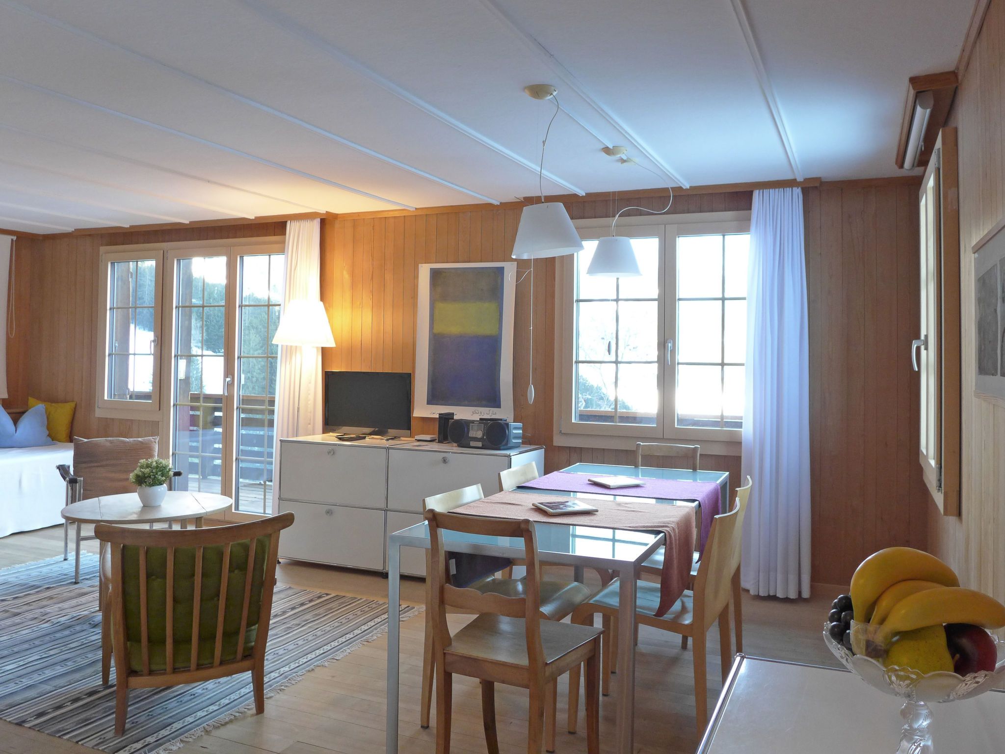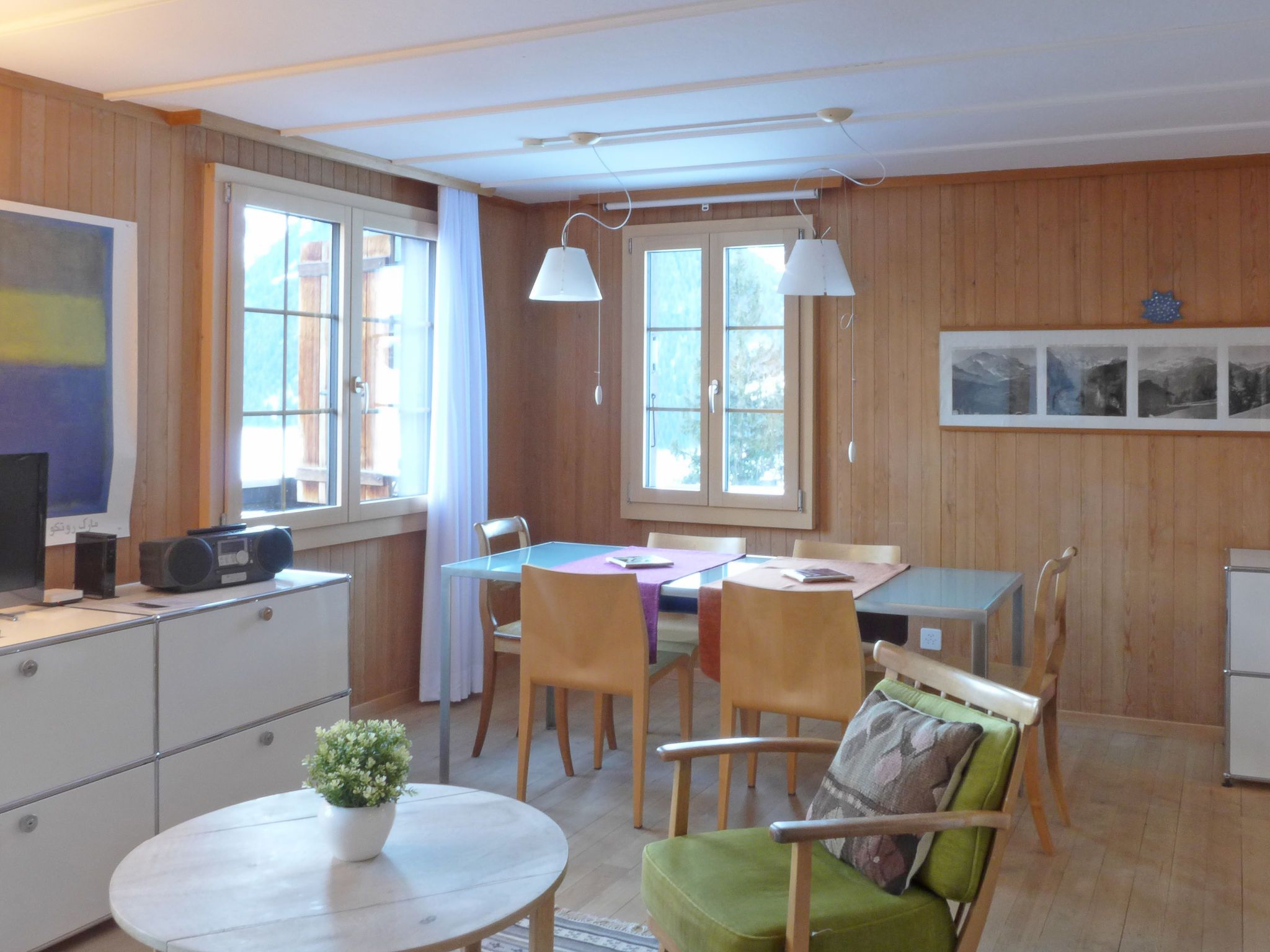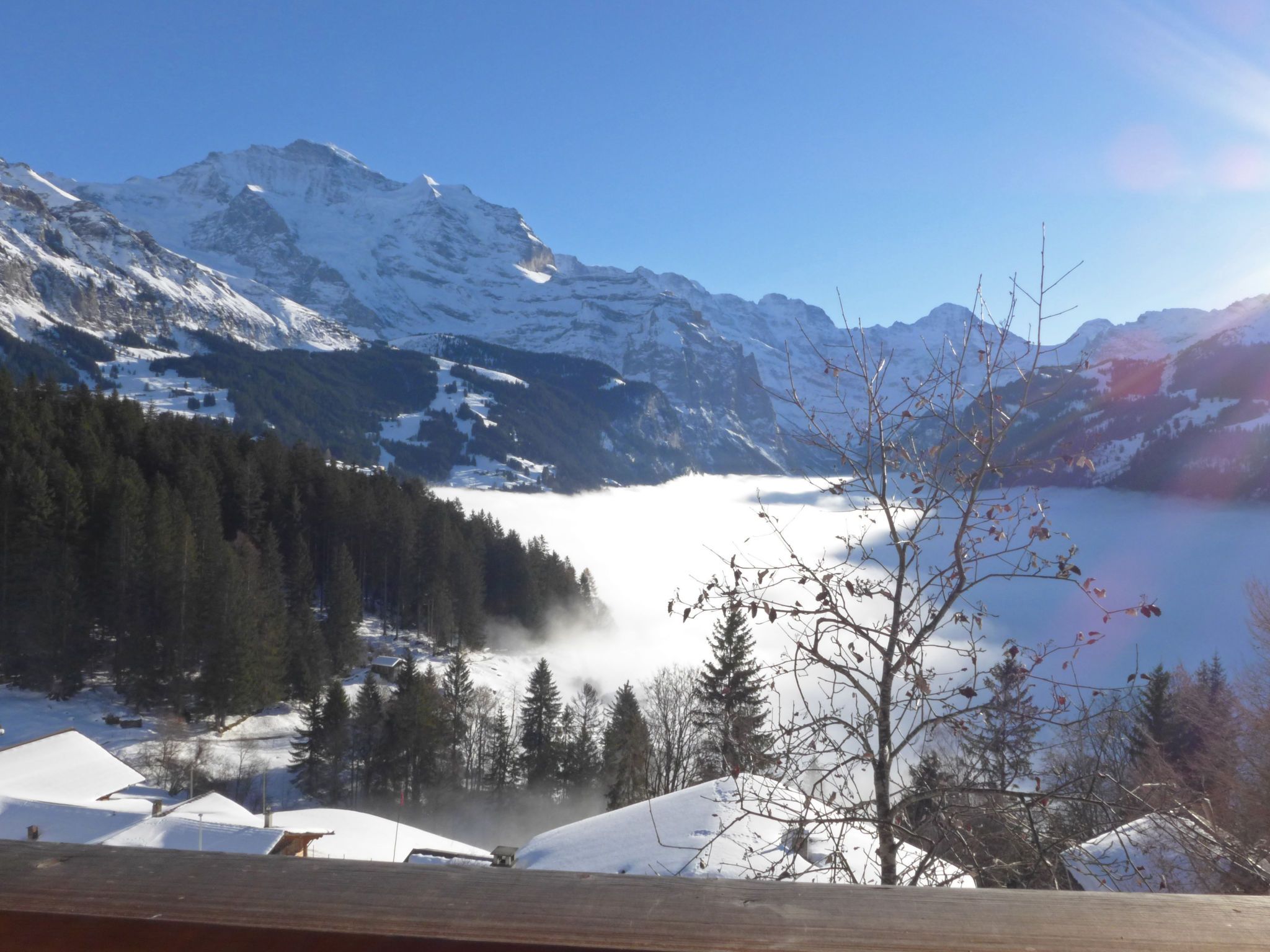 Jungfrau a d Ledi, 3-Zimmer-Chalet 75 m2. Geräumig, teilweise renoviert, modern und geschmackvoll eingerichtet: Wohn-/Esszimmer 30 m2 mit 1 Bett (90 cm, Länge 190 cm), Esstisch, Kabel-TV und Internationale TV-Sender (Flachbildschirm), Radio und CD. Ausgang zum Balkon, Richtung Süden. 1 Zimmer 14 m2 mit 2 Betten (90 cm, Länge 190 cm). Offene Küche (Backofen, Geschirrspüler, 4 Glaskeramikplatten, Toaster, Wasserkocher, elektrische Kaffeemaschine, Kapseln für die Kaffeemaschine (Nespresso) extra). Dusche/WC. Ölheizung. Unteres Geschoss: (Aussentreppe) 25 m2, 1 Zimmer mit 2 Betten (90 cm, Länge 200 cm). Ausgang zum Gartensitzplatz. Sep. WC. Balkonmöbel, Liegestühle (2). Herrliche Panoramasicht auf die Berge und das Tal. Zur Verfügung: Waschmaschine, Wäschetrockner (extra). Internet (Wireless LAN, gratis). Bitte beachten: ein Doppelzimmer liegt außerhalb der Wohnung. Nichtraucher-Haus. Maximal 1 Haustier/Hund erlaubt. Keine interne Verbindung zwischen den Etagen.