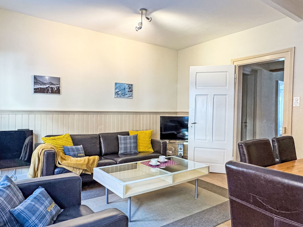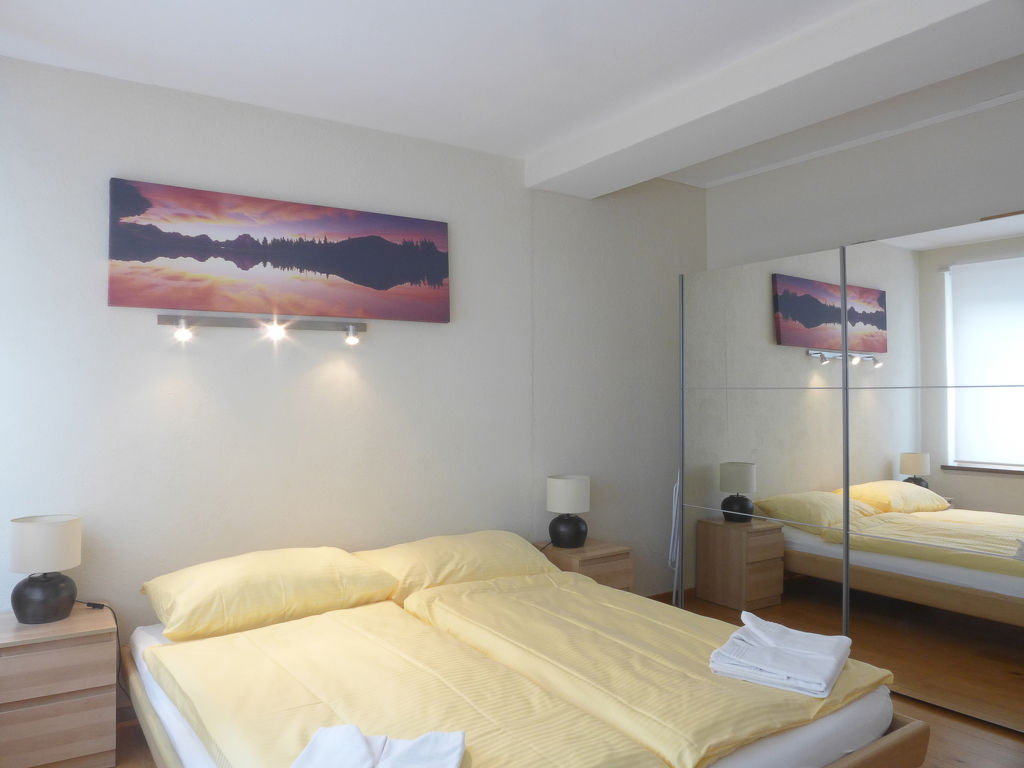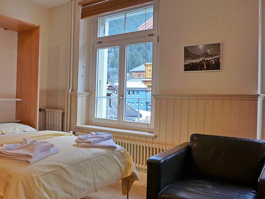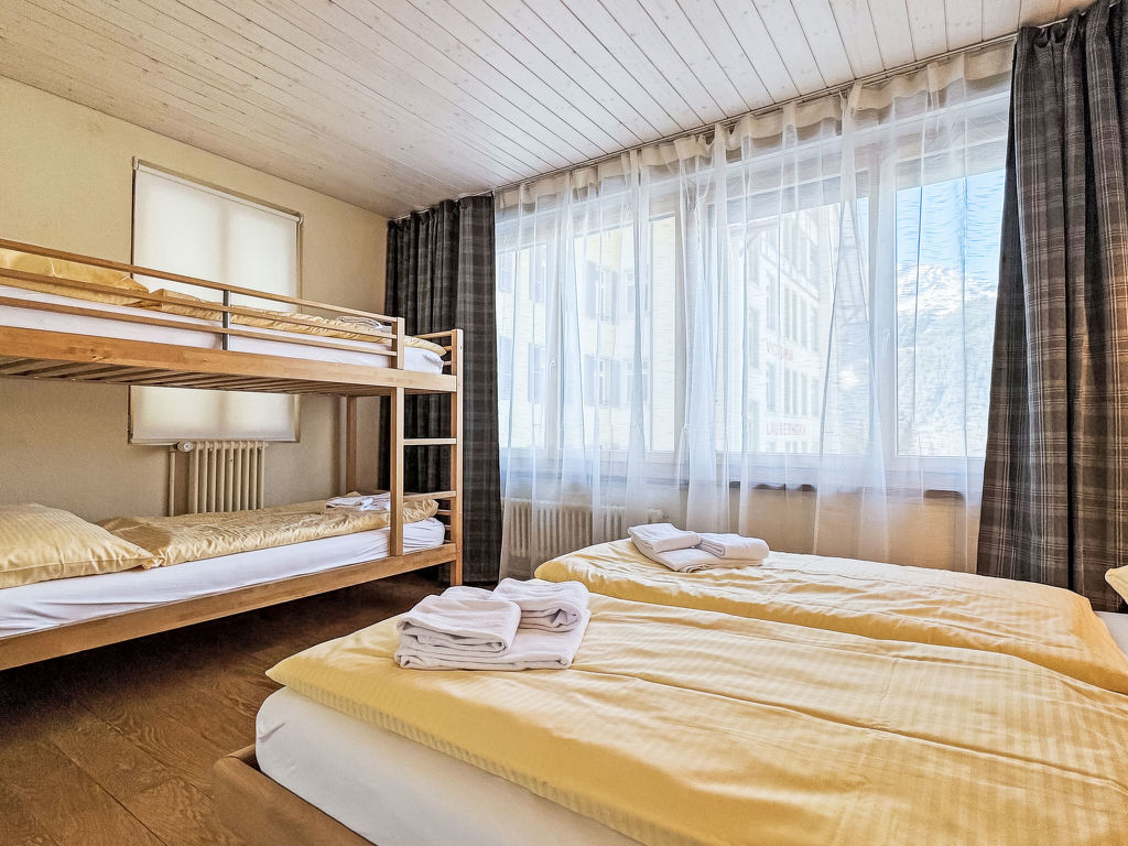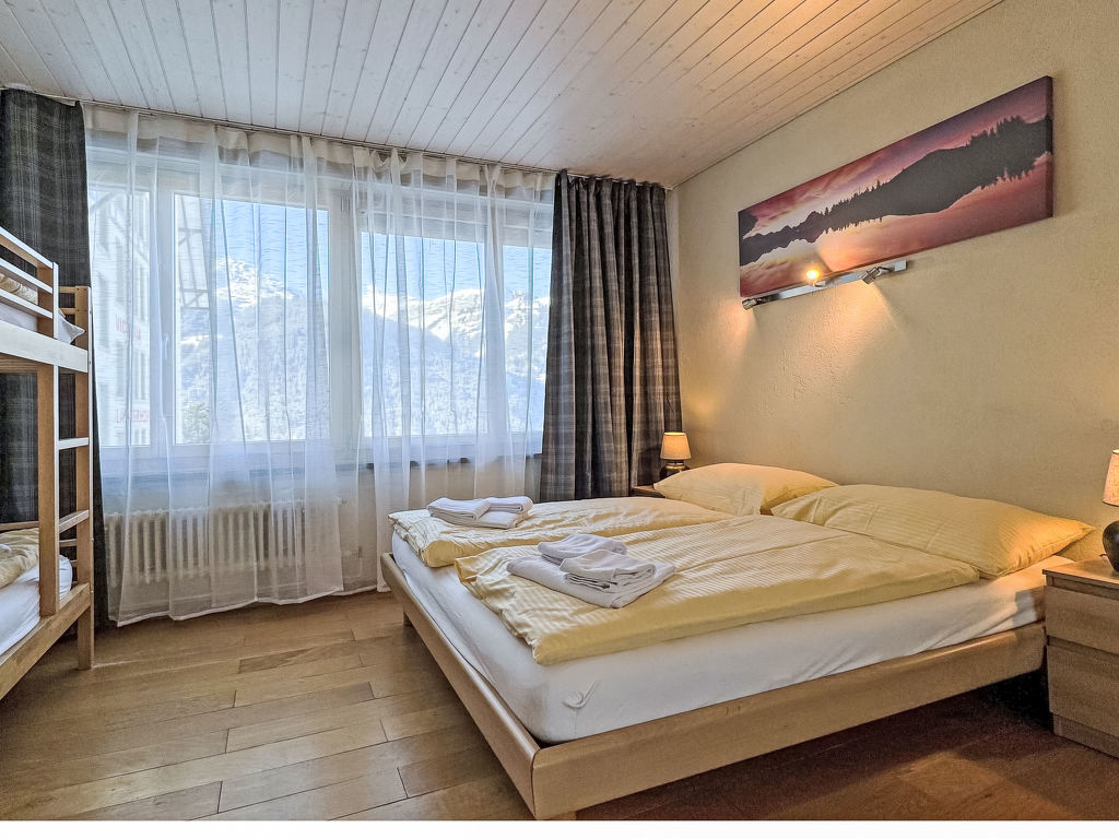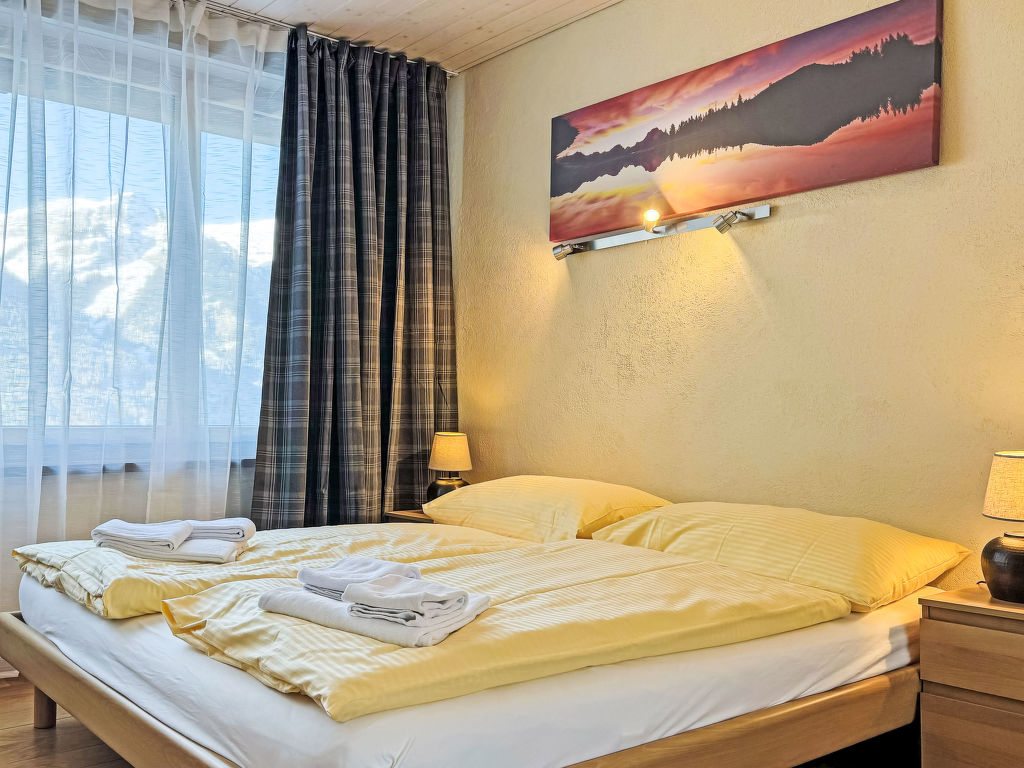 Haus Gertsch Apt.G, 2-Zimmer-Wohnung 50 m2 im 1. Stock. Komfortabel und gemütlich eingerichtet: Wohn-/Esszimmer mit 2 Wandschrankbetten (80 cm, Länge 180 cm), Kabel-TV und Radio. Ausgang zum Balkon. 1 Zimmer mit 1 x 2 Etagenbetten (90 cm, Länge 200 cm), 1 Doppelbett (2 x 90 cm, Länge 200 cm). Offene Küche (3 Kochplatten, Backofen, Geschirrspüler, Toaster, Wasserkocher, Mikrowelle, elektrische Kaffeemaschine, Kapseln für die Kaffeemaschine (Nespresso) extra). Dusche/WC. E-Heizung, Boiler. Kleiner Balkon. Balkonmöbel. Sicht auf die Berge. Zur Verfügung: Bügeleisen, Haartrockner. Internet (WLAN, gratis). Bitte beachten: Nichtraucher-Unterkunft.