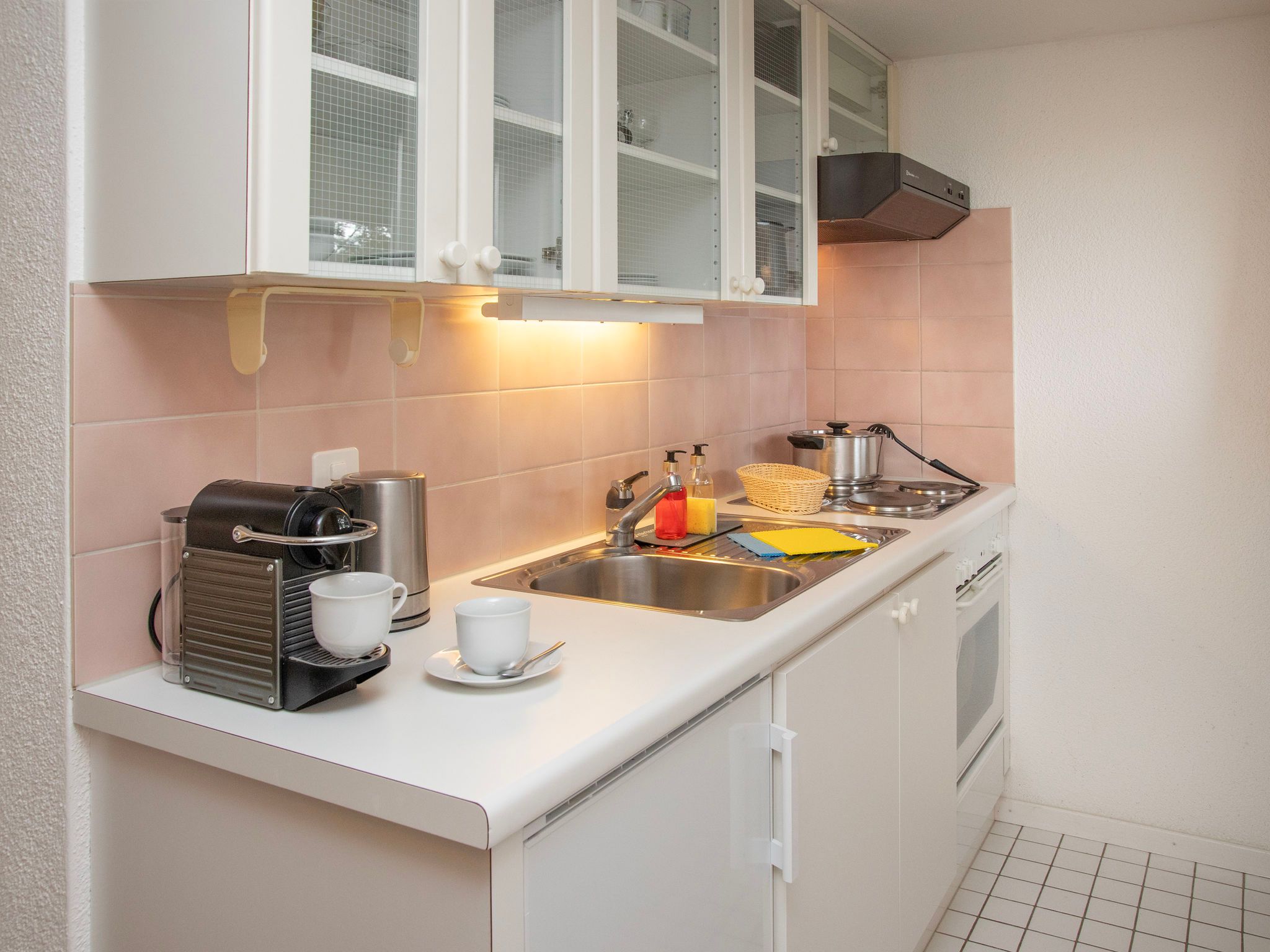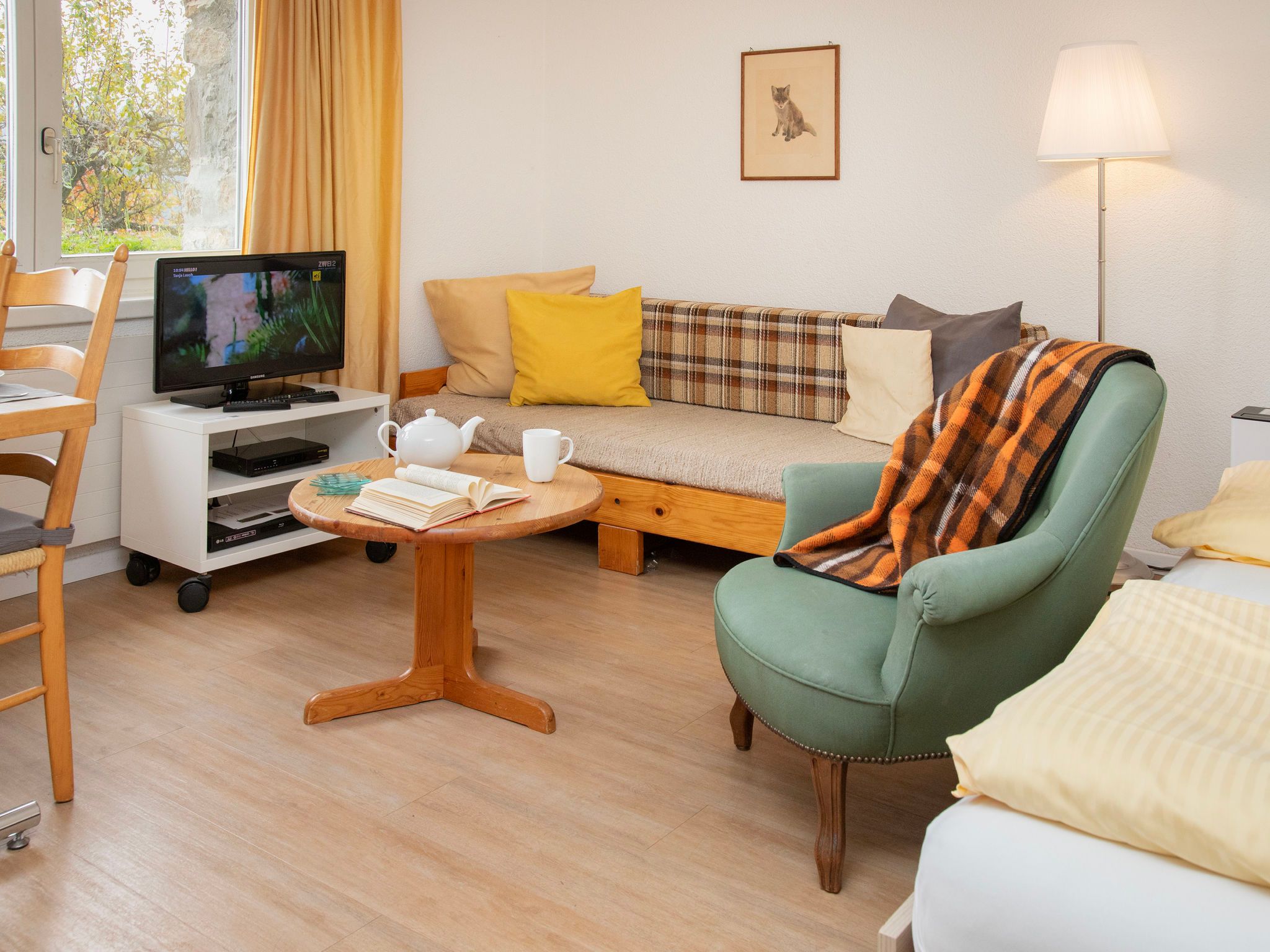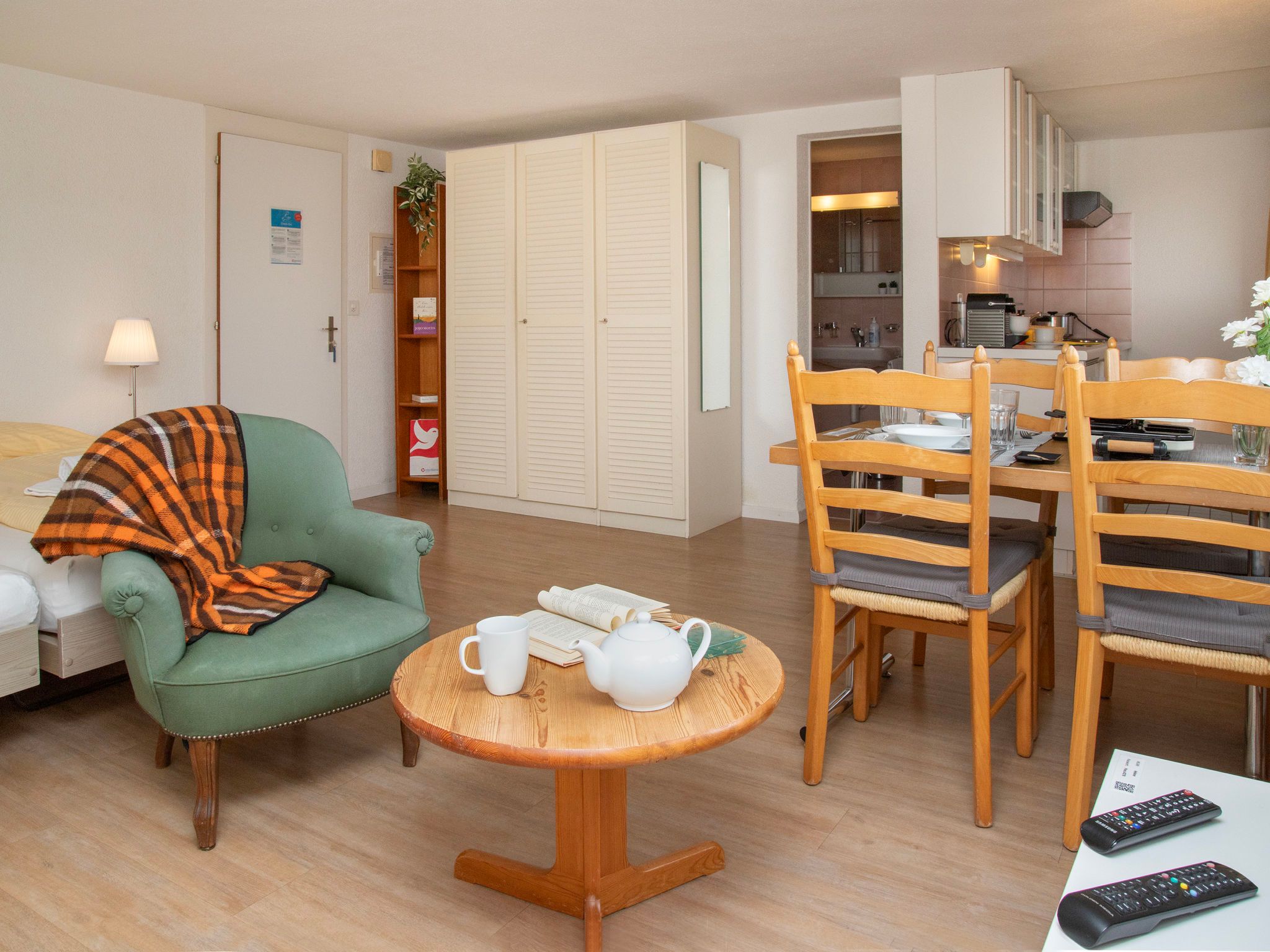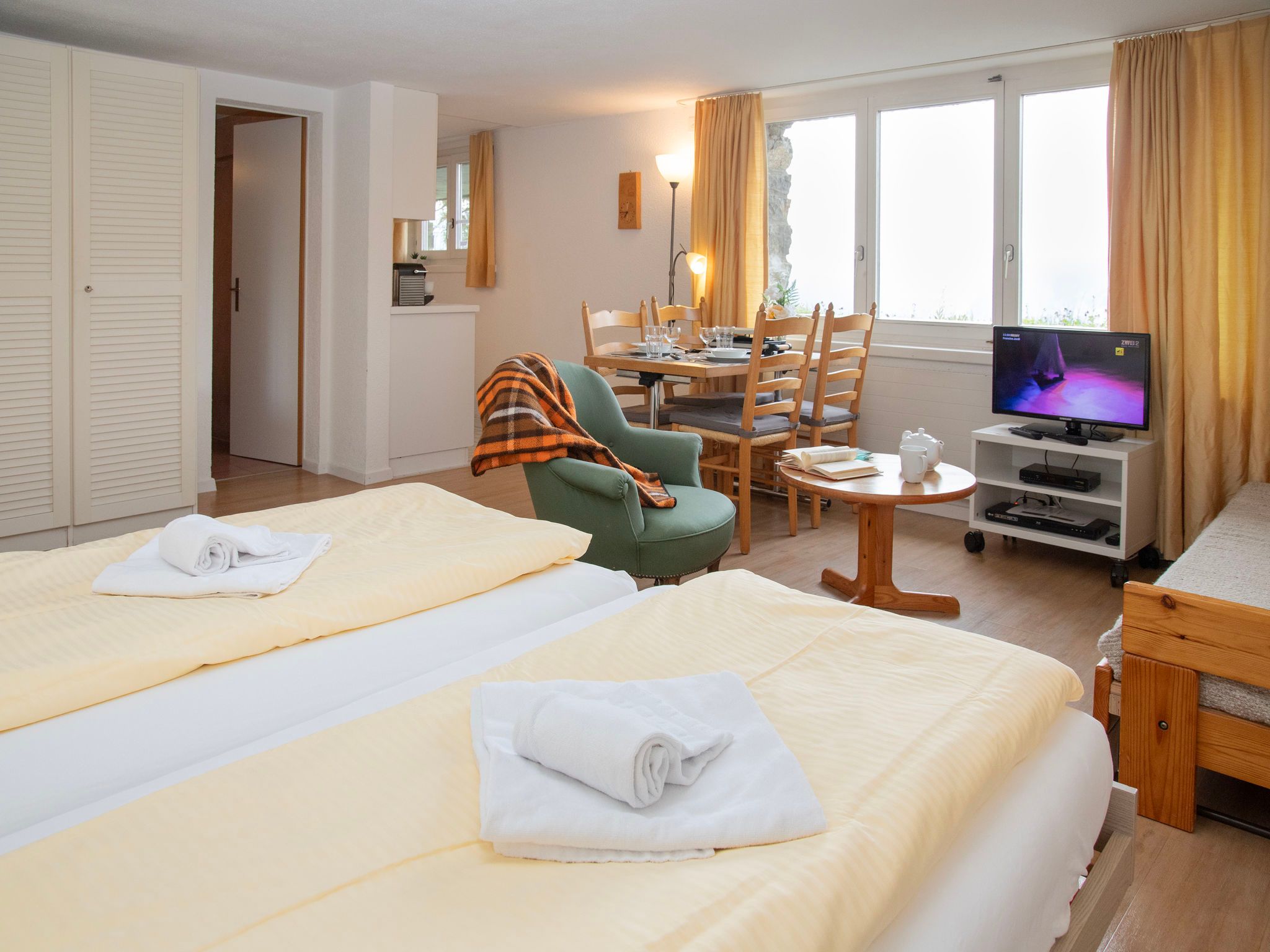Helene Studio Christel, 1-Zimmer-Studio 31 m2, unteres Geschoss. Zweckmässig und gemütlich eingerichtet: Wohn-/Schlafzimmer mit 2 Betten (90 cm, Länge 200 cm), Esstisch, Sat-TV und Radio. Kleine Küche (3 Kochplatten, Backofen, Toaster, Wasserkocher, elektrische Kaffeemaschine, Kapseln für die Kaffeemaschine (Nespresso) extra, Fondue Set (Käse)). Bad/Dusche/WC. Sicht auf die Berge. Zur Verfügung: Internet (Wireless LAN, gratis). Bitte beachten: Nichtraucher-Unterkunft. Maximal 1 Haustier/Hund erlaubt.