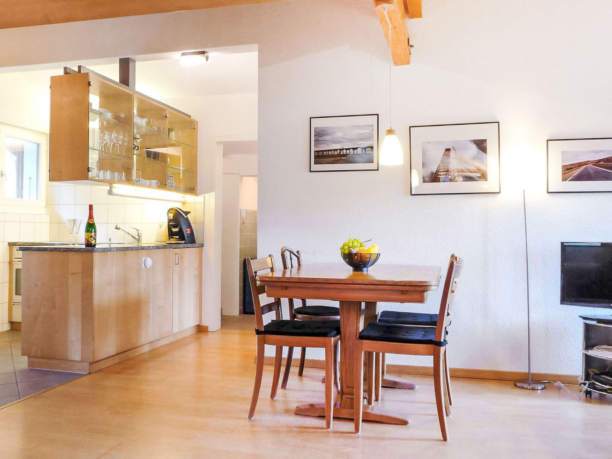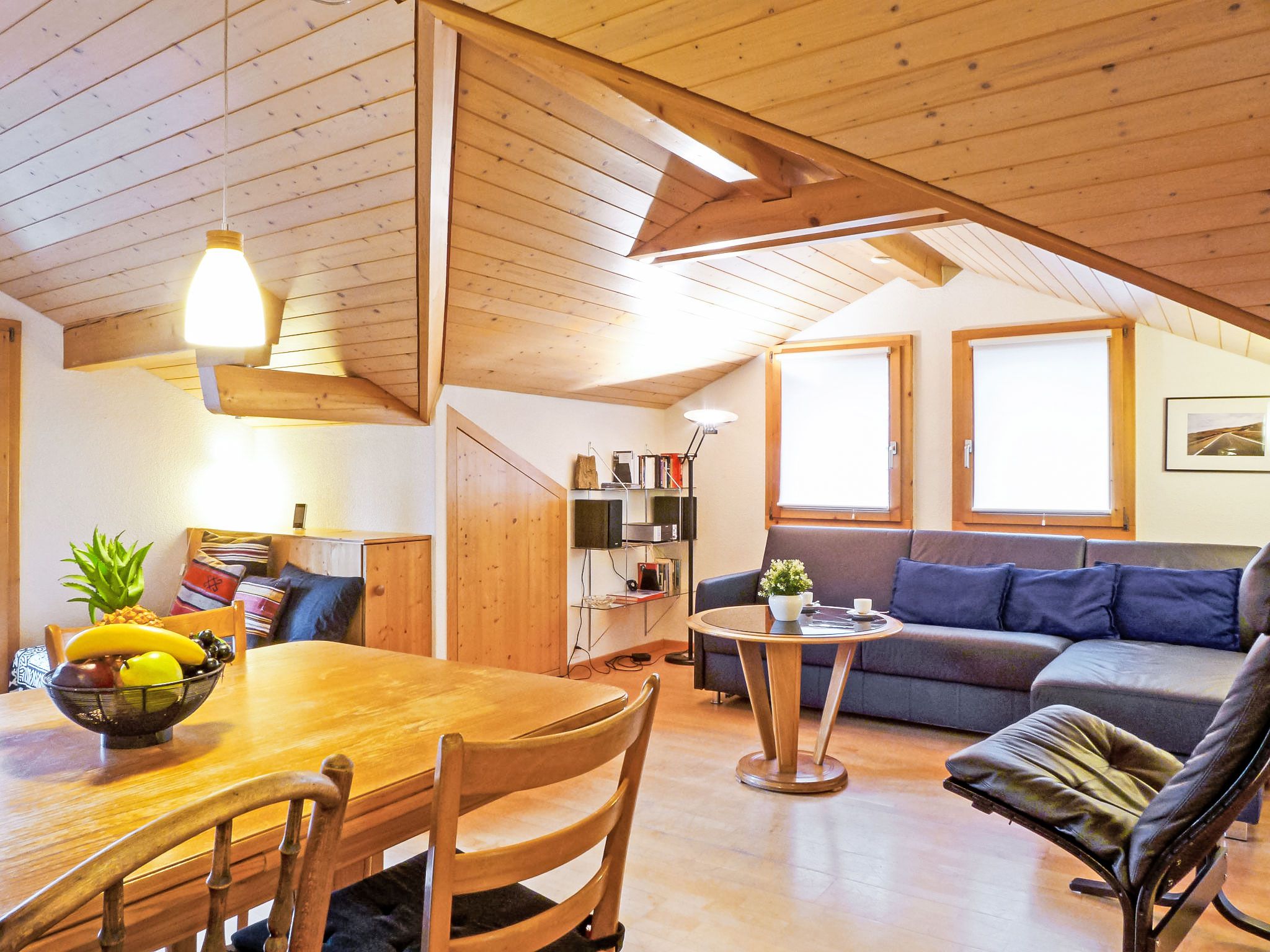 Melodie Apt.W, 2-Zimmer-Wohnung 50 m2, im Dachgeschoss. Abgeschrägt, geschmackvoll und gemütlich eingerichtet: Wohn-/Esszimmer mit 1 Diwanbett (160 cm, Länge 200 cm), 1 Schlafmöglichkeit (1 x 90 cm, Länge 200 cm), Kabel-TV, Radio und CD. 1 Zimmer mit 1 franz. Bett (1 x 160 cm, Länge 200 cm). Kleine, offene Küche (Backofen, 4 Glaskeramikplatten, Toaster, Wasserkocher, elektrische Kaffeemaschine, Kapseln für die Kaffeemaschine (Nespresso) extra, Fondue Set (Käse)). Bad/Dusche/WC. 2 kleine Balkone. Balkonmöbel. Sehr schöne Sicht auf die Berge und das Tal. Zur Verfügung: Bügeleisen, Haartrockner. Internet (Wireless LAN, gratis). Bitte beachten: Nichtraucher-Unterkunft.