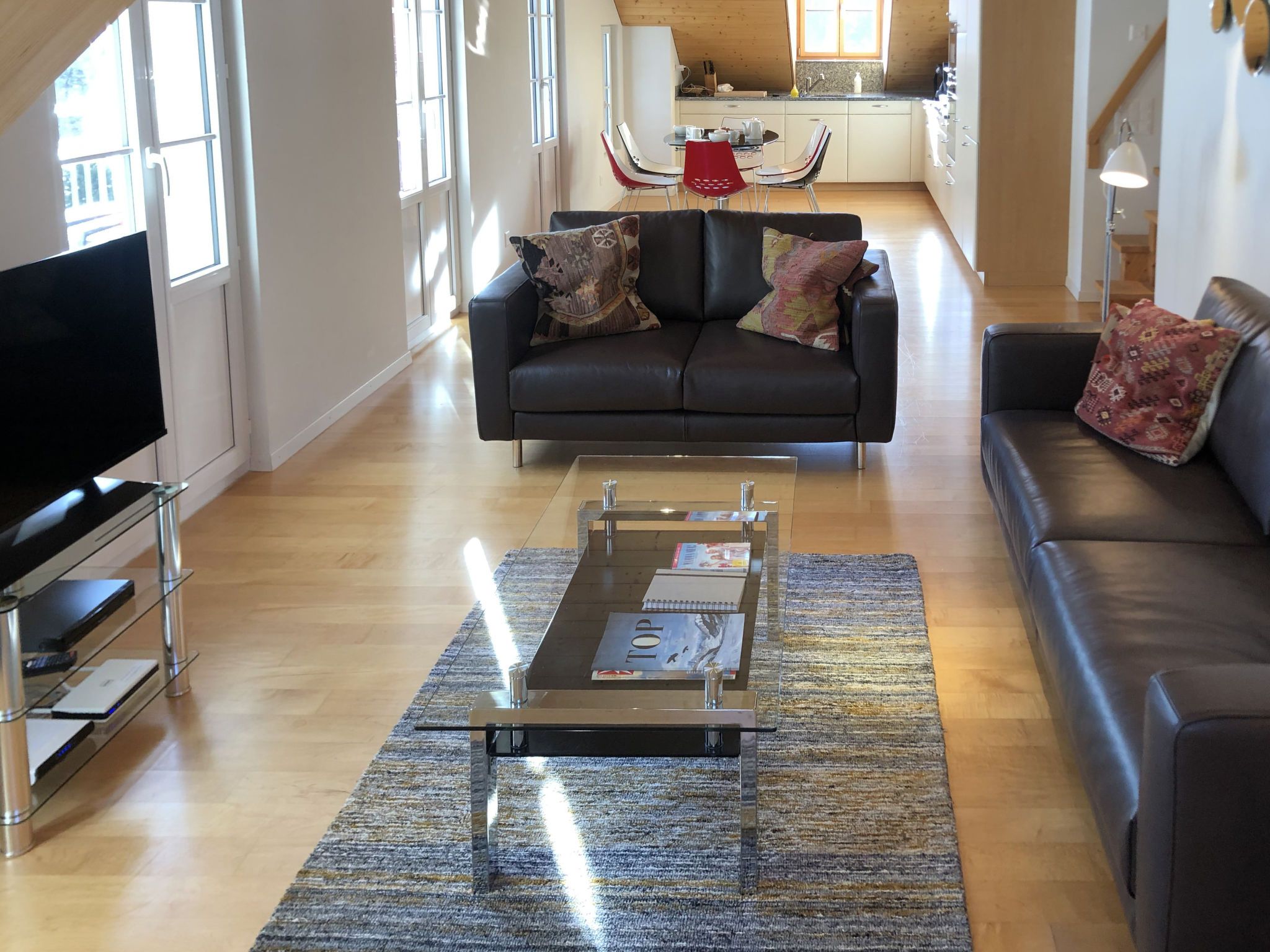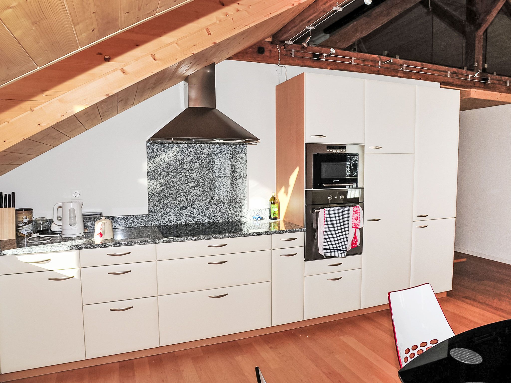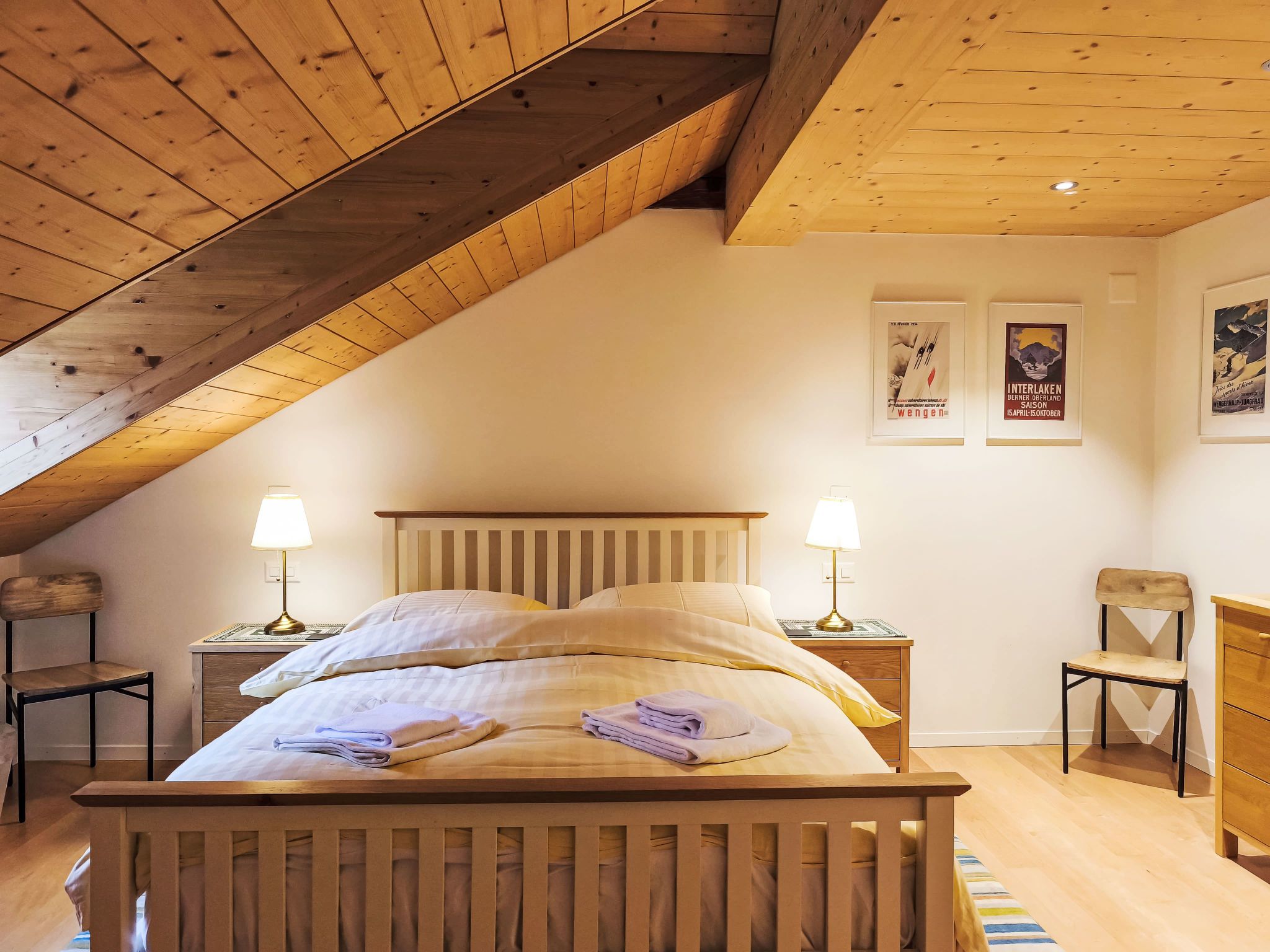 Mittaghorn Apt.8, 3-Zimmer-Wohnung 117 m2, im Dachgeschoss. Geräumig und hell, abgeschrägt, modern und stilvoll eingerichtet: Wohn-/Esszimmer mit Schwedenofen, Esstisch, Kabel-TV, Radio und DVD. 1 Zimmer mit 1 franz. Bett (1 x 160 cm, Länge 200 cm), Bad/WC. 1 Zimmer mit 2 Betten (90 cm, Länge 200 cm). Grosse, offene Küche (Backofen, Geschirrspüler, 4 Induktionskochplatten, Toaster, Wasserkocher, Mikrowelle, elektrische Kaffeemaschine, Kapseln für die Kaffeemaschine (Nespresso) extra, Fondue Set (Chinoise, Käse)). Dusche/WC. Balkon, Südostlage. Balkonmöbel. Herrliche Panoramasicht auf die Berge. Zur Verfügung: Waschmaschine, Wäschetrockner, Holz (extra). Internet (Wireless LAN, gratis). Bitte beachten: Nichtraucher-Unterkunft.