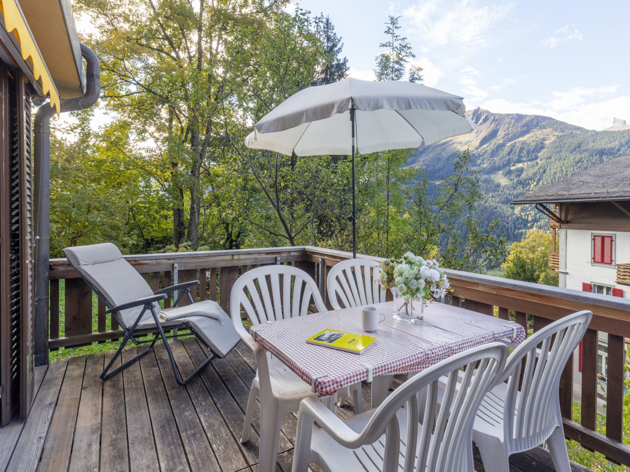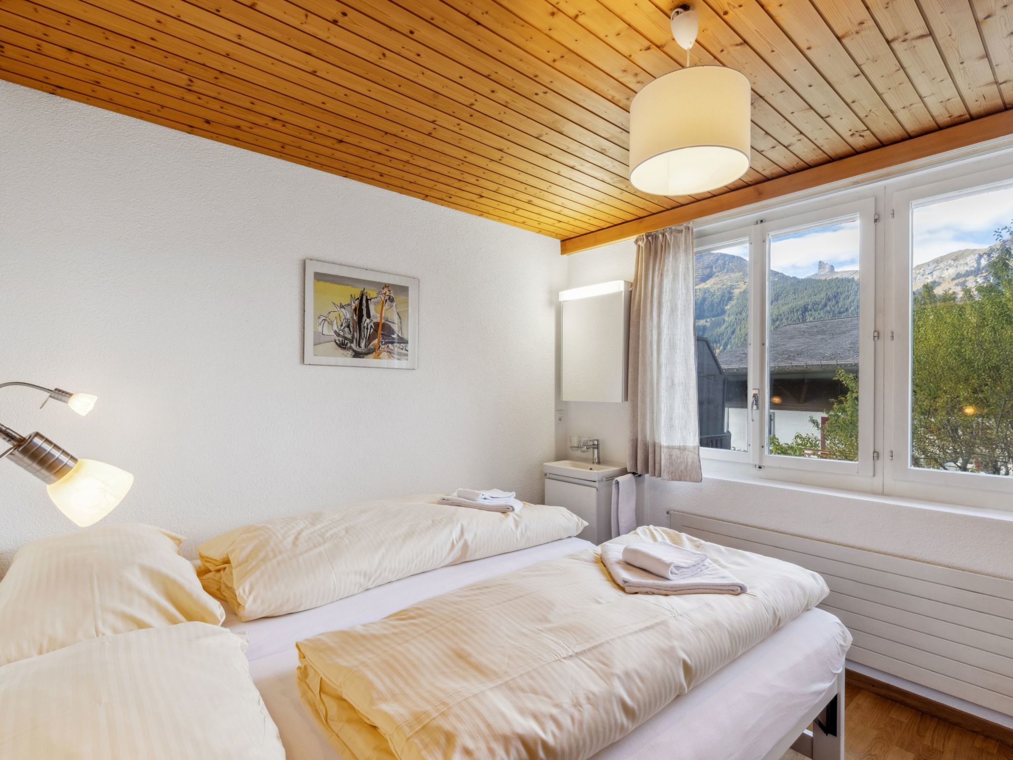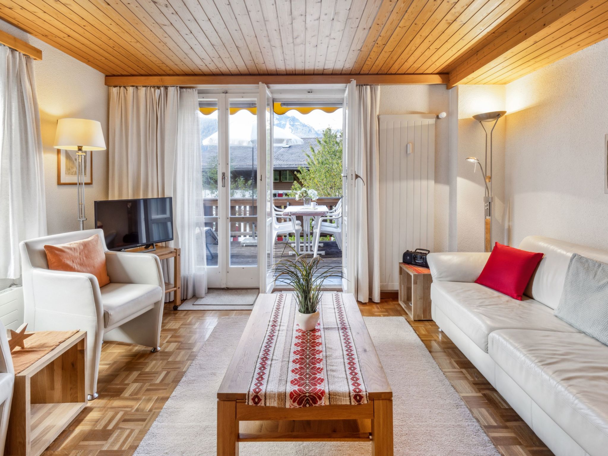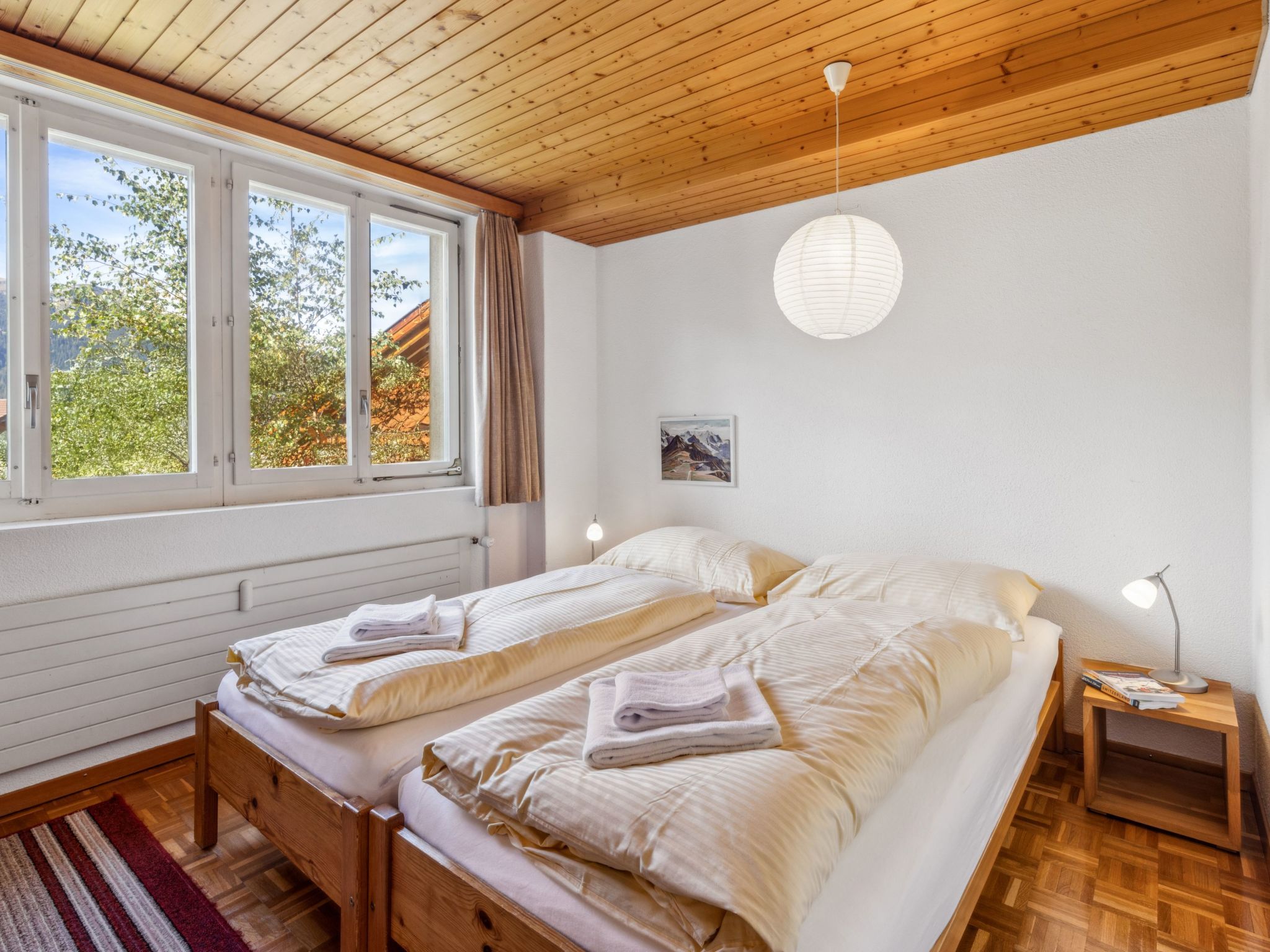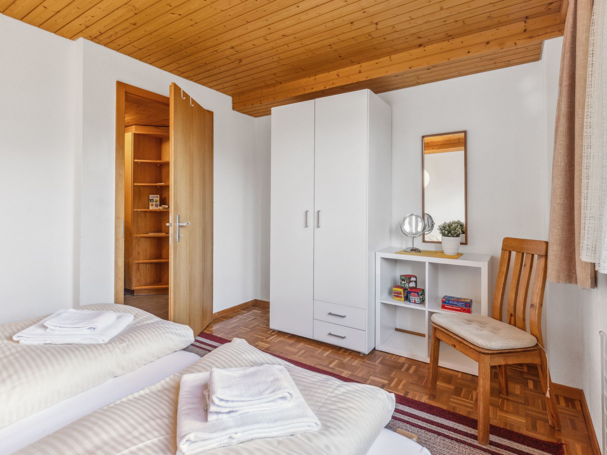Schweizerhof Apt. S, 3-Zimmer-Wohnung 59 m2, im erhöhten Erdgeschoss. Hell, zweckmässig und gemütlich eingerichtet: Wohn-/Esszimmer mit Esstisch, Kabel-TV, Radio, CD und DVD. 1 Zimmer mit 1 Doppelbett (2 x 90 cm, Länge 200 cm). 1 Zimmer mit 2 Betten (90 cm, Länge 200 cm). Küche (Backofen, Geschirrspüler, 4 Glaskeramikplatten, Toaster, Wasserkocher, elektrische Kaffeemaschine, Kapseln für die Kaffeemaschine (Nespresso) extra, Racletteofen, Fondue Set (Käse)). Bad/Dusche/WC. Balkon. Balkonmöbel. Sehr schöne Panoramasicht auf die Berge. Zur Verfügung: Bügeleisen, Haartrockner. Internet (Wireless LAN, gratis). Bitte beachten: Nichtraucher-Unterkunft.