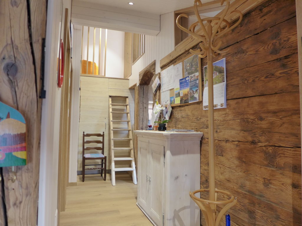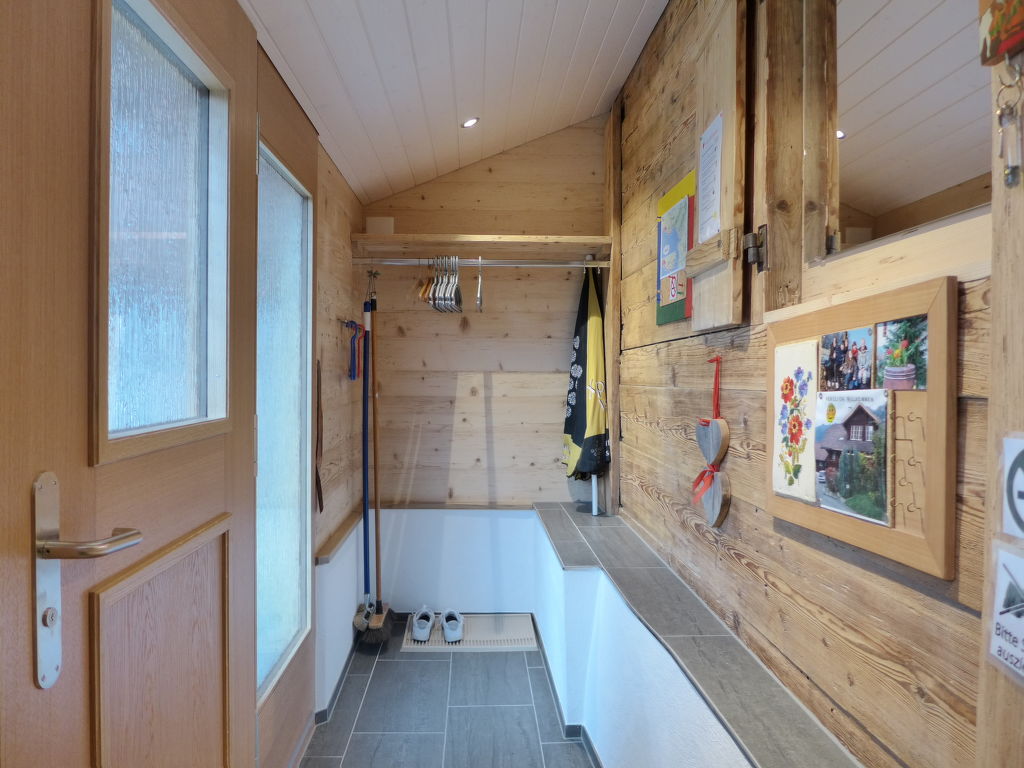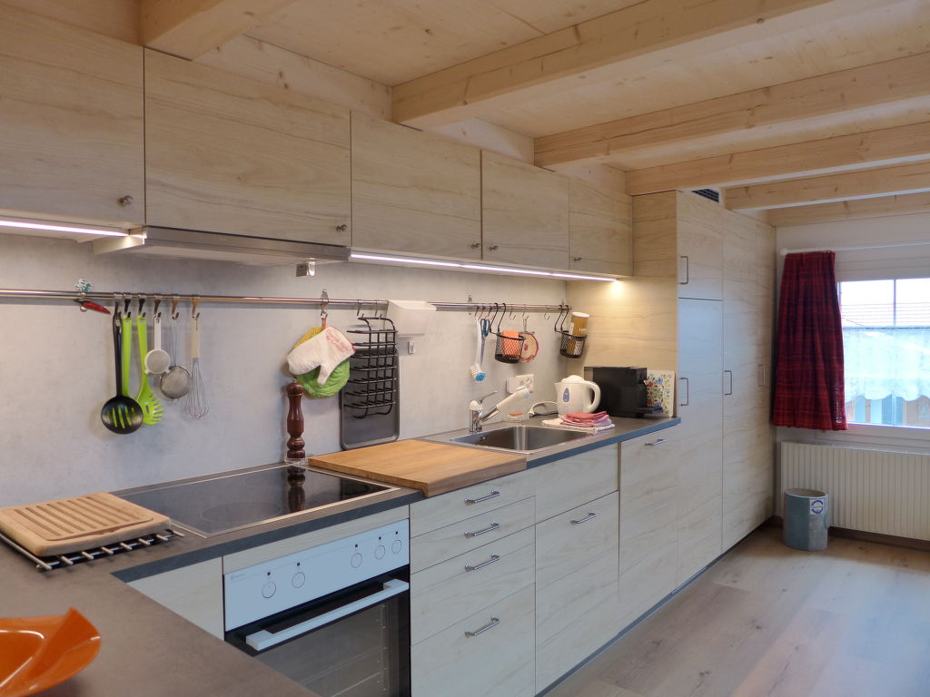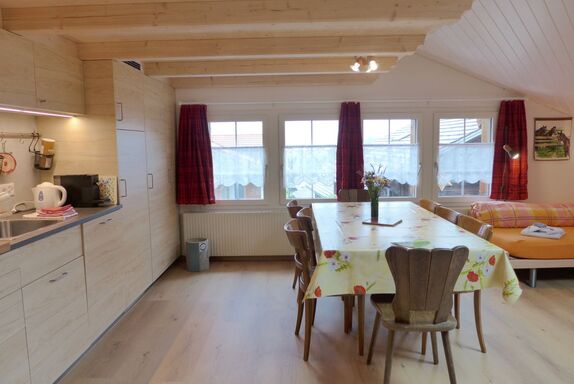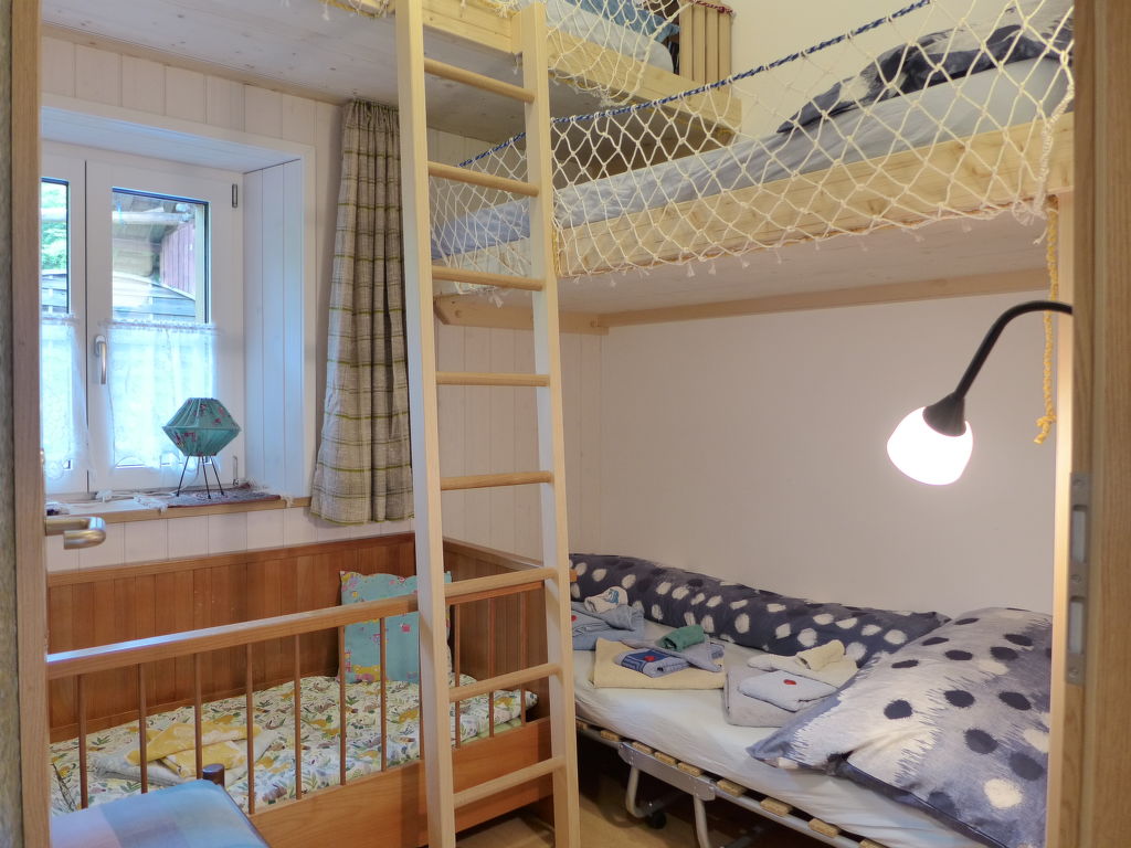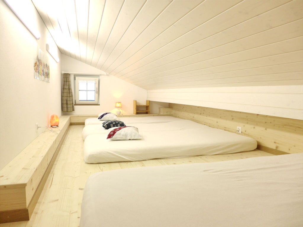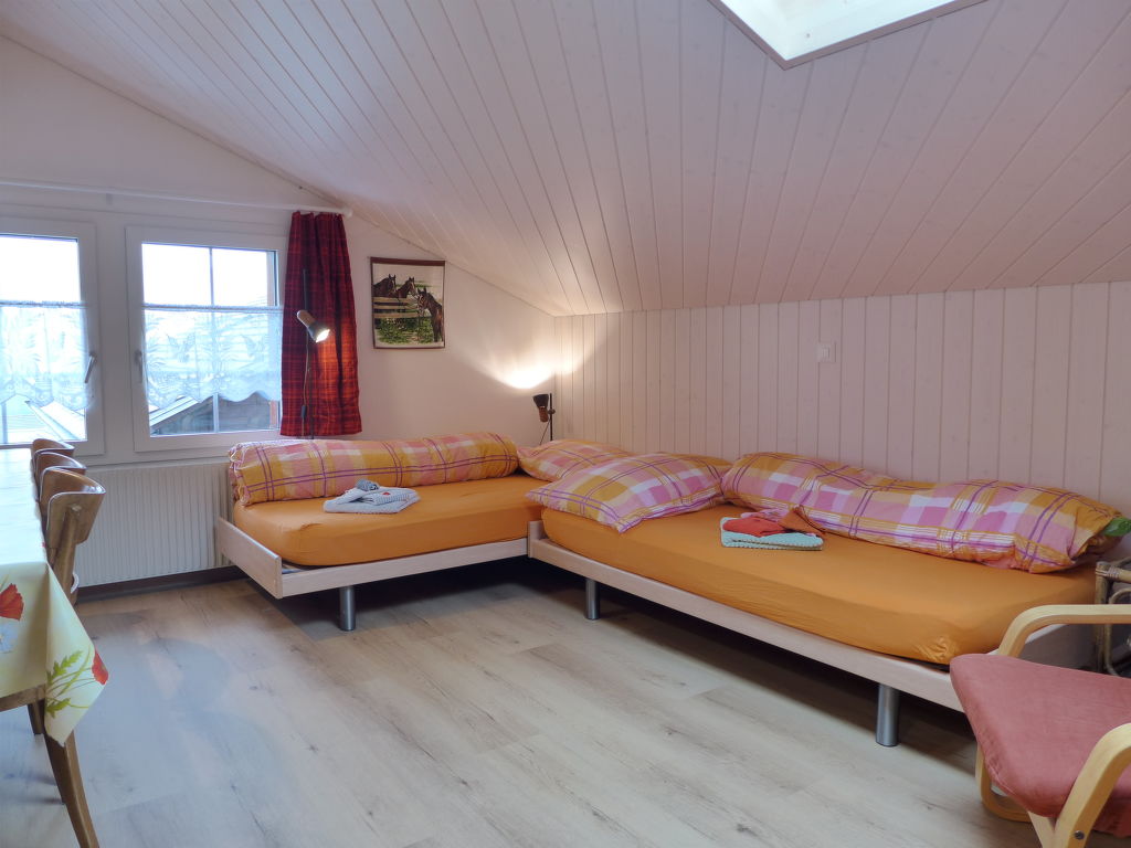 Beim Thor, 2-Zimmer-Wohnung 40 m2 auf 2 Stockwerken, im Obergeschoss. Geräumig und hell, sehr gemütlich eingerichtet: offenes grosses Wohn-/Schlafzimmer mit 2 Betten (90 cm, Länge 200 cm), Esstisch, Flachbildschirm, Radio, Stereoanlage und DVD. 1 Zimmer, auf 3 Ebenen, 3 Etagenbetten (90 cm, Länge 200 cm). Offene Küche (Backofen, Geschirrspüler, 3 Glaskeramikplatten, Toaster, Wasserkocher, Mikrowelle, elektrische Kaffeemaschine, Kapseln für die Kaffeemaschine (Delizio) extra, Racletteofen, Fondue Set (Käse)). Dusche/WC. Dachgeschoss: (Leiter) 1 abgeschrägtes Zimmer mit 4 Schlafmöglichkeiten (90 cm, Länge 200 cm). Kleine Terrasse. Balkonmöbel. Schöne Sicht auf die Berge und die Landschaft. Zur Verfügung: Babybett bis 2 Jahre (extra), Haartrockner. Internet (WLAN, gratis). Maximal 1 Haustier/Hund erlaubt. Bei Belegung mit weniger Personen als der maximalen Personenzahl stehen nicht alle Wohneinheiten zur Verfügung.