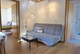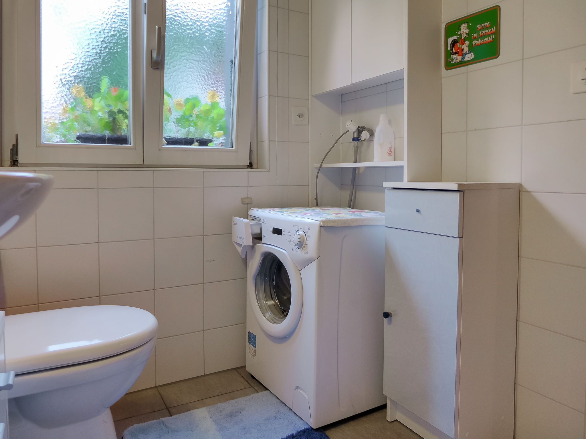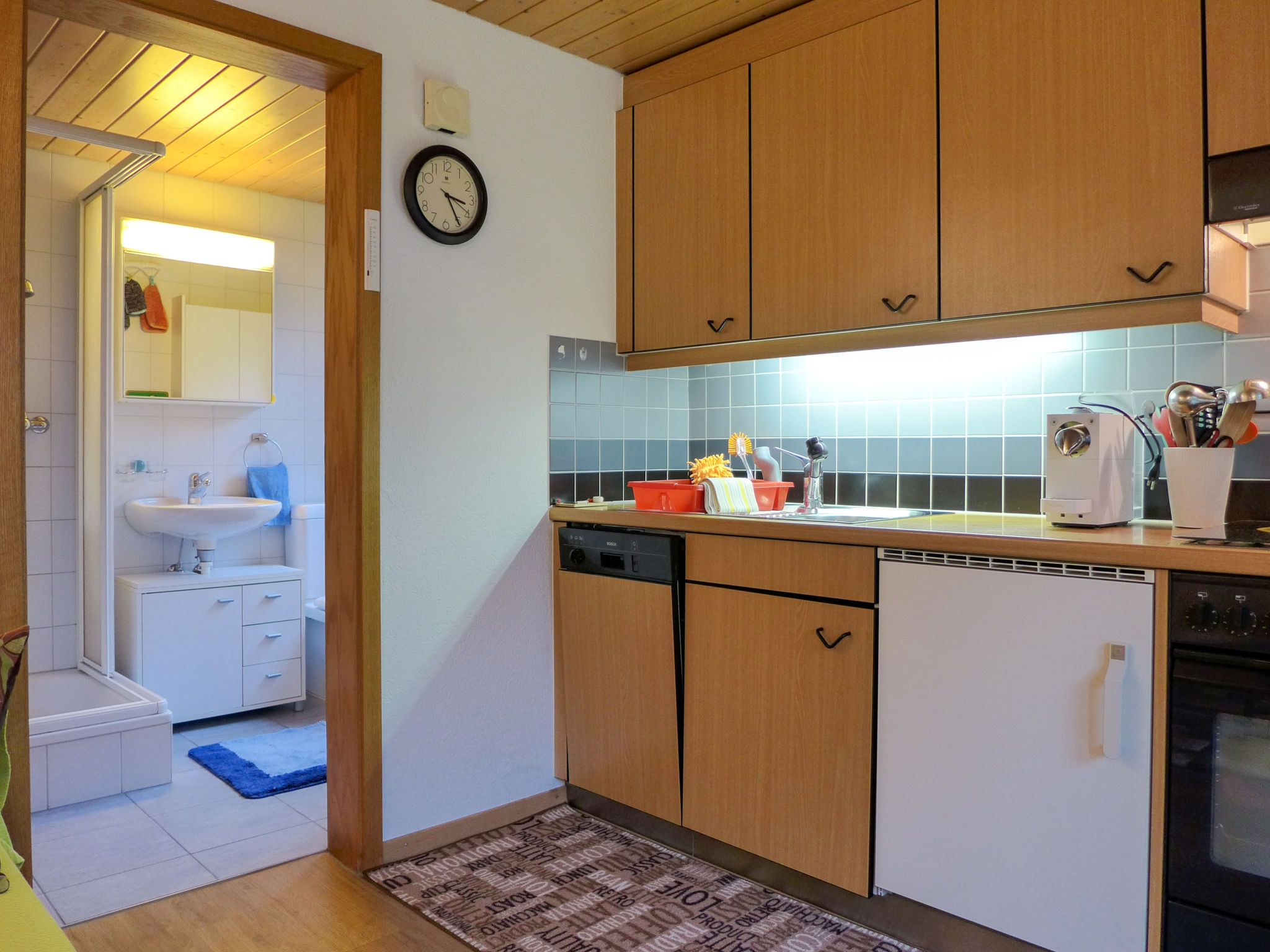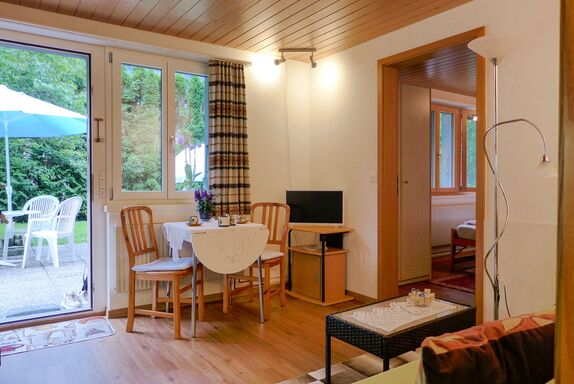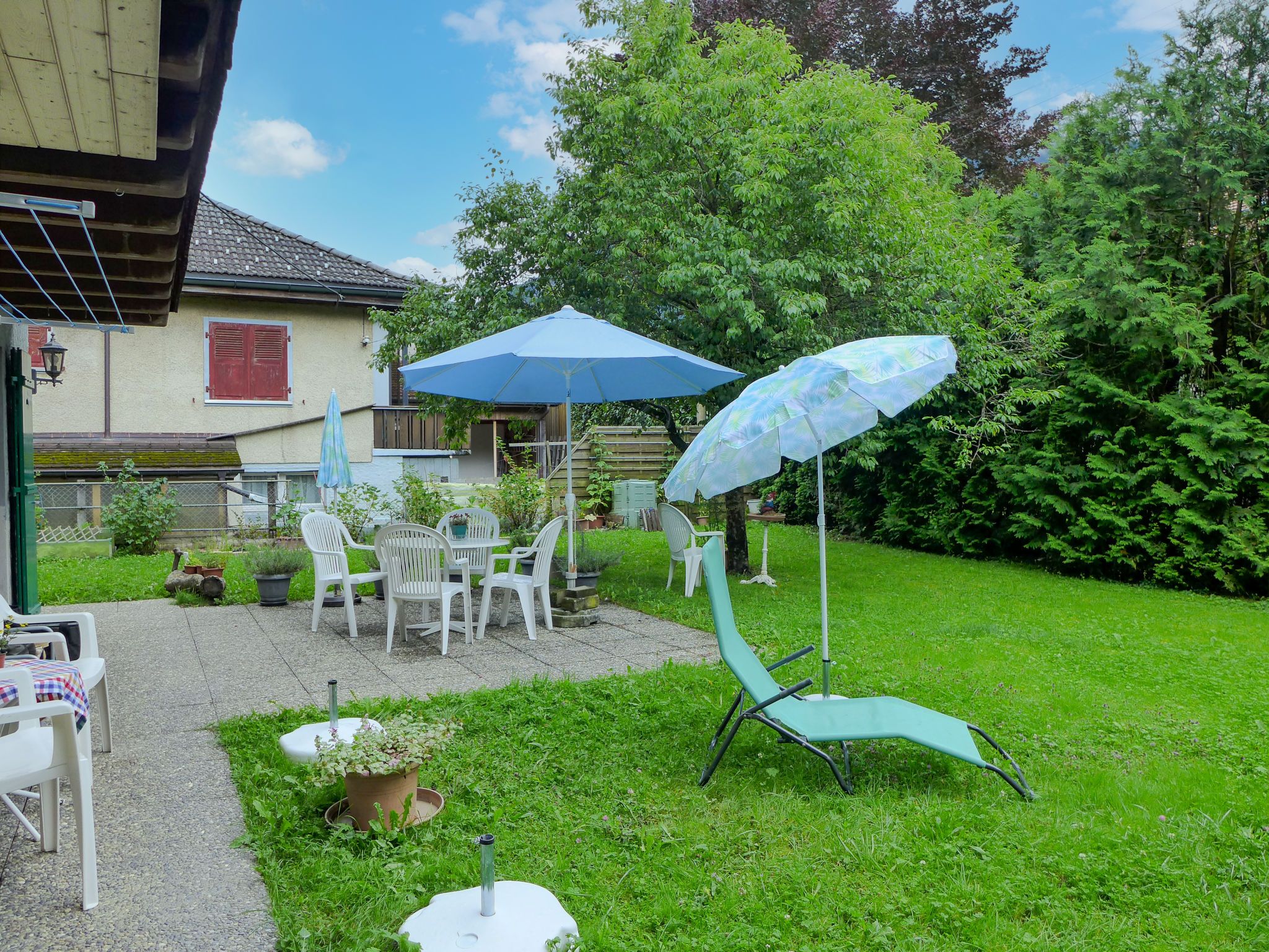 Erika, 2-Zimmer-Wohnung 35 m2, im Erdgeschoss. Zweckmässig und gemütlich eingerichtet: Wohn-/Esszimmer mit 1 Diwanbett, Esstisch und Sat-TV (Flachbildschirm), Radio. Ausgang zum Garten. 1 Zimmer mit 2 Betten (90 cm, Länge 200 cm). Offene Küche (Backofen, Geschirrspüler, 4 Glaskeramikplatten, Toaster, Wasserkocher, Mikrowelle, elektrische Kaffeemaschine, Kapseln für die Kaffeemaschine (Delizio) extra, Racletteofen, Fondue Set (Käse)). Dusche/WC. Grosse Terrasse. Terrassenmöbel, Gartengrill, Liegestühle. Eingeschränkte Sicht auf die Berge und die Landschaft. Zur Verfügung: Waschmaschine, Bügeleisen, Haartrockner. Internet (Wireless LAN, gratis). Parkplatz. Bitte beachten: Nichtraucher-Unterkunft.