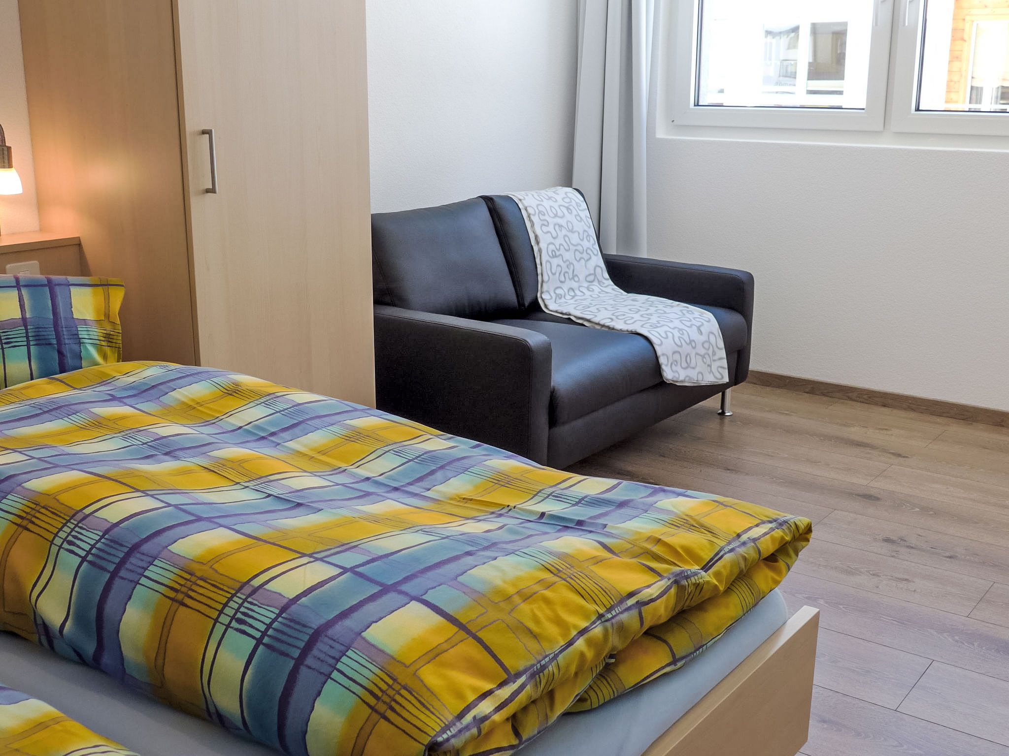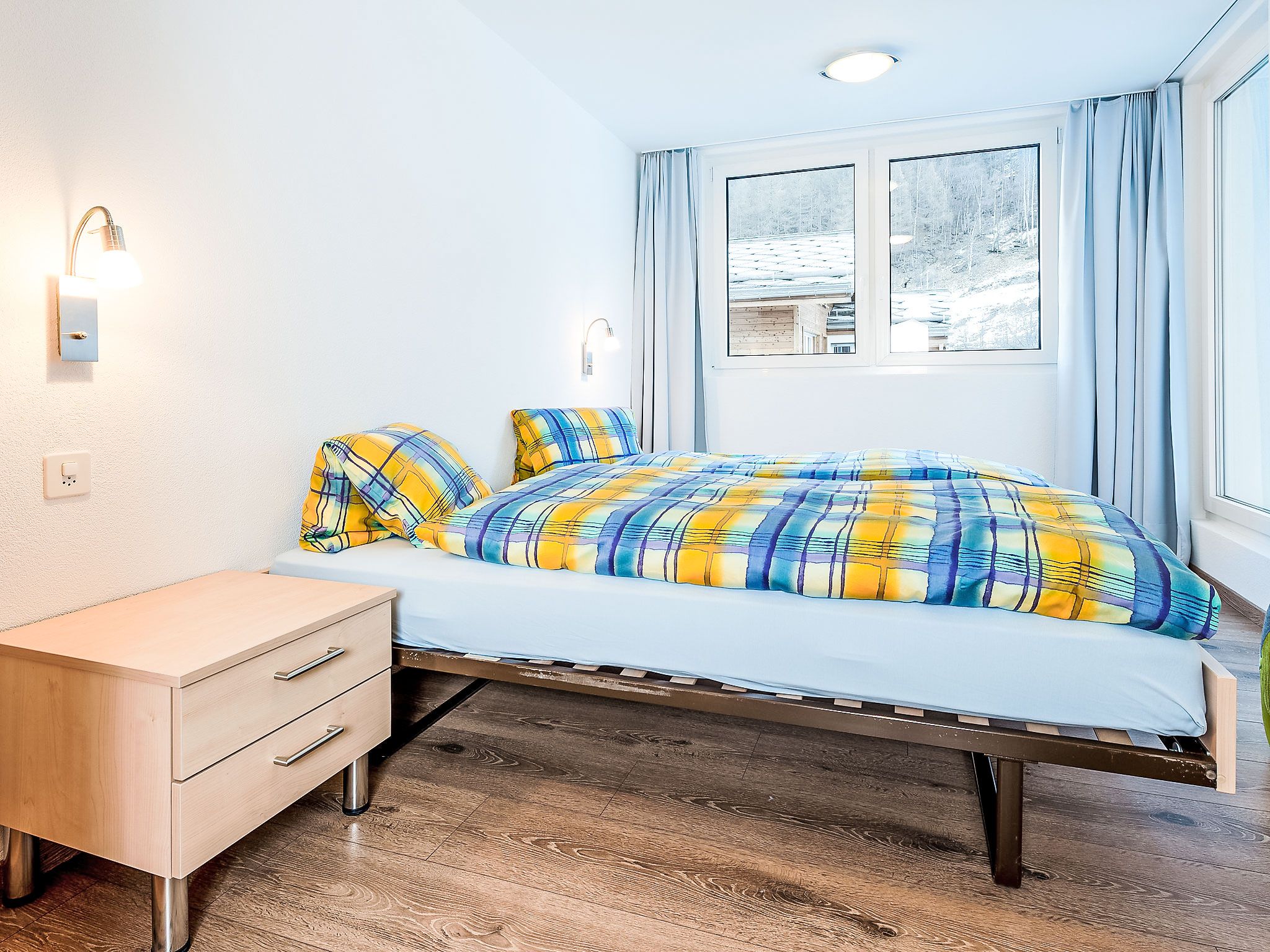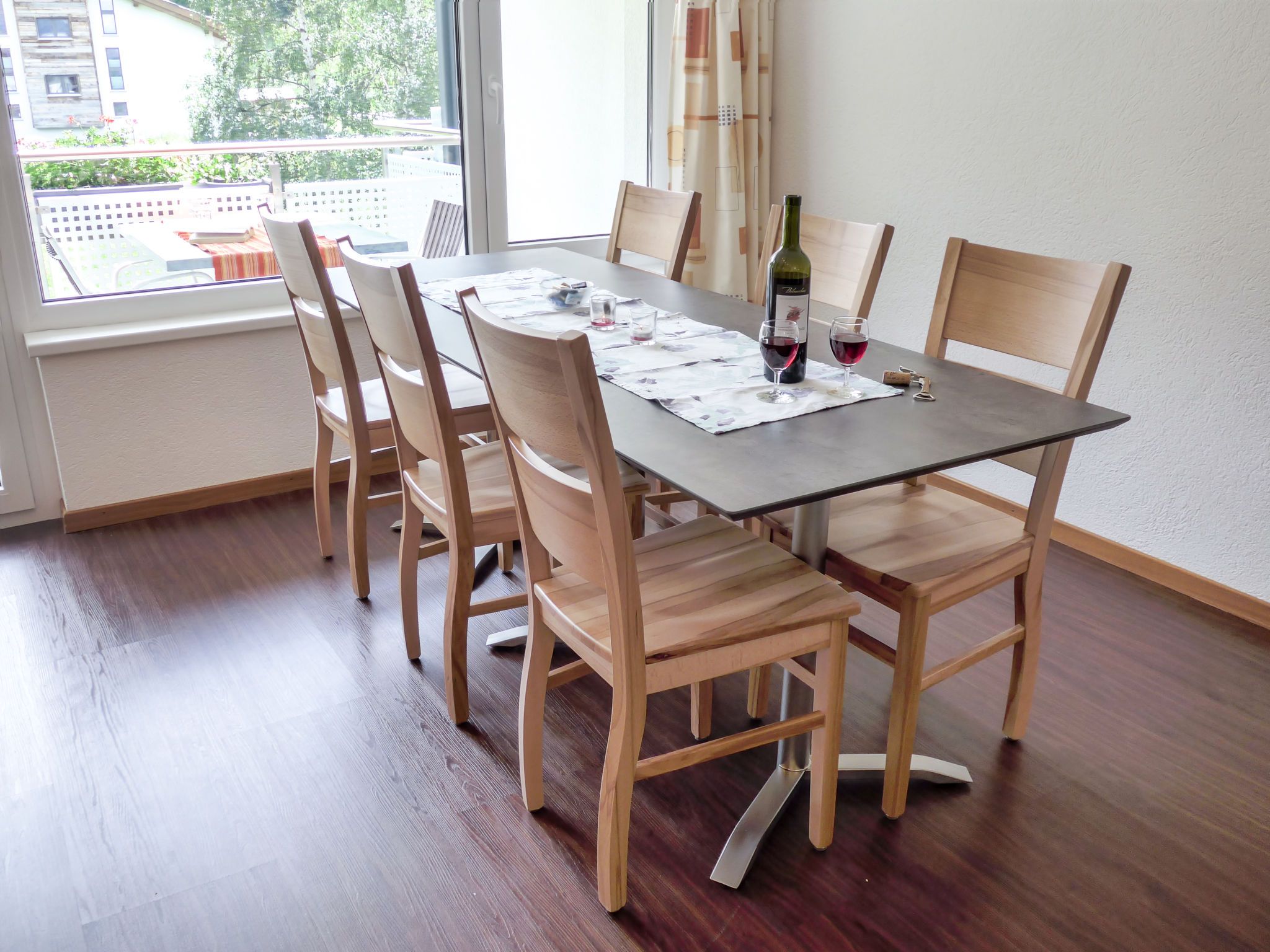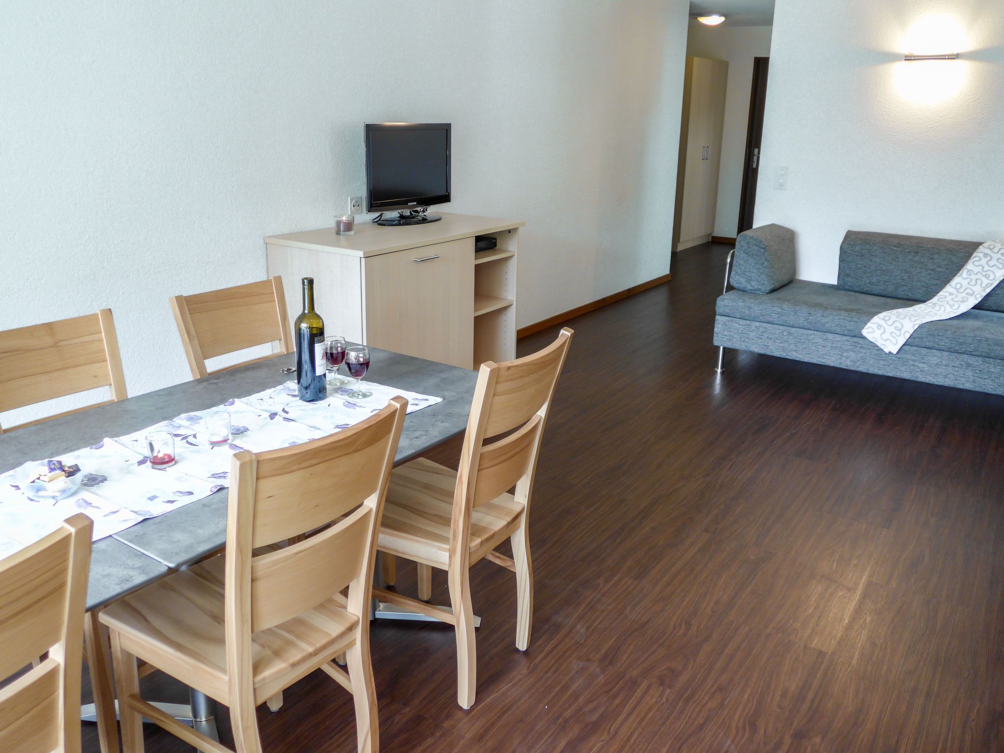 3-Zimmer-Wohnung 76 m2. Renoviert im Jahre 2015, schön und gemütlich eingerichtet: Wohn-/Esszimmer mit 2 Betten (90 cm, Länge 190 cm), Sat-TV und Radio. 1 Zimmer mit 1 Doppelbett. 1 Zimmer mit 2 Betten (90 cm, Länge 190 cm). Offene Küche (Backofen, Geschirrspüler, 4 Glaskeramikplatten, elektrische Kaffeemaschine, Kapseln für die Kaffeemaschine (Nespresso) extra, Fondue Set (Käse)) mit Esstisch, Sat-TV und Radio. Bad/WC. Bodenheizung. Balkon, Südlage. Terrassenmöbel. Sehr schöne Sicht auf die Berge. Zur Verfügung: Babybett, Haartrockner. Internet (Wireless LAN, gratis). Parkplatz (1 Auto). Bitte beachten: Nichtraucher-Unterkunft. Maximal 1 Haustier/Hund erlaubt.