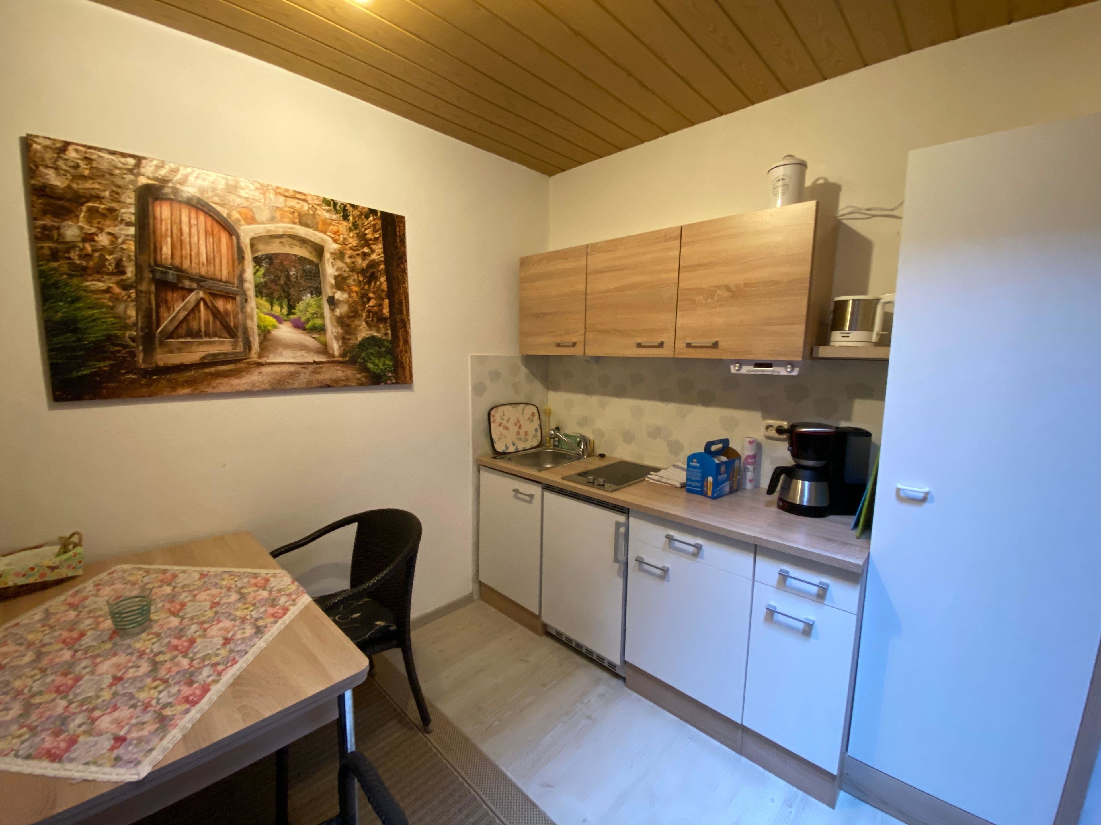 Eine voll ausgestattete Küche und eine kleine Terrasse ist ebenfalls Teil der Ferienwohnung.