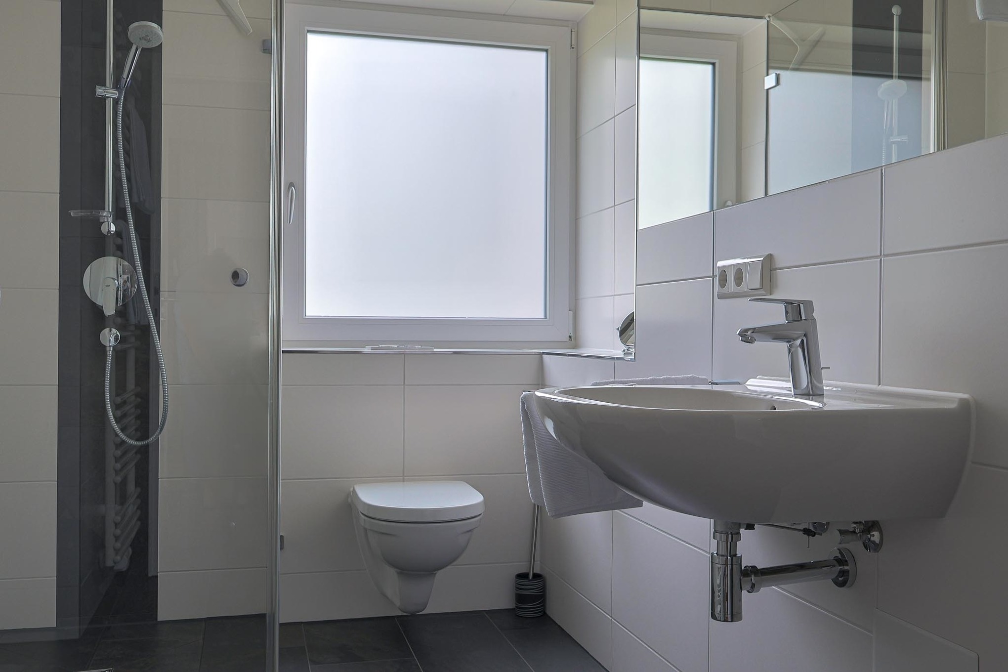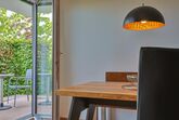 Unsere Kleinste , 2 Raum-Nichtraucher-Wohnung Eschbach, liegt im Erdgeschoss und hat eine Terrasse mit 14 qm. Auf ca. 40 qm bieten wir ihnen einen offenen Wohn- Essbereich mit Einbauküche, ein Schlafzimmer mit 160×200 cm Bett und ein Bad mit großzügiger Dusche. Das Sofa im Wohnbereich kann mit einem Handgriff in ein Bett, mit separater Matratze 120×200 cm, umgeklappt werden. 2 TV Geräte, Bose Sound-Kompaktanlage, geölte Holzparkettböden und individuelle Möbel vom Schreiner verleihen der Kleinen ihren Charme.