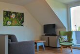Im Dachgeschoß befindet sich unsere 2 Raum-Nichtraucher-Wohnung Säntis. Vom 7 qm großen Balkon aus, ist die Spitze des Säntis bei gutem Wetter zu sehen. Die Wohnung bietet auf 56 qm Wohnfläche einen offenen Wohn- Essbereich mit Einbauküche, Schlafzimmer mit 200x200cm großem Bett, Bad mit Dusch-Badewanne und im Garderobenbereich mit Sitzbank genügend Stauraum für Rucksäcke, Schuhe und mehr. Bei 4 Personen Belegung wird das Sofa im Wohnbereich mit einem Handgriff zum 160x200cm großen Bett umgeklappt. 2 TV Geräte, Bose Sound-Kompaktanlage, geölte Holzparkettböden und individuelle Möbel vom Schreiner bieten ihnen ein modernes Wohlfühlklima.