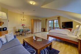 Im Wohn‑/Schlafbereich stehen ein komfortables Doppelbett sowie ein ausziehbares Sofa mit Lattenrost und Matratze zur Verfügung – perfekt für zusätzliche Gäste oder entspannte Lesestunden. Ein Couchtisch, ein Radio mit CD‑Player und ein LCD‑TV sorgen für gemütliche Abende.