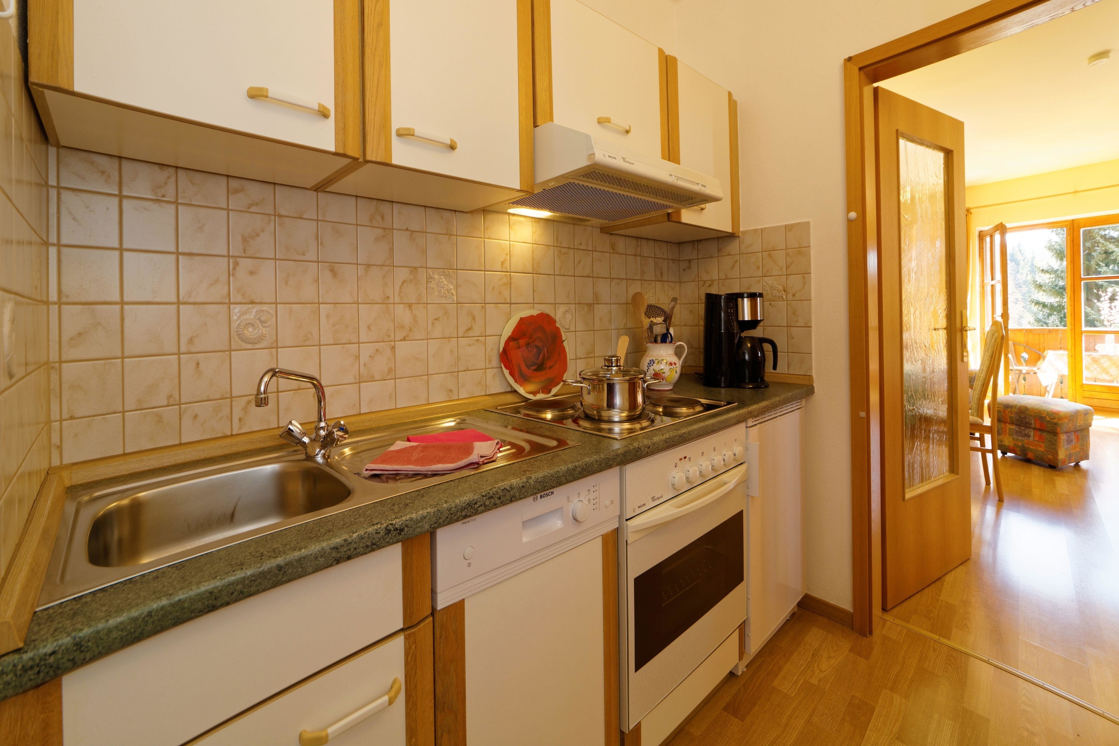 Der Wohn‑ und Essbereich ist gemütlich gestaltet und bietet Platz für zwei Personen. Die gut ausgestattete Küche verfügt über einen Kühlschrank mit Gefrierfach, einen Einbauherd mit Backofen, eine Dunstabzugshaube, einen Geschirrspüler sowie ein Spülbecken – ideal für alle, die auch im Urlaub gerne kochen.