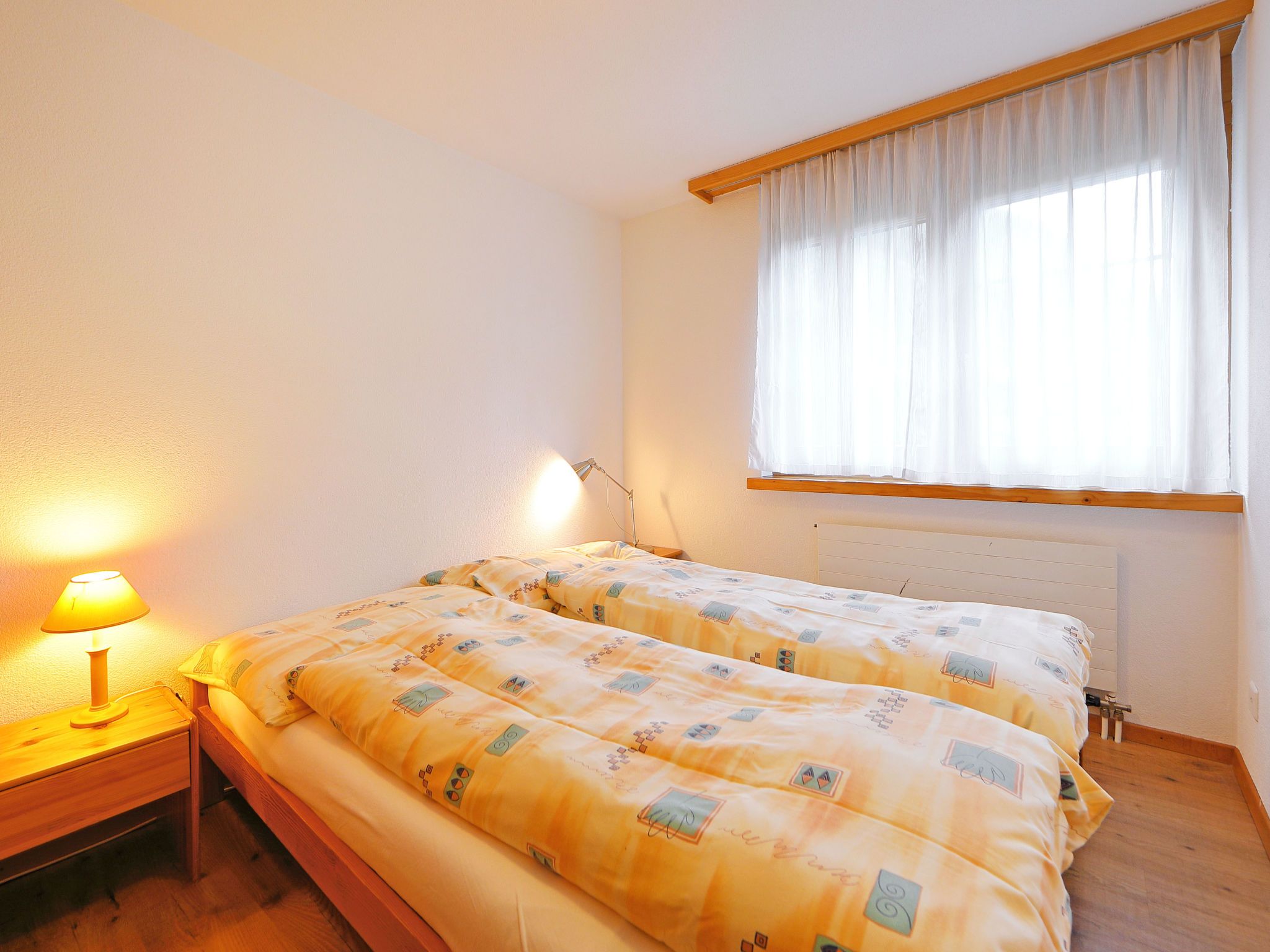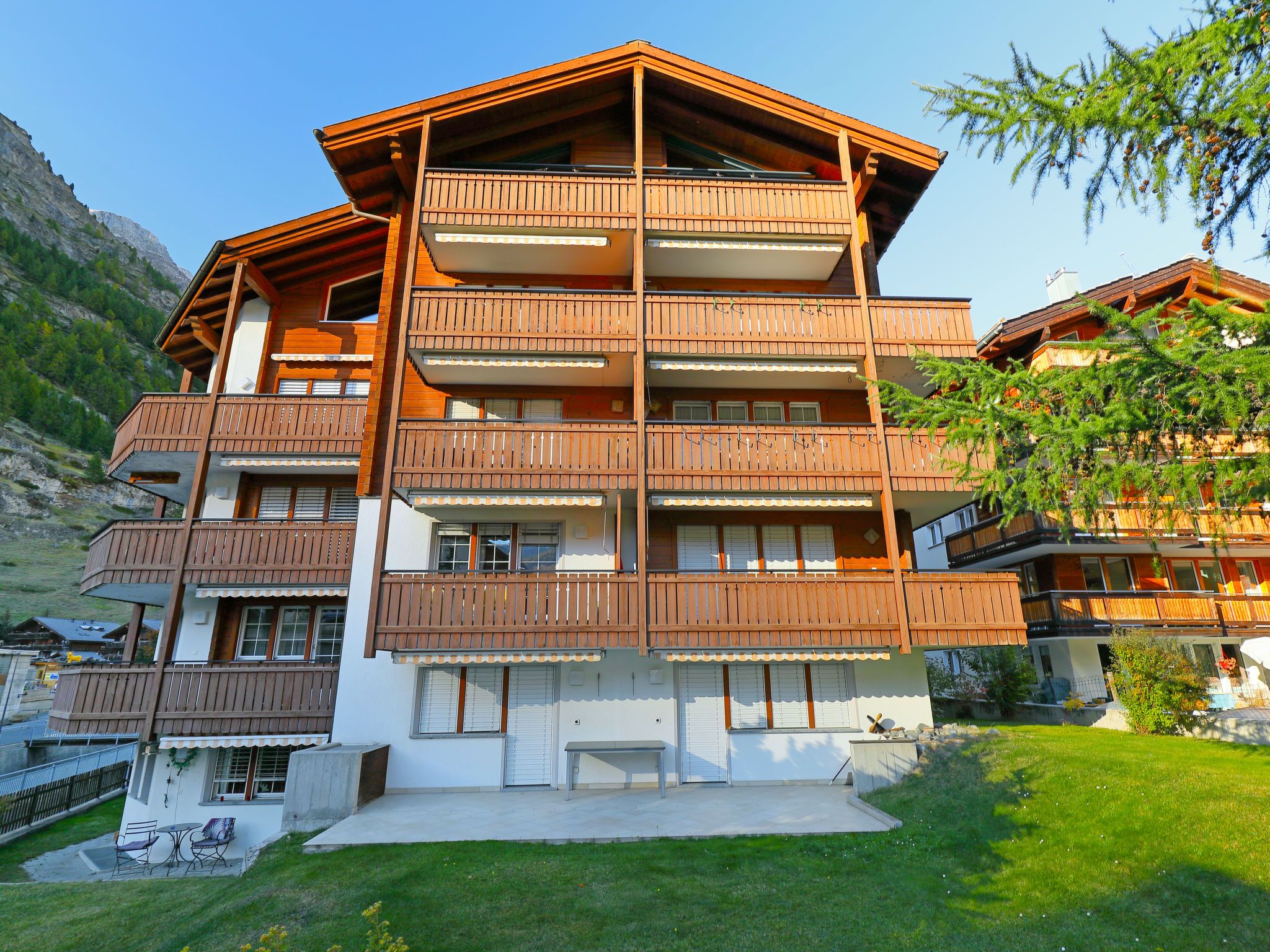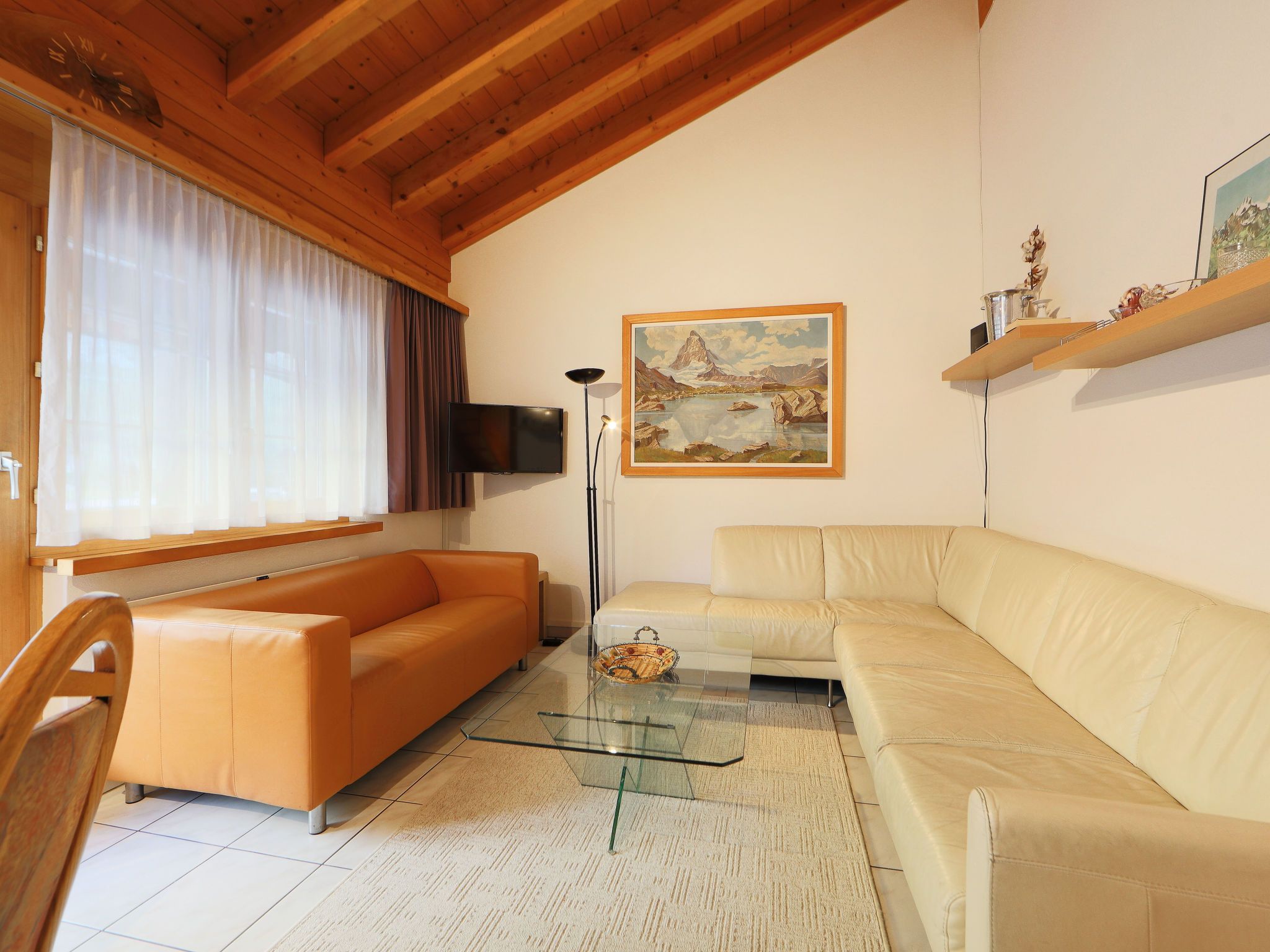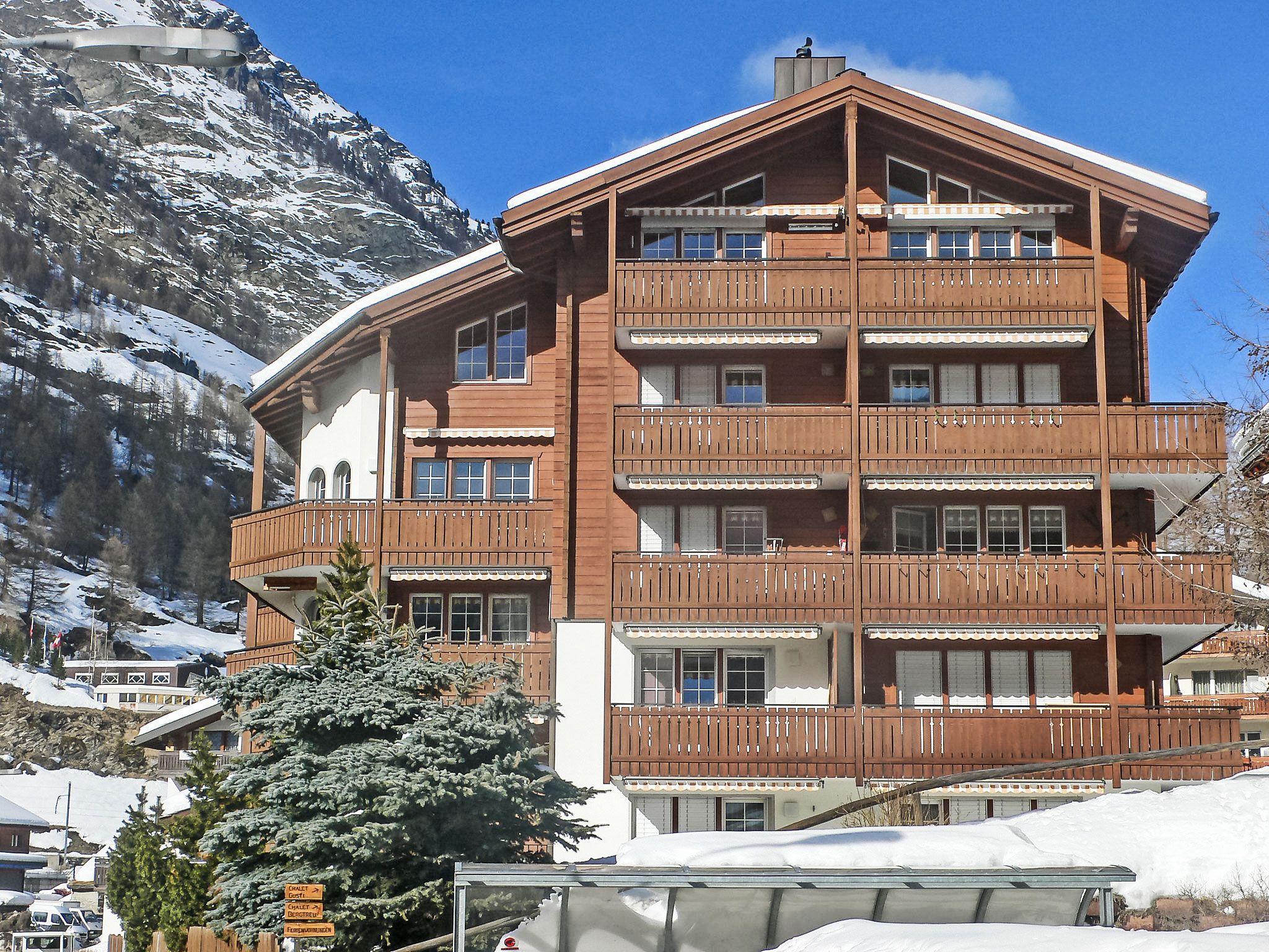 5-Zimmer-Wohnung 110 m2 auf 2 Stockwerken im 3. Stock, Südwestlage. Modern und geschmackvoll eingerichtet: Wohn-/Esszimmer 25 m2 mit Schwedenofen, Esstisch, TV und Radio. Ausgang zum Balkon. 1 Doppelzimmer mit 2 Betten. 1 Zimmer mit 2 Betten. Küche (Backofen, Geschirrspüler, 4 Glaskeramikplatten, Toaster, Wasserkocher, Mikrowelle, Tiefkühler, elektrische Kaffeemaschine, Racletteofen, Fondue Set (Chinoise, Käse)). Bad/WC. Obergeschoss: 2 Zimmer, jedes Zimmer mit 1 Doppelbett (1 x 160 cm, Länge 200 cm). Dusche/WC. Balkon. Balkonmöbel. Sehr schöne Sicht auf die Berge und auf das Matterhorn. Zur Verfügung: Haartrockner. Internet (WLAN, gratis). Bitte beachten: Nichtraucher-Unterkunft. Maximal 1 Haustier/Hund erlaubt.
