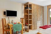 1-Zimmer-Wohnung 24 m2, im Erdgeschoss. Luxuriös und geschmackvoll eingerichtet: Wohn-/Schlafzimmer mit 1 Doppelbett, Esstisch, TV, Radio, CD und DVD. Ausgang zur Terrasse. Offene Küche im Eingang (Backofen, Geschirrspüler, 4 Induktionskochplatten, Toaster, Wasserkocher, elektrische Kaffeemaschine, Kapseln für die Kaffeemaschine (Nespresso) extra, Racletteofen, Fondue Set (Käse)). Dusche/WC. Kleine Terrasse, Westlage. Terrassenmöbel. Zur Verfügung: Safe, Haartrockner. Internet (WLAN, gratis). Bitte beachten: Nichtraucher-Unterkunft.