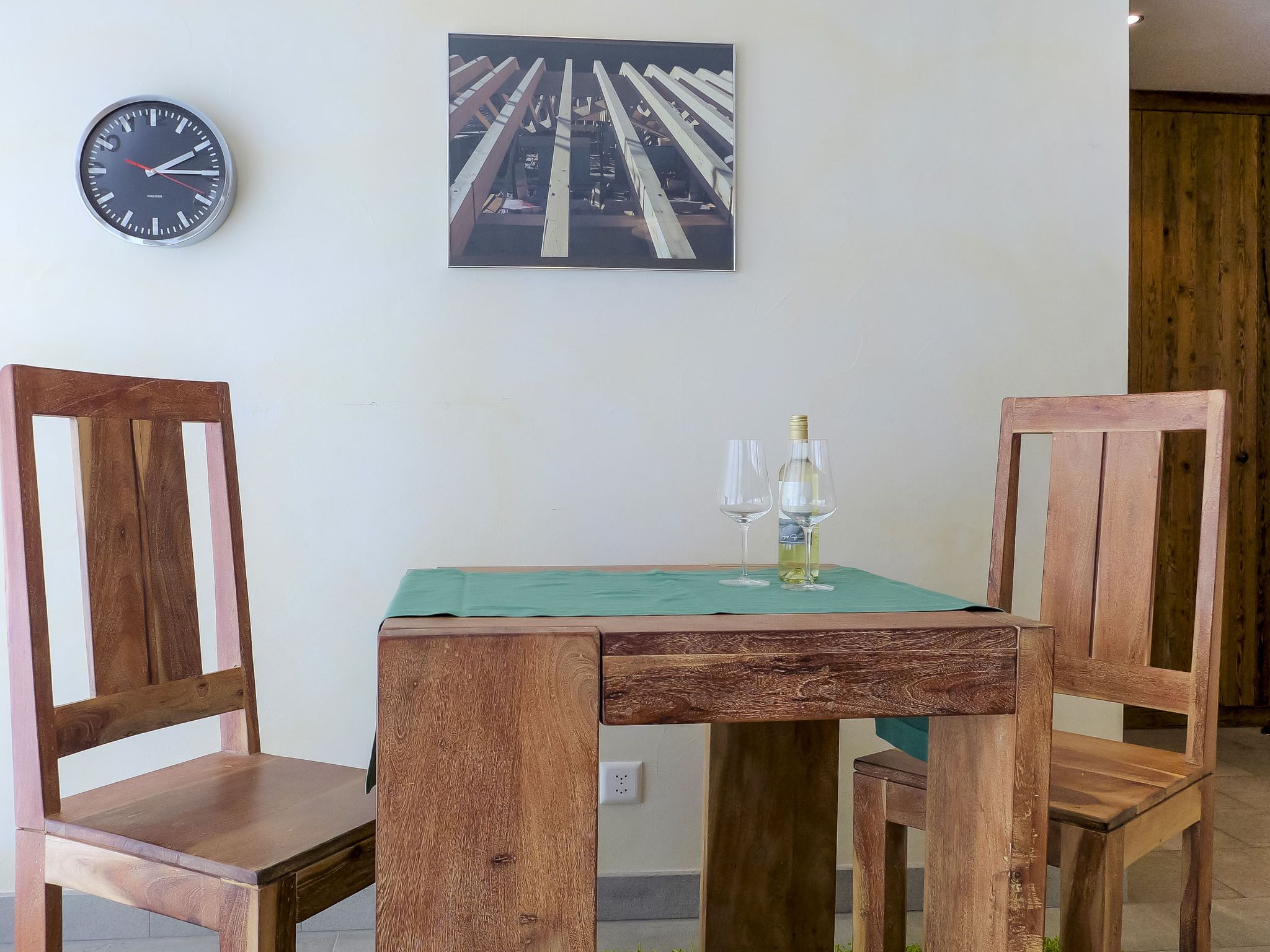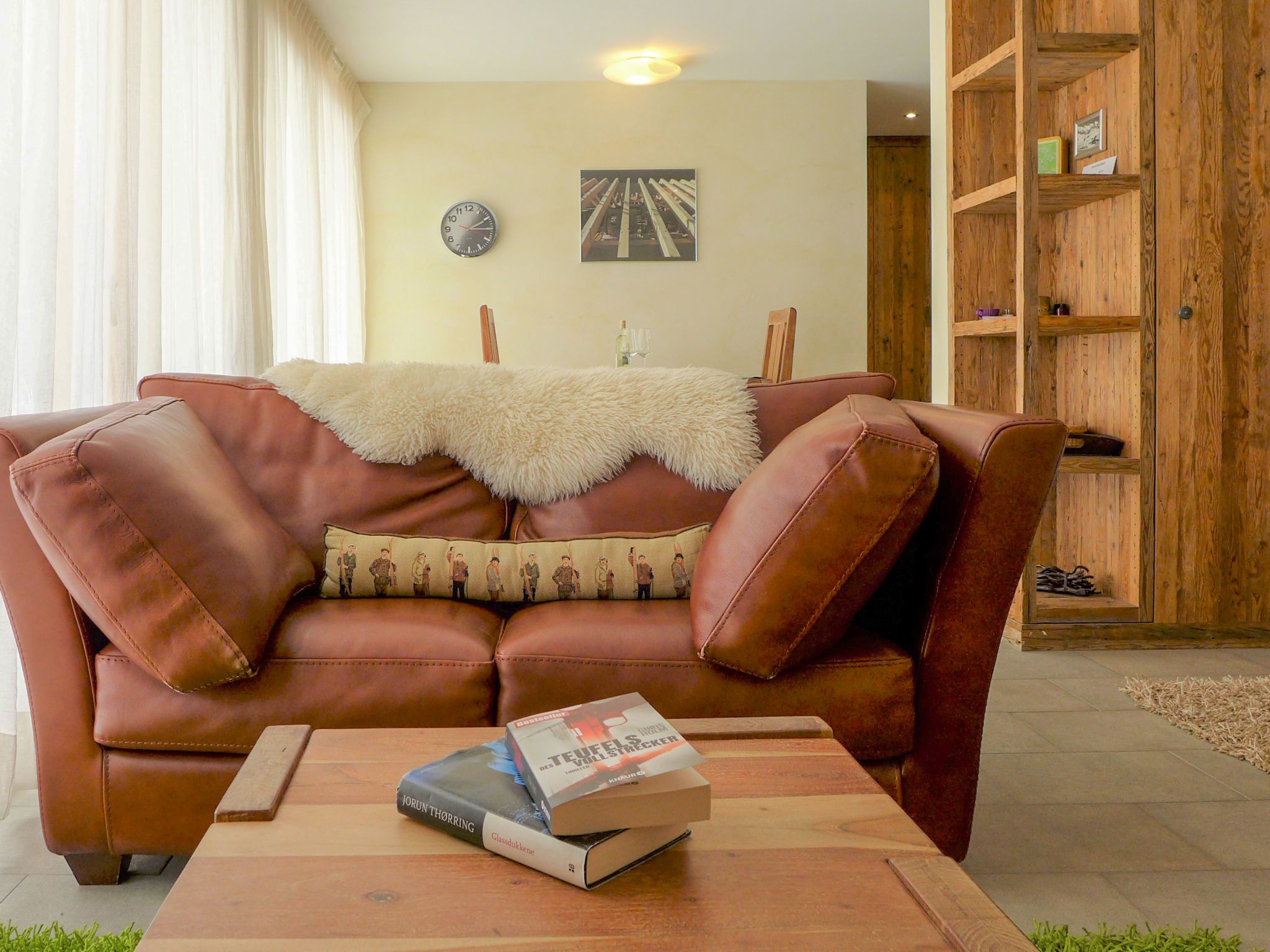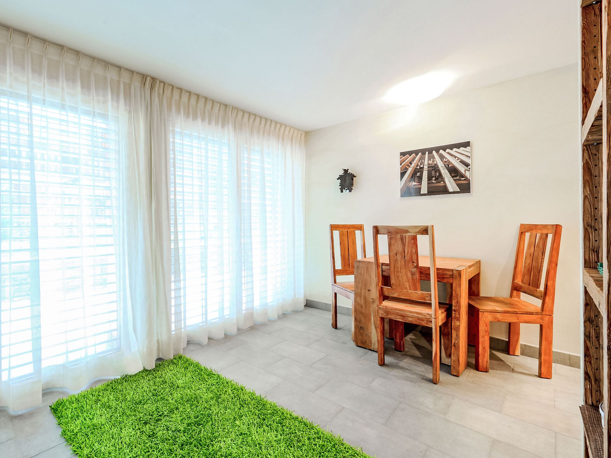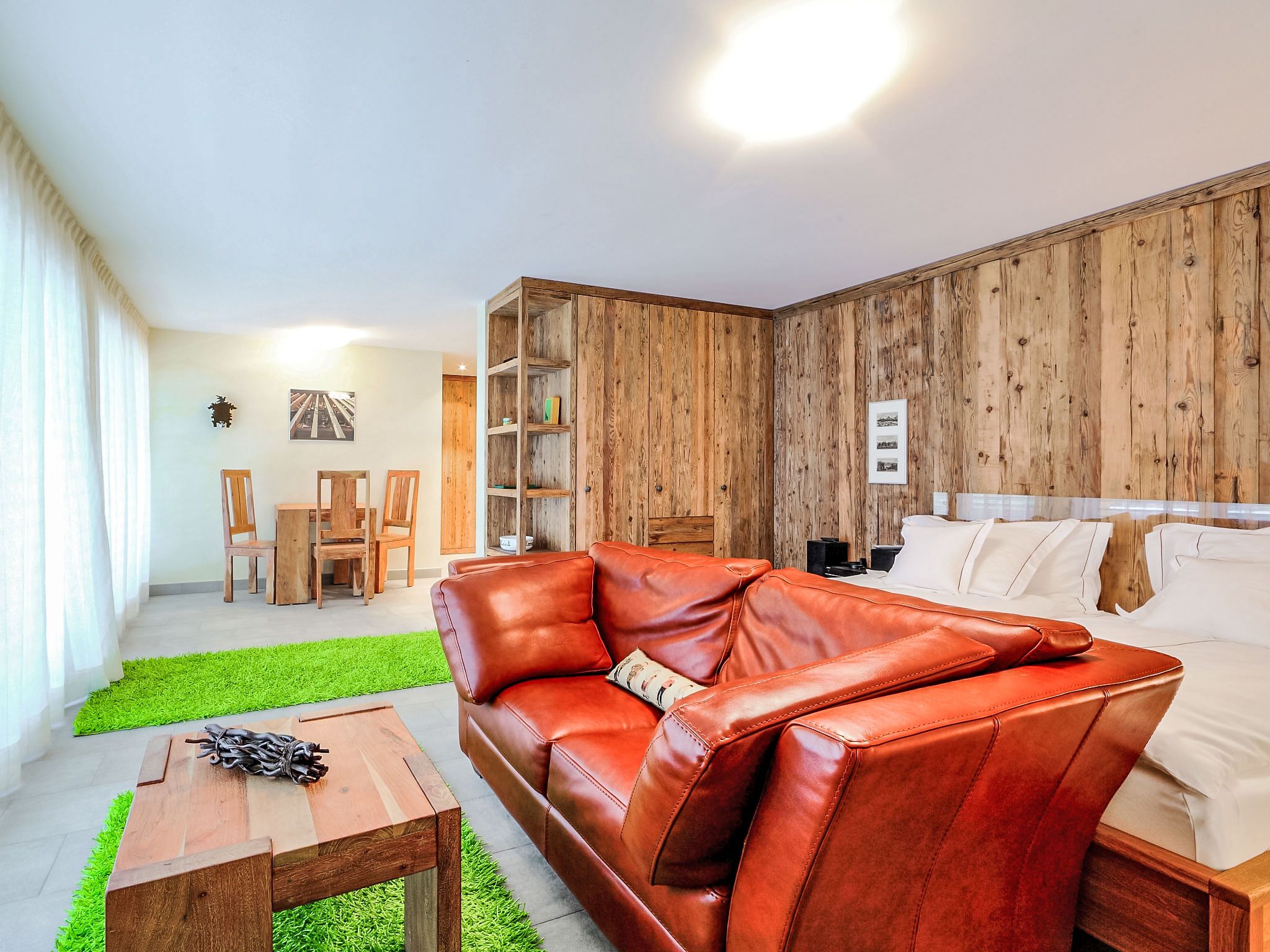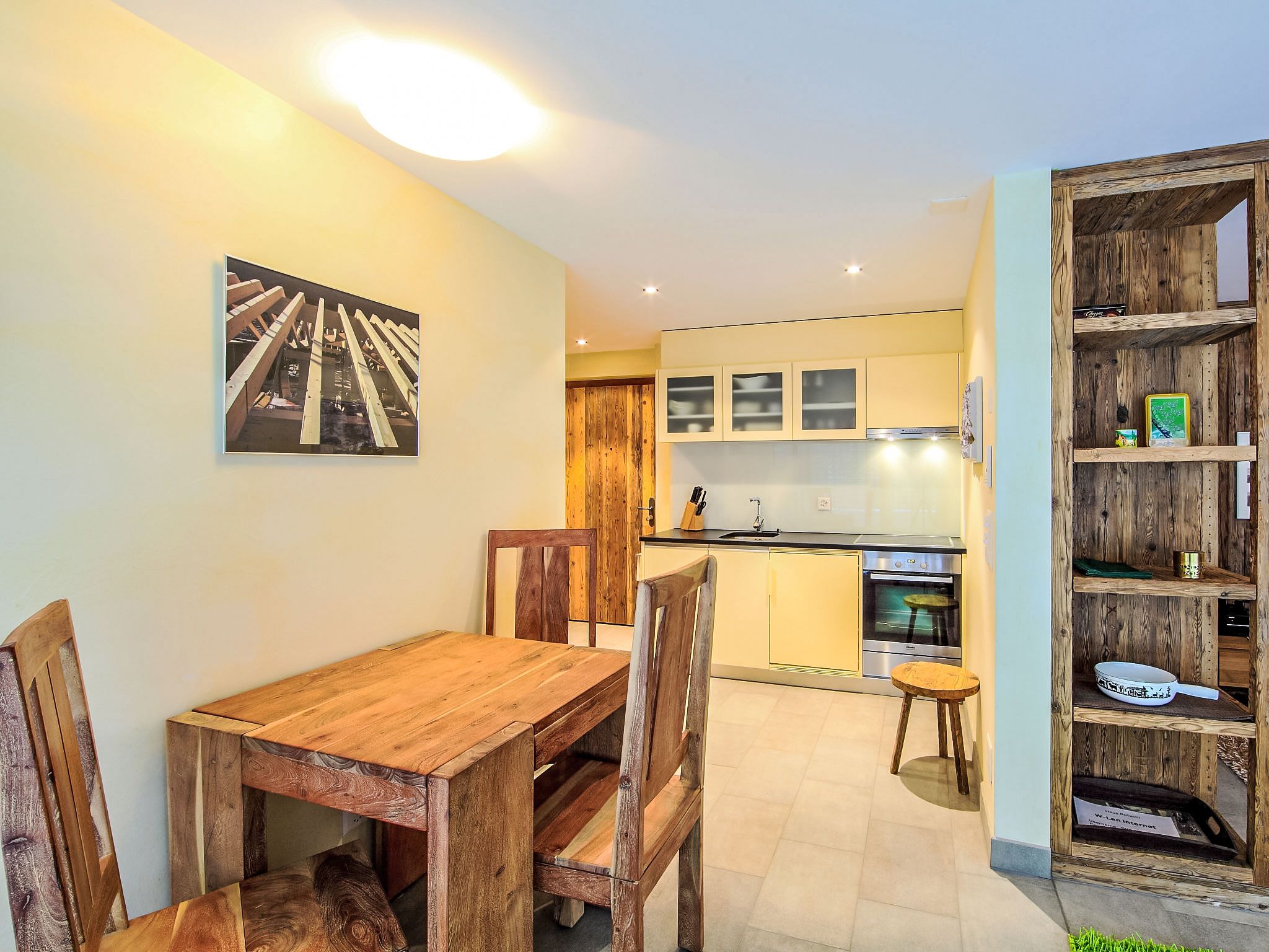 1-Zimmer-Wohnung 39 m2, im Erdgeschoss. Komfortabel und luxuriös eingerichtet: offenes Wohn-/Schlafzimmer mit 1 Doppelbett, Esstisch, TV, Radio, CD und DVD. Ausgang zur Terrasse. Offene Küche (Backofen, Geschirrspüler, 4 Induktionskochplatten, Toaster, Wasserkocher, Tiefkühler, elektrische Kaffeemaschine, Kapseln für die Kaffeemaschine (Nespresso) extra, Fondue Set (Käse)). Bad/WC, Whirlbadewanne. Kleine Terrasse. Terrassenmöbel. Zur Verfügung: Safe, Haartrockner. Internet (WLAN, gratis). Bitte beachten: Nichtraucher-Unterkunft.