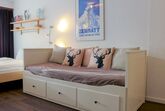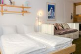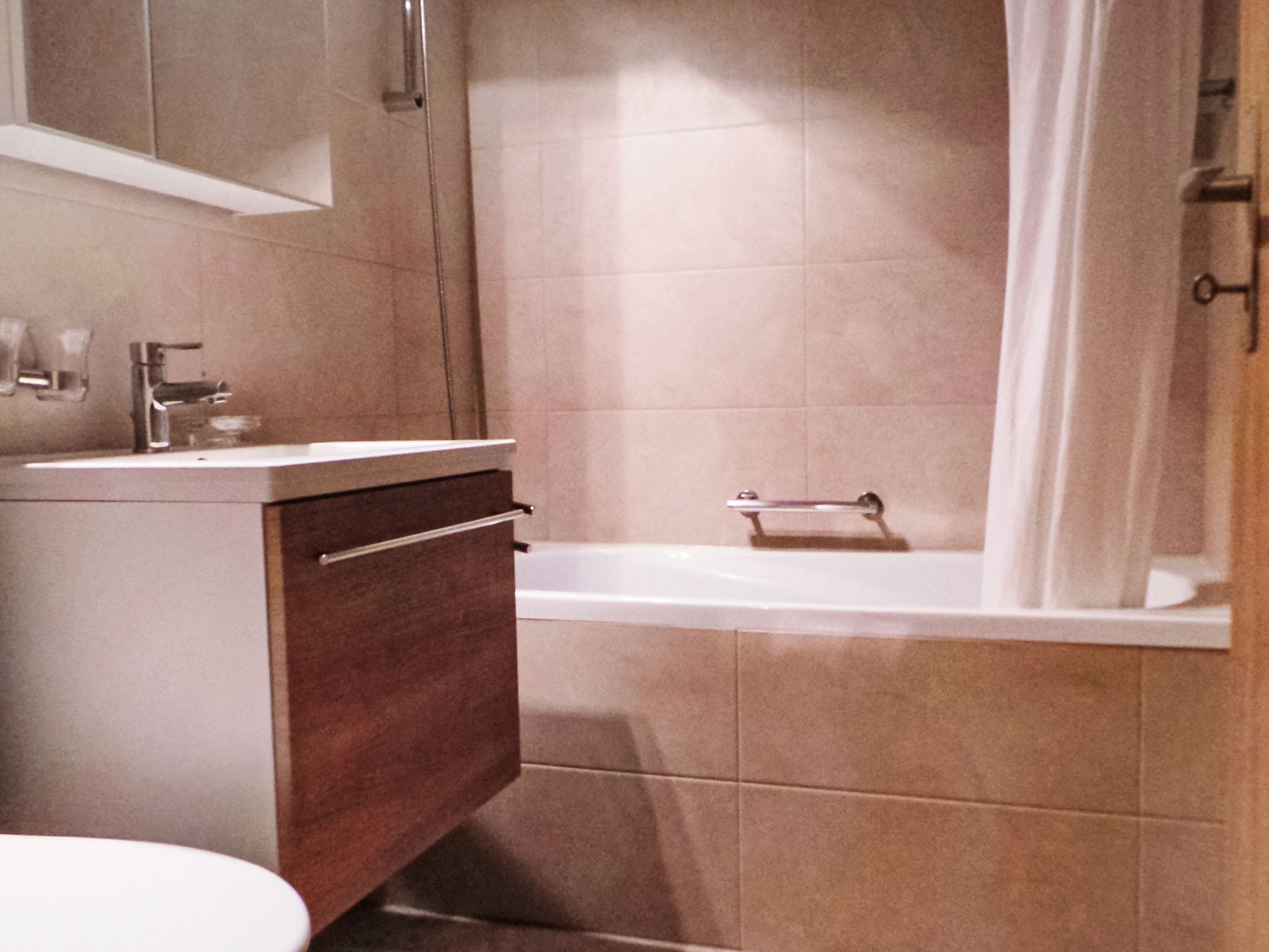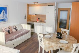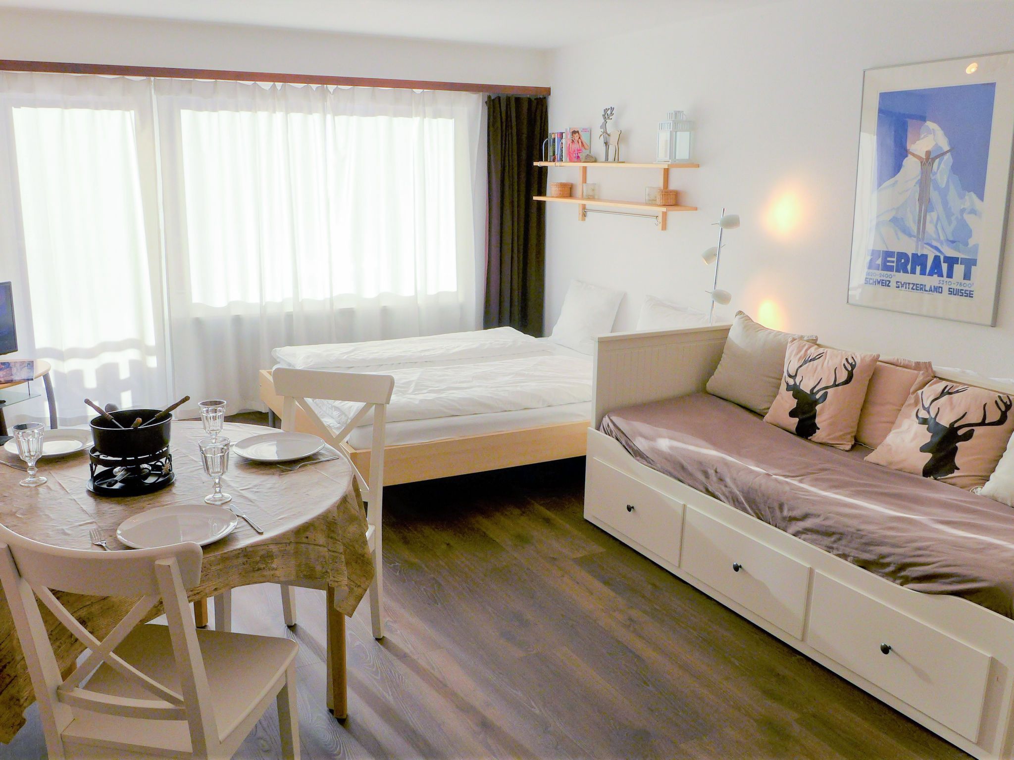 1-Zimmer-Wohnung 35 m2 im 2. Stock, Südlage. Hell, einfach und gemütlich eingerichtet: Wohn-/Schlafzimmer mit 1 Diwanbett (90 cm, Länge 200 cm), 1 Doppelbett (160 cm, Länge 200 cm), Esstisch und TV. Ausgang zum Balkon. Offene Küche (Backofen, 4 Glaskeramikplatten, Toaster, Wasserkocher, Tiefkühler, elektrische Kaffeemaschine, Racletteofen, Fondue Set (Käse)). Bad/WC. Balkon 7 m2, Südlage. Balkonmöbel. Schöne Sicht auf Matterhorn. Zur Verfügung: Haartrockner. Bitte beachten: Nichtraucher-Unterkunft. Kein Internet.