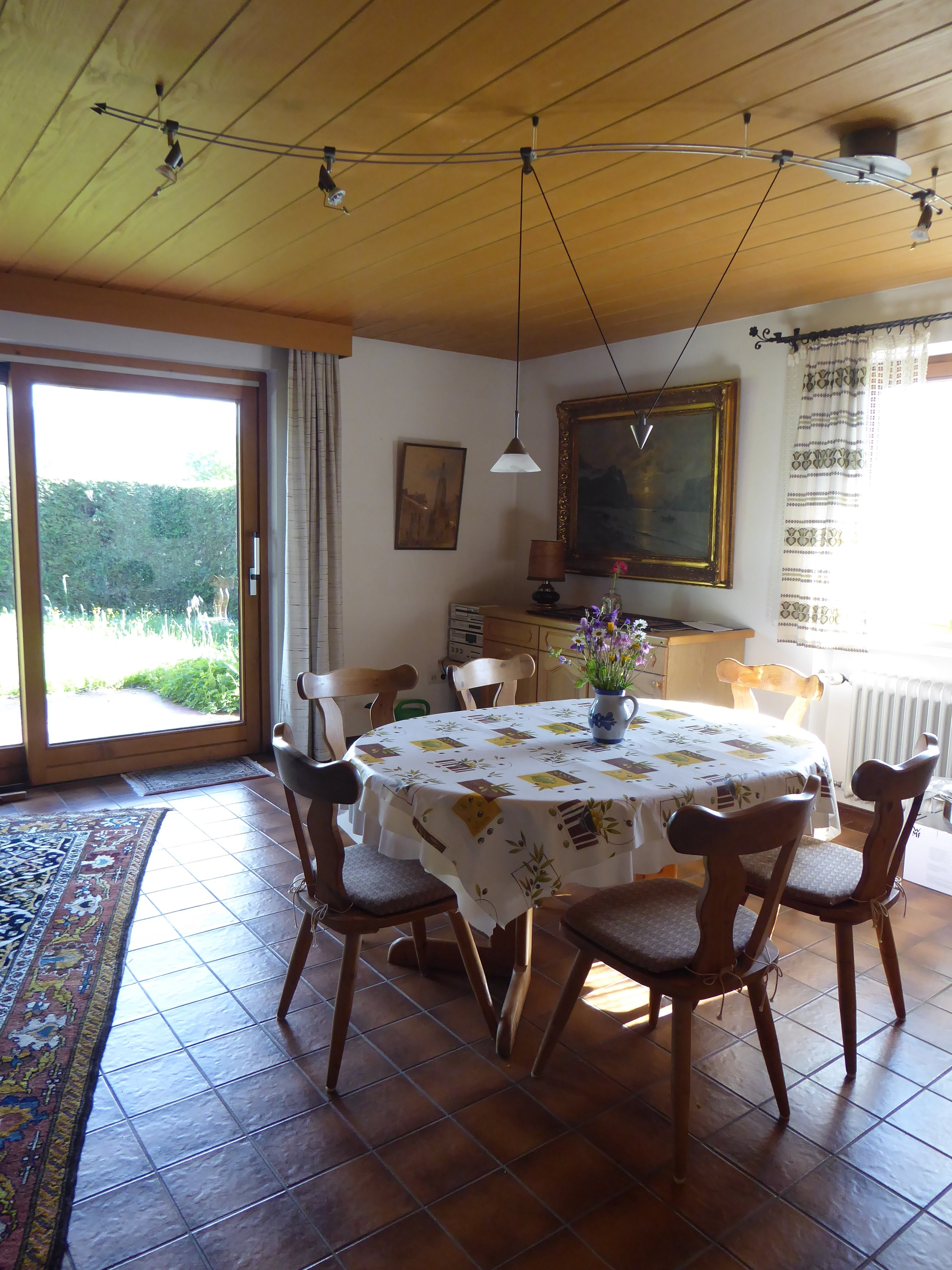 Zur kurzen Übersicht: sehr ruhige Lage - angrenzende Wiesen, Aussicht zum Moos und Zugspitze, 2 PKW Stellplätze, ca. 153 qm Wohnfläche: 3 getrennte Schlafzimmer (2 Schlafzimmer mit Doppelbetten und ein Schlafzimmer mit Einzelbetten), 2 Bäder mit Toiletten, 1 Gästetoilette, Wohnküche mit vielen Geräten, Geschirrspülmaschine, großes Wohn- und Esszimmer mit Ausgang zum Garten mit Gartenhaus. Hobbyraum mit Tischtennisplatte. Maximal bis zu 6 Personen + 1 Kleinkind (Babybett, Hochstuhl, Wickelauflage vorhanden), Waschmaschine und Wäschetrockner. Keine Haustiere. Rauchfreies Haus. Bettwäsche muss mitgebracht werden, Küchenhandtücher werden gestellt. Verkehrsabgabe wird gesondert berechnet.