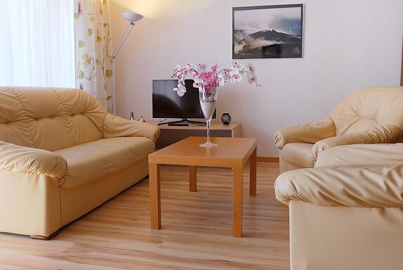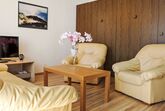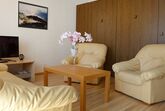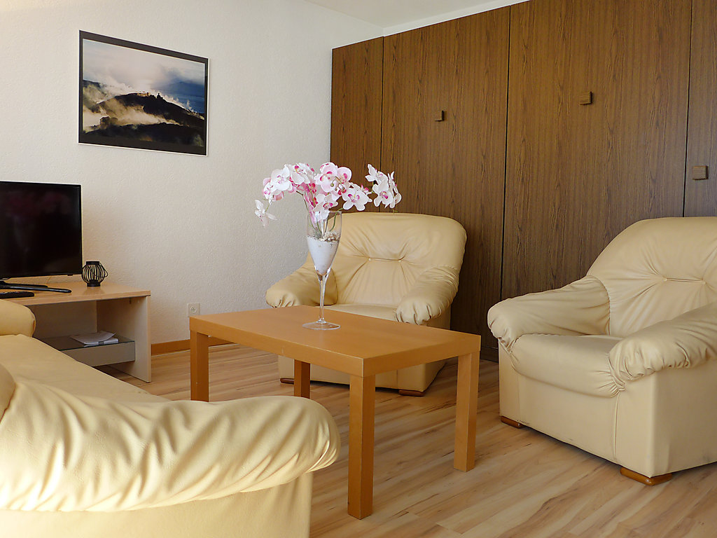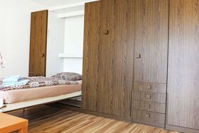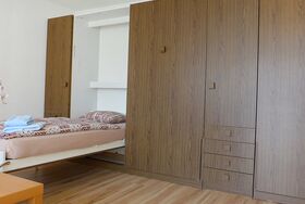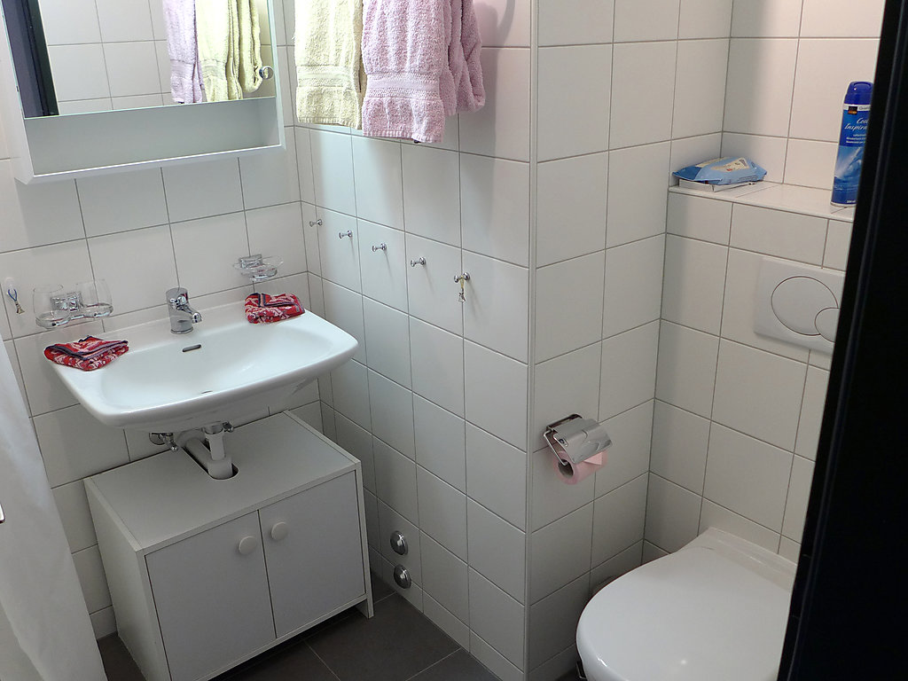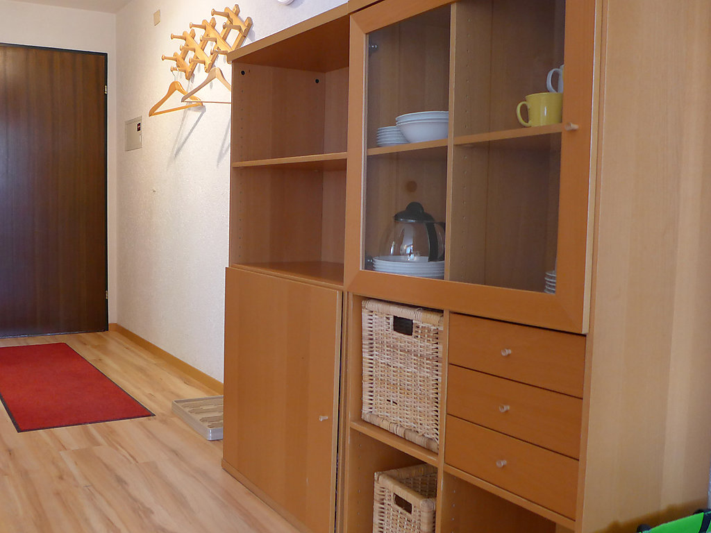 2-Zimmer-Wohnung 64 m2 im 1. Stock, Südlage. Hell, einfach und gemütlich eingerichtet: Wohn-/Schlafzimmer mit 3 Wandschrankbetten (90 cm, Länge 200 cm), TV. Ausgang zum Balkon, Richtung Süden. 1 Zimmer mit 1 Doppelbett (2 x 90 cm, Länge 200 cm). Küche (Backofen, 4 Glaskeramikplatten, Toaster, Wasserkocher, Mikrowelle, Tiefkühler, elektrische Kaffeemaschine, Racletteofen, Fondue Set (Käse)). Dusche/WC. Heizung. Grosser Balkon, Südlage und Westlage. Balkonmöbel. Schöne Sicht auf die Berge. Zur Verfügung: Haartrockner. Internet (Wireless LAN, gratis). Bitte beachten: Nichtraucher-Unterkunft.