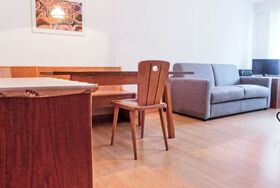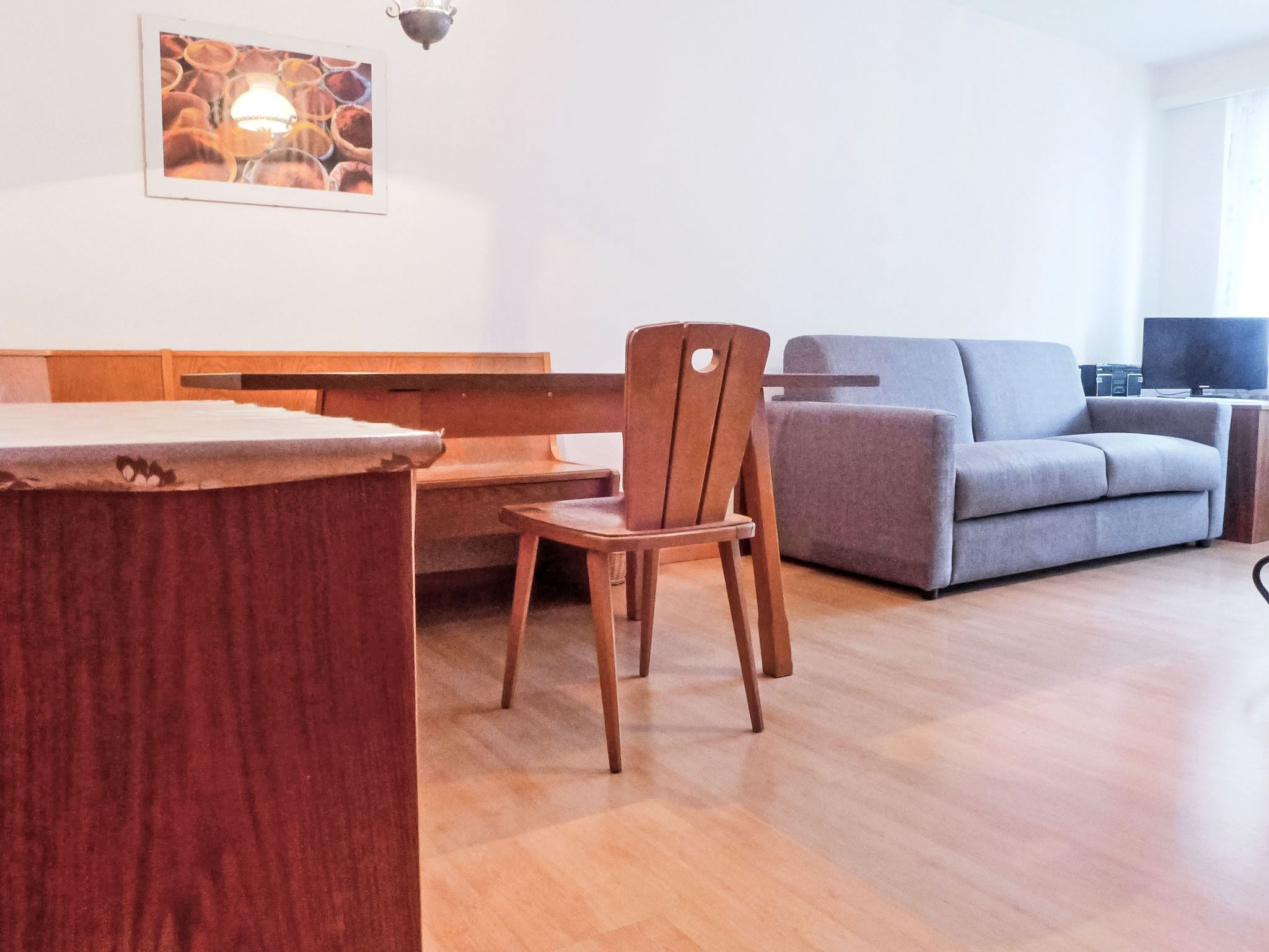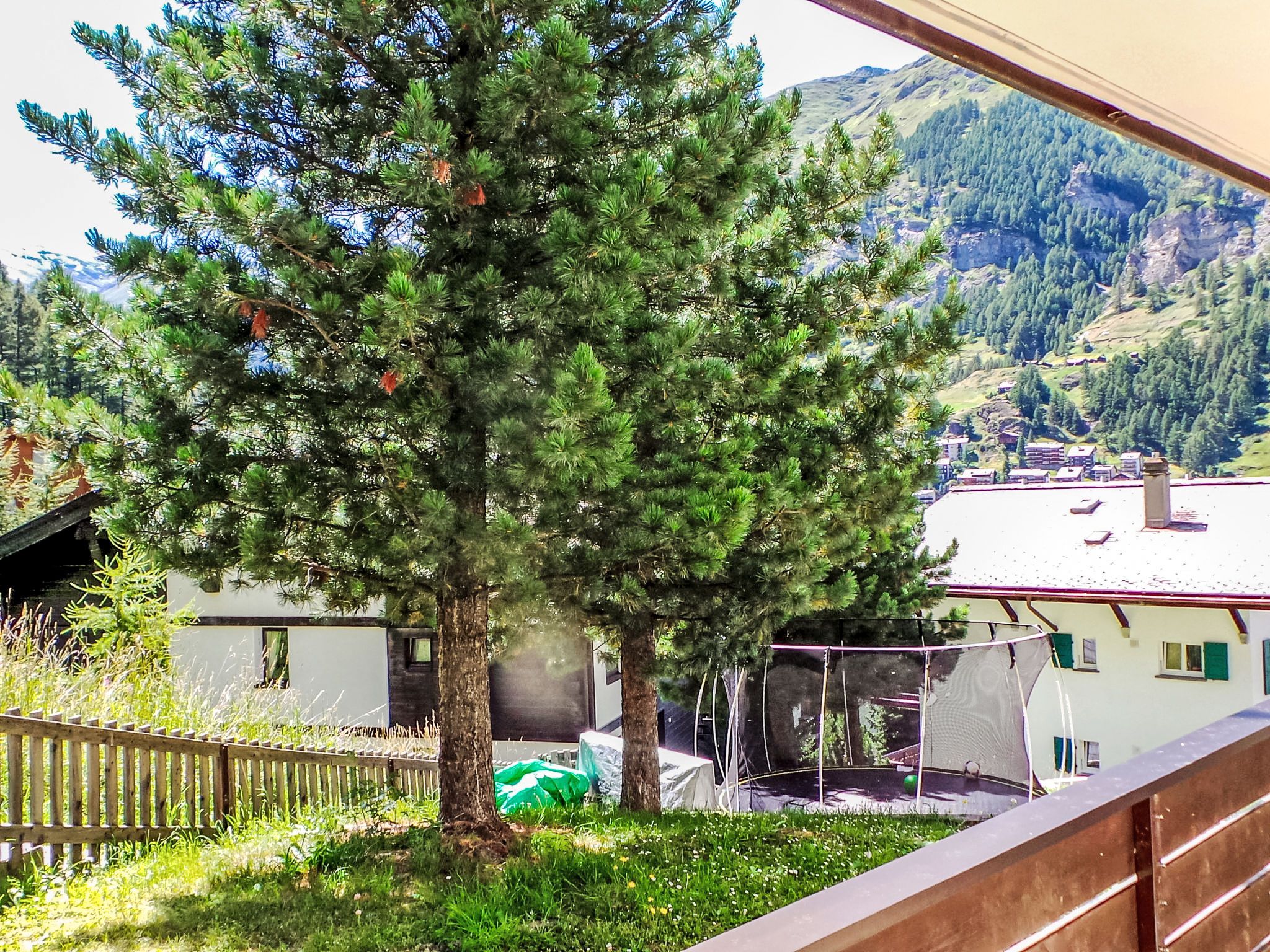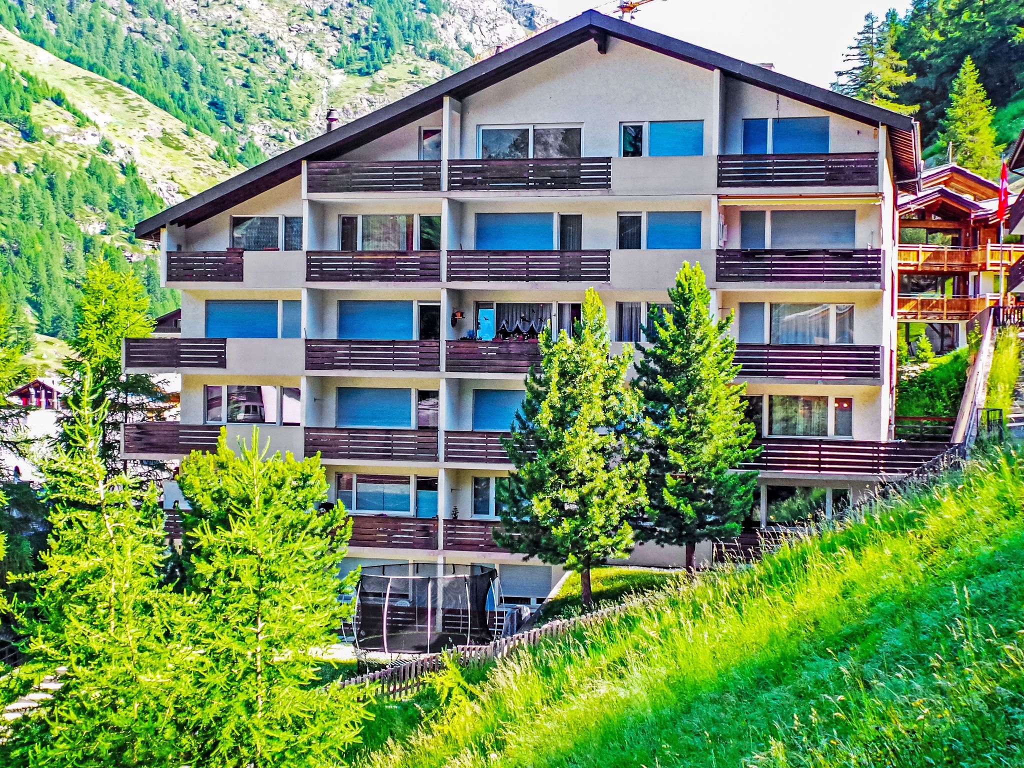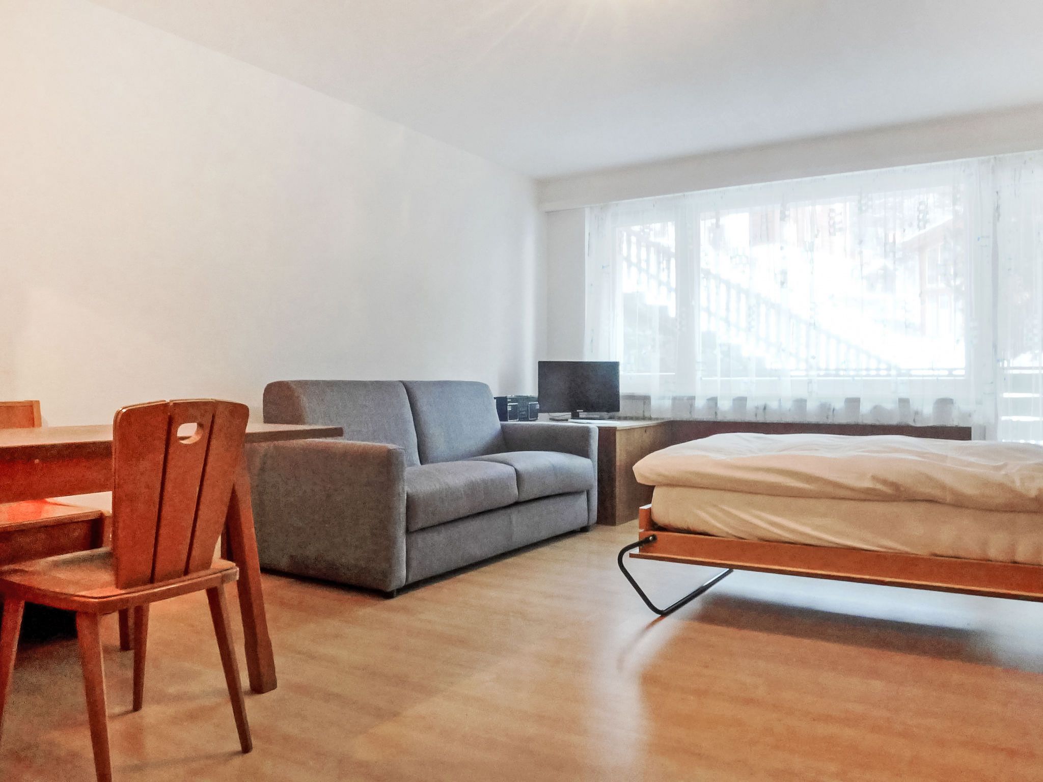 1-Zimmer-Wohnung 40 m2, im erhöhten Erdgeschoss. Einfach und komfortabel eingerichtet: Wohn-/Schlafzimmer mit 2 Wandklappbetten (90 cm, Länge 200 cm), Esstisch und TV. Ausgang zum Balkon. Küche (3 Kochplatten, Backofen, Toaster, Wasserkocher, Tiefkühler, elektrische Kaffeemaschine). Bad/WC. Balkon 8 m2, Südlage. Balkonmöbel. Eingeschränkte Sicht auf die Berge und das Matterhorn. Zur Verfügung: Haartrockner. Internet (WLAN, gratis). Bitte beachten: Nichtraucher-Unterkunft. Maximal 1 Haustier/Hund erlaubt. Die Sicht auf das Matterhorn, wird durch 2 Bäume behindert.