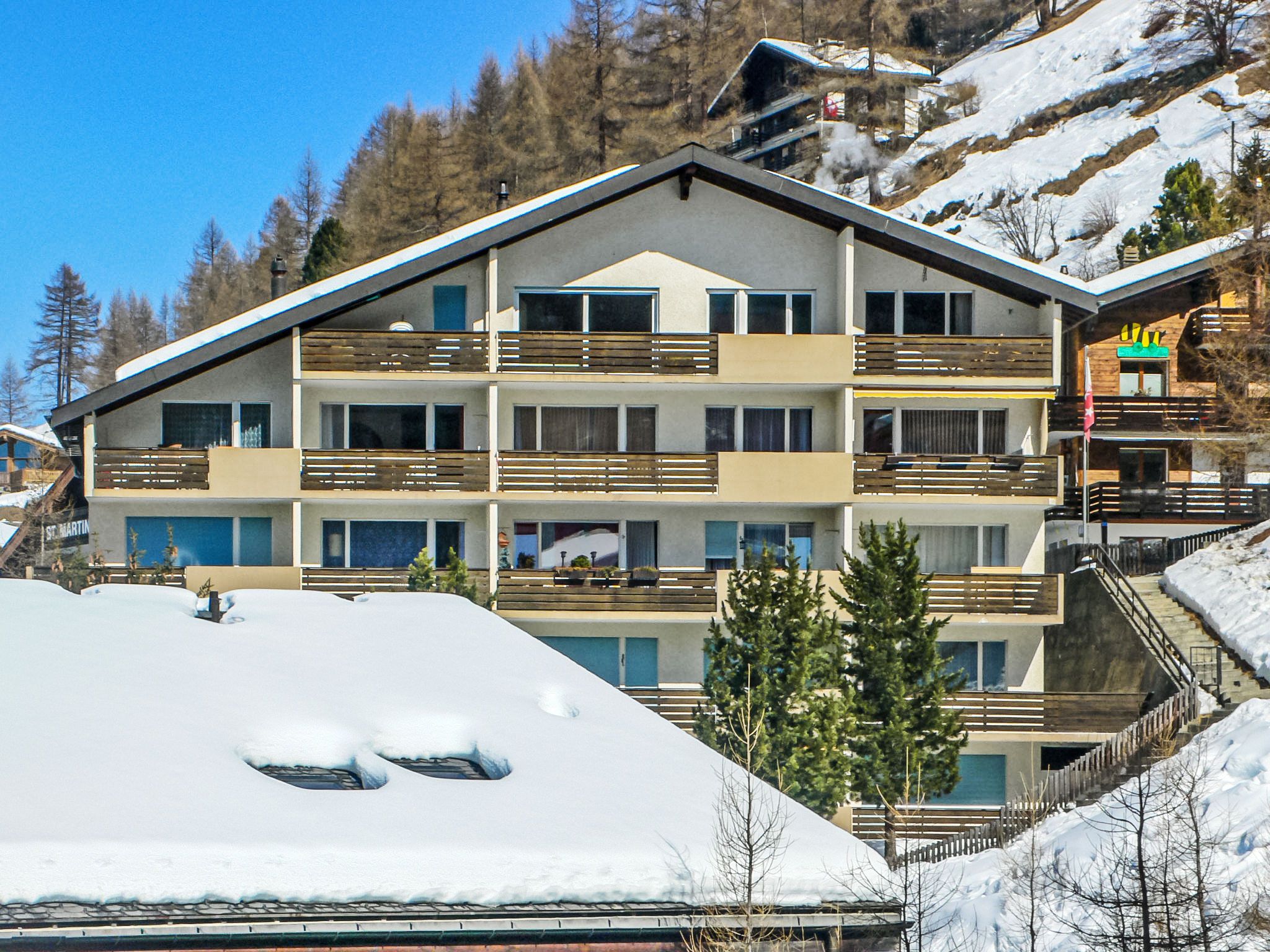 Grosses, einfaches Mehrfamilienhaus Kondor, auf 5 Stockwerken. Im Ortsteil Gryfelblatte, 600 m vom Zentrum von Zermatt, ruhige, sonnige, erhöhte Lage am Hang. Im Hause: Fahrstuhl, Skiraum, Zentralheizung. Treppenweg (96 Stufen) bis zum Haus. Supermarkt 450 m, Restaurant 70 m, Bäckerei 600 m, Zentrum zu Fuss in 10 Minuten erreichbar, Bushaltestelle Wiestibrücke 230 m, Bahnstation Bahnhof Zermatt 600 m. Bergeisenbahn, Skiverleih 450 m, Skibushaltestelle 230 m, Skischule 850 m, Kinderskischule. Taxi kann nicht bis zum Haus fahren. Die Schlüsselübergabe findet bei der Agentur Interhome in Zermatt statt.