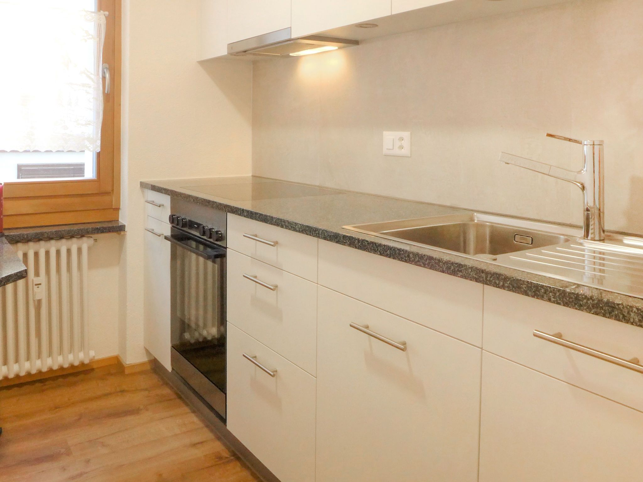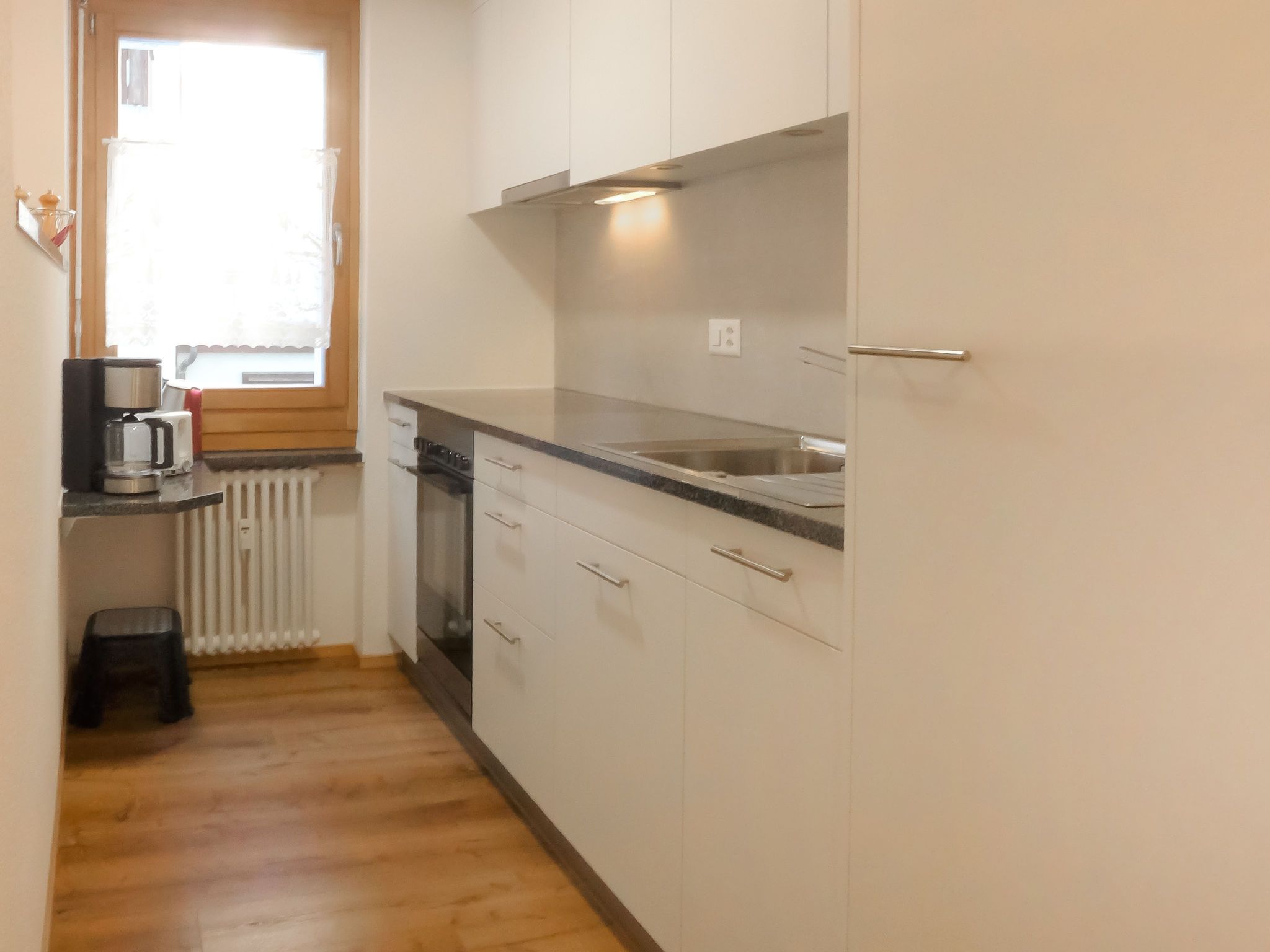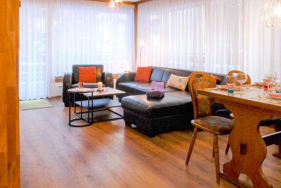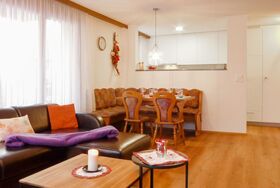 2-Zimmer-Wohnung 48 m2 im 1. Stock. Geräumig und hell, teilweise renoviert im Jahre 2021, schön und gemütlich eingerichtet: Wohn-/Esszimmer mit Essecke und TV. Ausgang zum Balkon. 1 Doppelzimmer mit 1 Doppelbett (2 x 100 cm, Länge 200 cm). Offene Küche (Backofen, Geschirrspüler, 4 Glaskeramikplatten, Toaster, Wasserkocher, Tiefkühler, elektrische Kaffeemaschine, Fondue Set (Käse)). Bad/WC. Grosser Balkon. Sicht auf die Berge. Zur Verfügung: Haartrockner. Internet (Wireless LAN). Bitte beachten: Nichtraucher-Unterkunft.