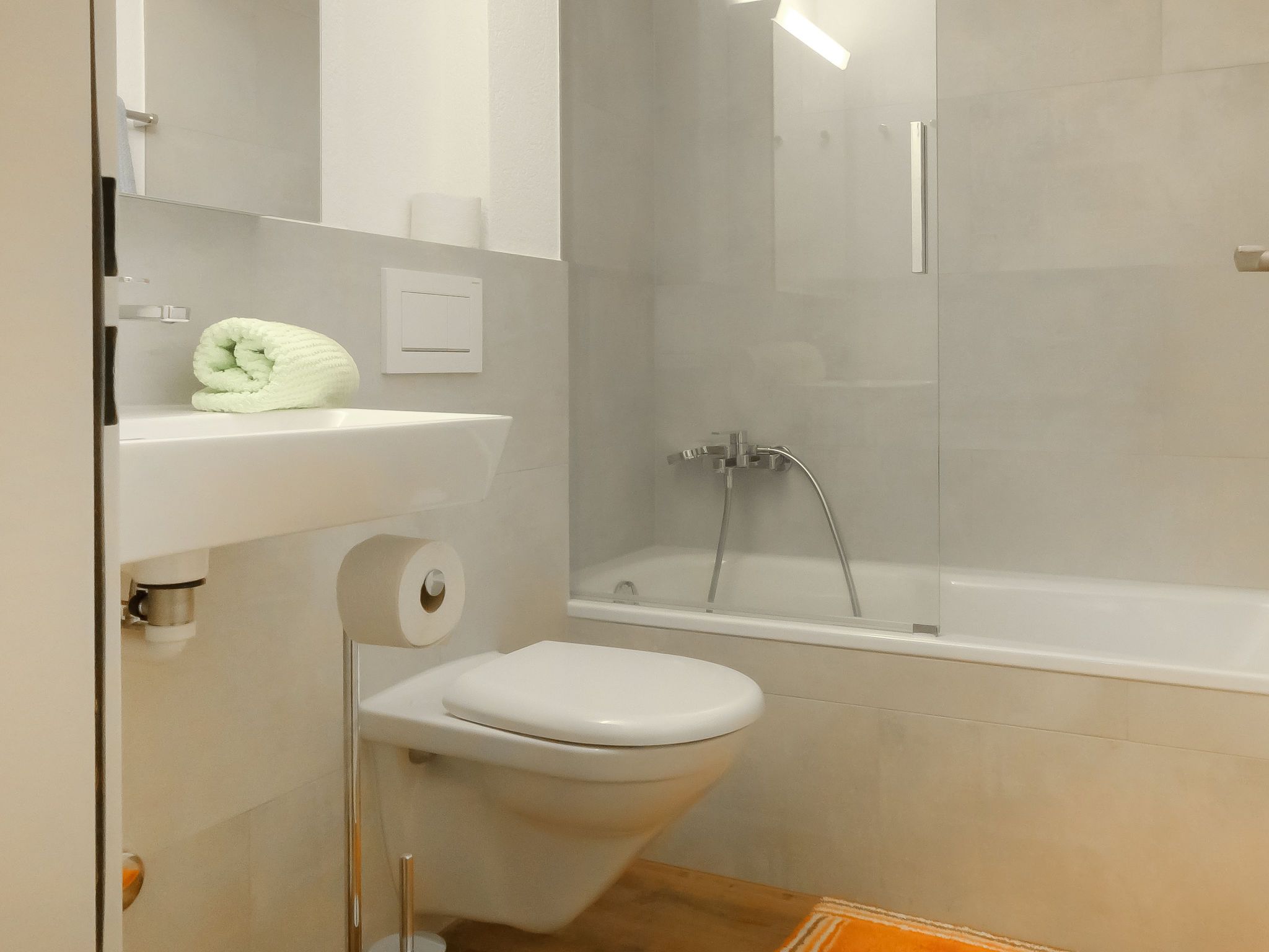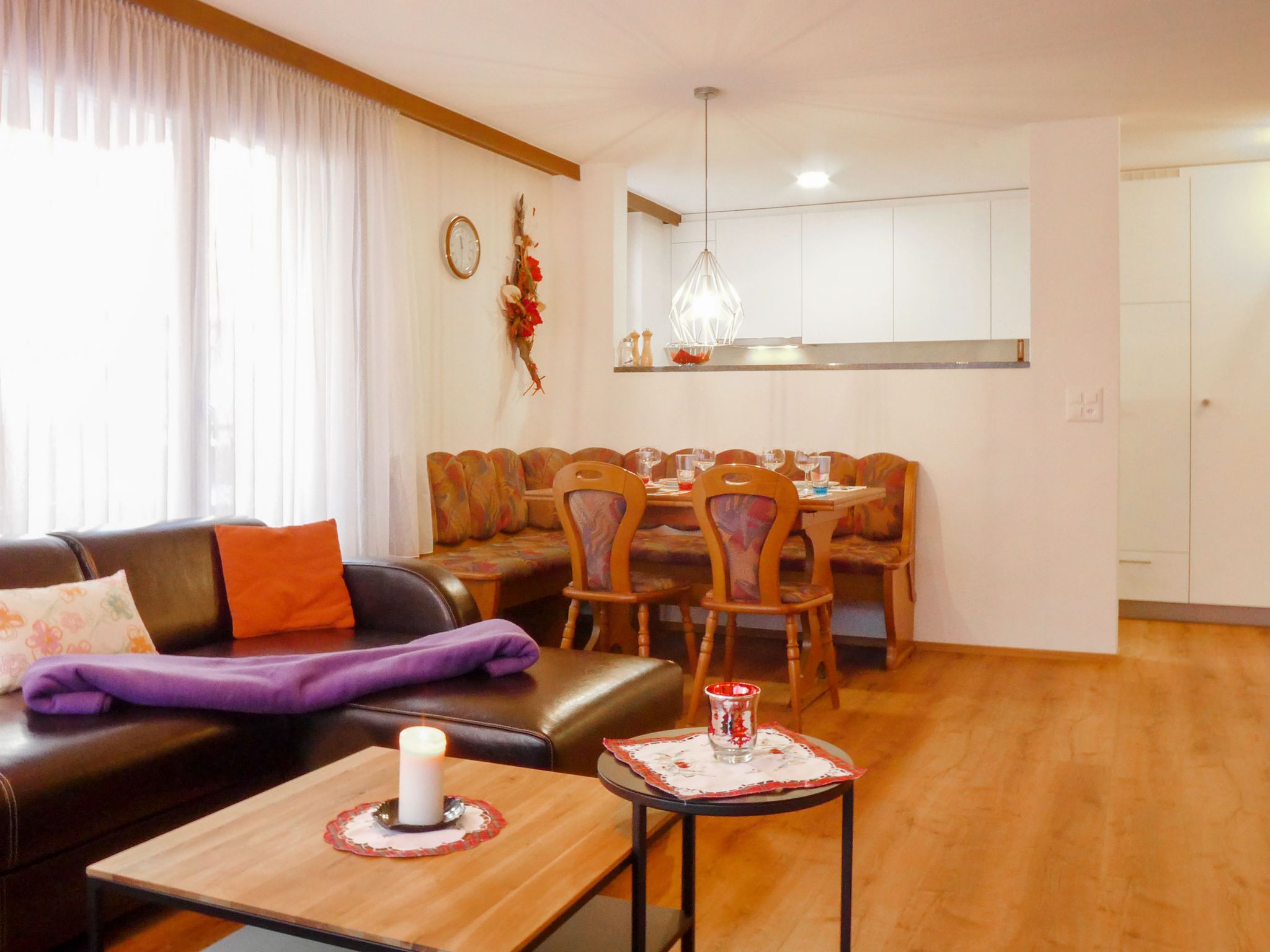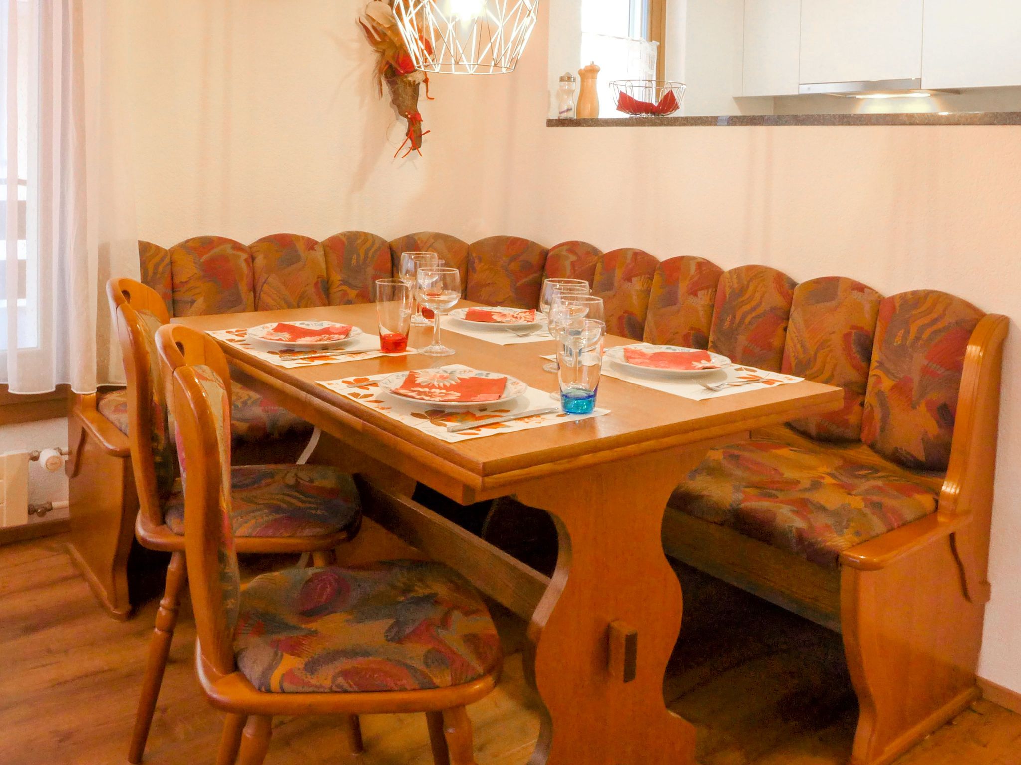 2-Zimmer-Wohnung 48 m2 im 1. Stock. Geräumig und hell, teilweise renoviert im Jahre 2021, schön und gemütlich eingerichtet: Wohn-/Esszimmer mit Essecke und TV. Ausgang zum Balkon. 1 Doppelzimmer mit 1 Doppelbett (2 x 100 cm, Länge 200 cm). Offene Küche (Backofen, Geschirrspüler, 4 Glaskeramikplatten, Toaster, Wasserkocher, Tiefkühler, elektrische Kaffeemaschine, Fondue Set (Käse)). Bad/WC. Grosser Balkon. Sicht auf die Berge. Zur Verfügung: Haartrockner. Internet (Wireless LAN). Bitte beachten: Nichtraucher-Unterkunft.