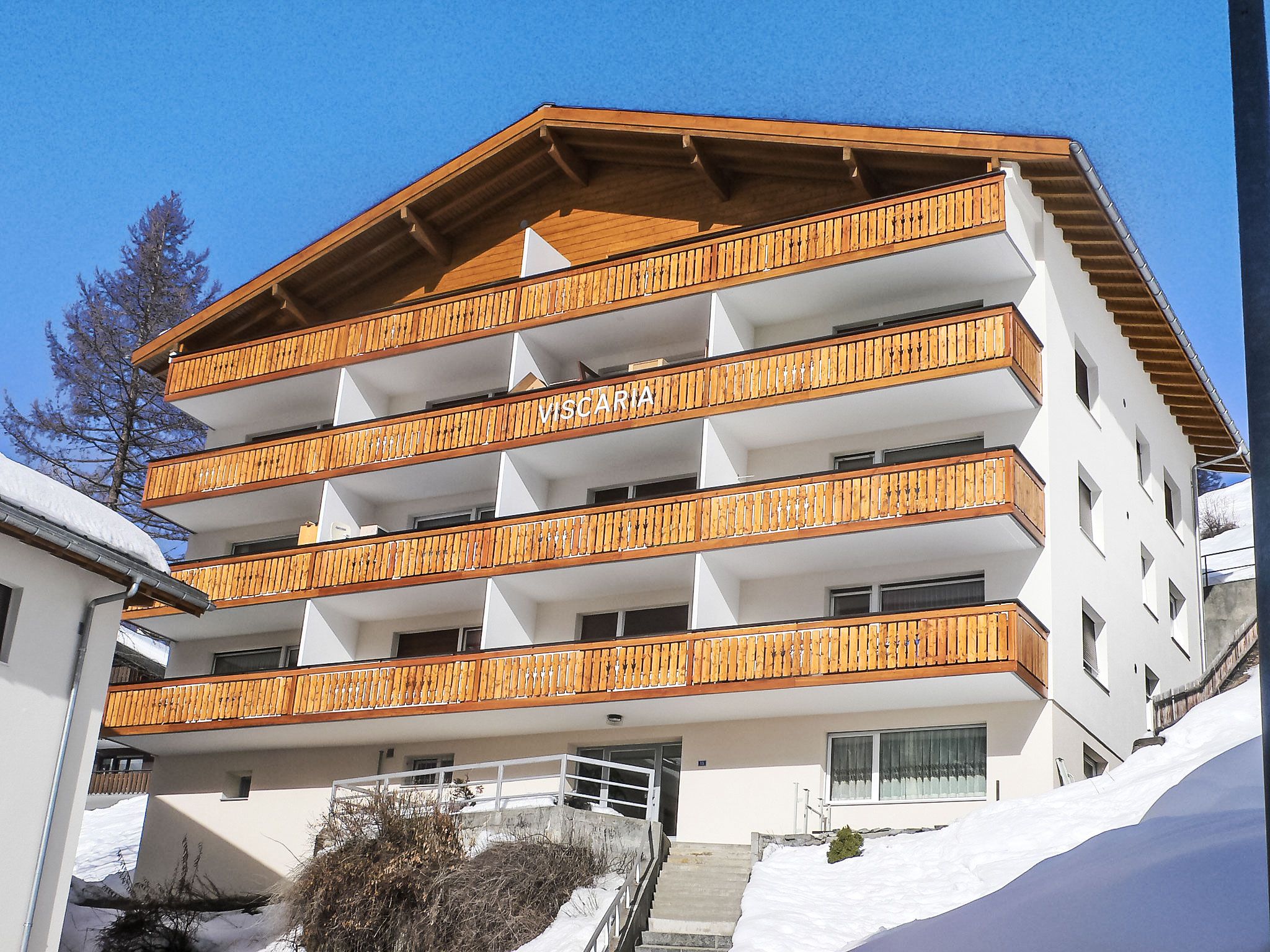 Grosses Mehrfamilienhaus Viscaria, auf 5 Stockwerken. Im Ortsteil Spiss, 600 m vom Zentrum von Zermatt, ruhige, sonnige Lage am Hang. Im Hause: Fahrstuhl, Skiraum, Zentralheizung. Zufahrt bis 100 m zum Haus. Treppenweg (82 Stufen) bis zum Haus. Supermarkt 450 m, Restaurant 650 m, Bäckerei 650 m, Zentrum zu Fuss in 20 Minuten erreichbar, Bushaltestelle Spiss 100 m, Bahnstation Bahnhof Zermatt 650 m. Bergeisenbahn 600 m, Skiverleih 600 m, Skibushaltestelle 100 m, Skischule 1 km, Kinderskischule 1 km. Taxi kann nicht bis zum Haus fahren. Bitte beachten: Die Schlüsselübergabe findet bei der Agentur Interhome in Zermatt statt. Weitere Unterkünfte sind buchbar.