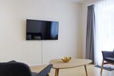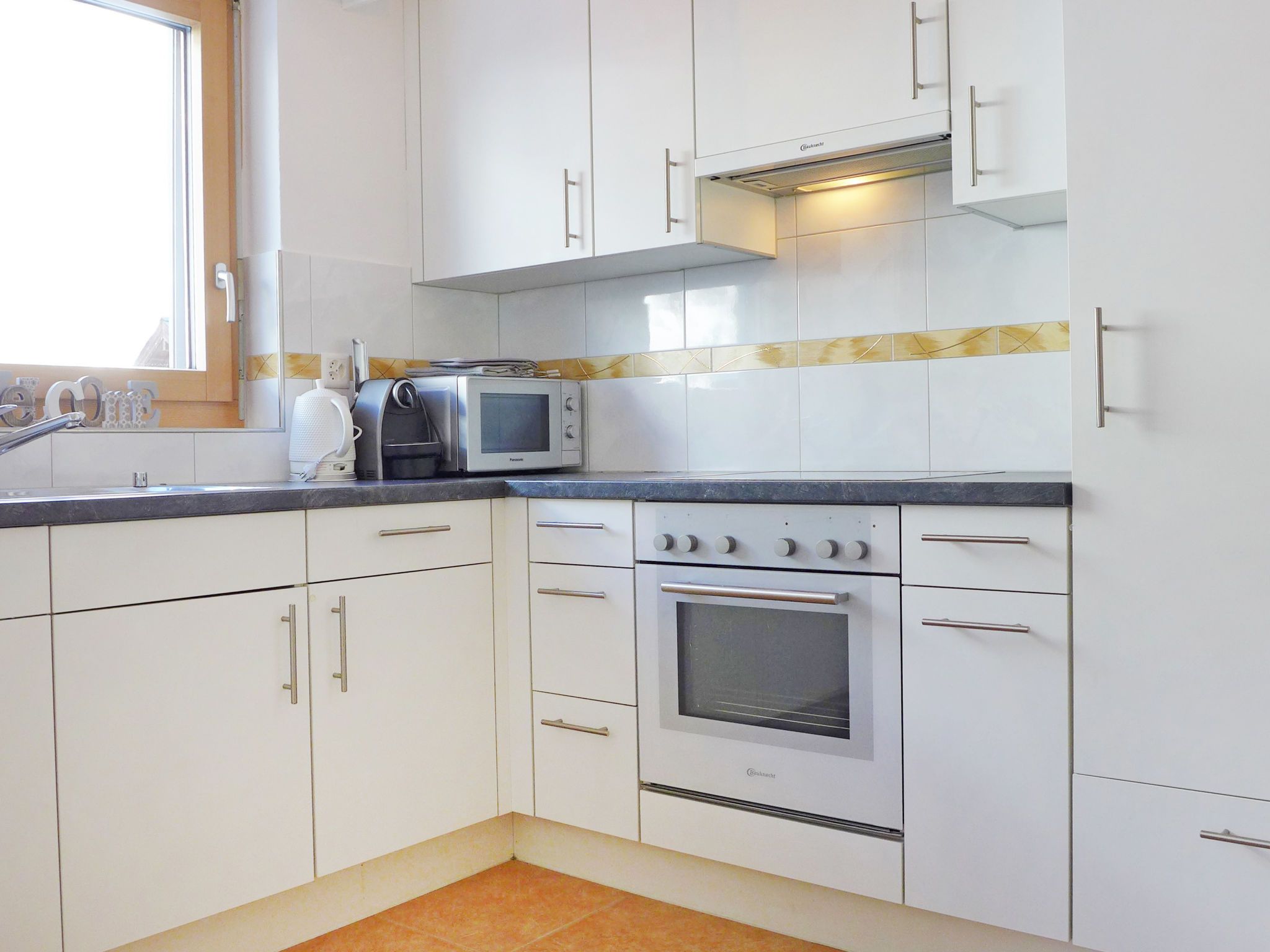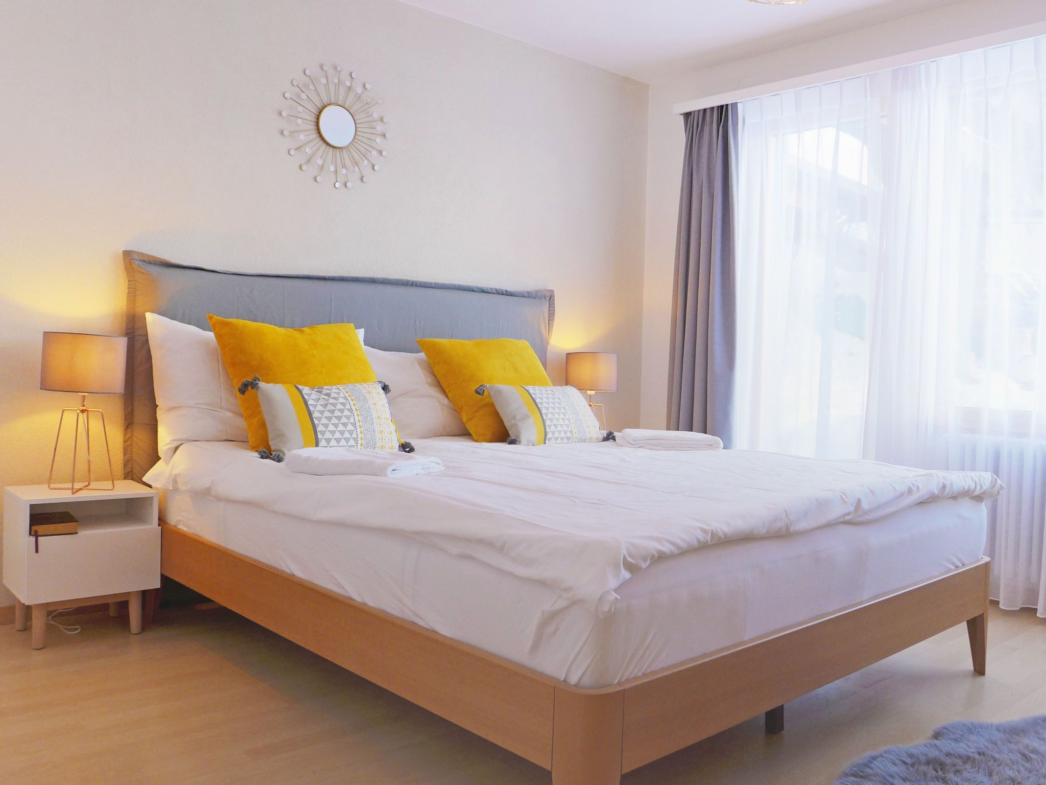 2-Zimmer-Wohnung 49 m2, im Erdgeschoss. Hell, renoviert im Jahre 2019, schön und modern eingerichtet: Wohn-/Schlafzimmer mit 1 Doppelwandschrankbett (2 x 90 cm, Länge 180 cm), Esstisch und TV. Ausgang zur Terrasse, Richtung Süden. 1 Doppelzimmer mit 1 Doppelbett (1 x 160 cm, Länge 200 cm). Offene Küche (Backofen, Geschirrspüler, 4 Glaskeramikplatten, Toaster, Wasserkocher, Mikrowelle, Tiefkühler, elektrische Kaffeemaschine) mit Esstisch. Dusche/WC. Heizung. Terrasse, Südlage. Eingeschränkte Sicht auf das Matterhorn. Zur Verfügung: Haartrockner. Internet (Wireless LAN, gratis). Bitte beachten: Nichtraucher-Unterkunft.