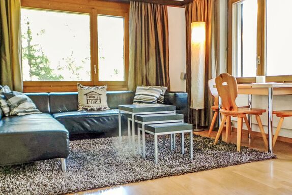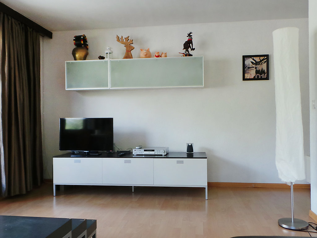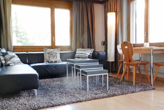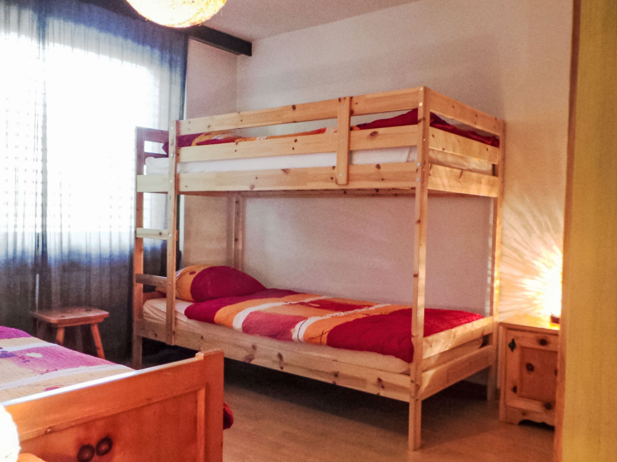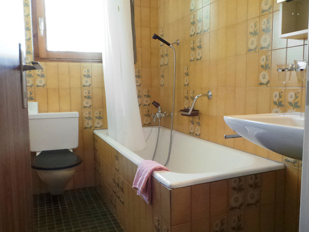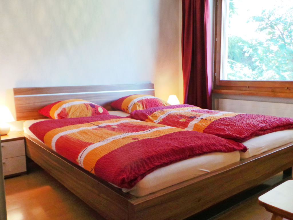 3-Zimmer-Wohnung 70 m2 im 2. Stock. Einfach und zweckmässig eingerichtet: Wohnzimmer mit TV, Radio und DVD. Ausgang zum Balkon. 1 Zimmer mit 1 Doppelbett (2 x 90 cm, Länge 200 cm). 1 Zimmer mit 1 Bett (90 cm, Länge 200 cm), 1 x 2 Etagenbetten (90 cm, Länge 200 cm). Wohnküche (4 Kochplatten, Backofen, Toaster, Wasserkocher, Tiefkühler, elektrische Kaffeemaschine, Fondue Set (Chinoise)) mit Esstisch. Bad/WC. Balkon. Balkonmöbel. Schöne Sicht auf die Berge und die Ortschaft. Zur Verfügung: Haartrockner. Internet (Wireless LAN, gratis). Bitte beachten: Nichtraucher-Unterkunft.
