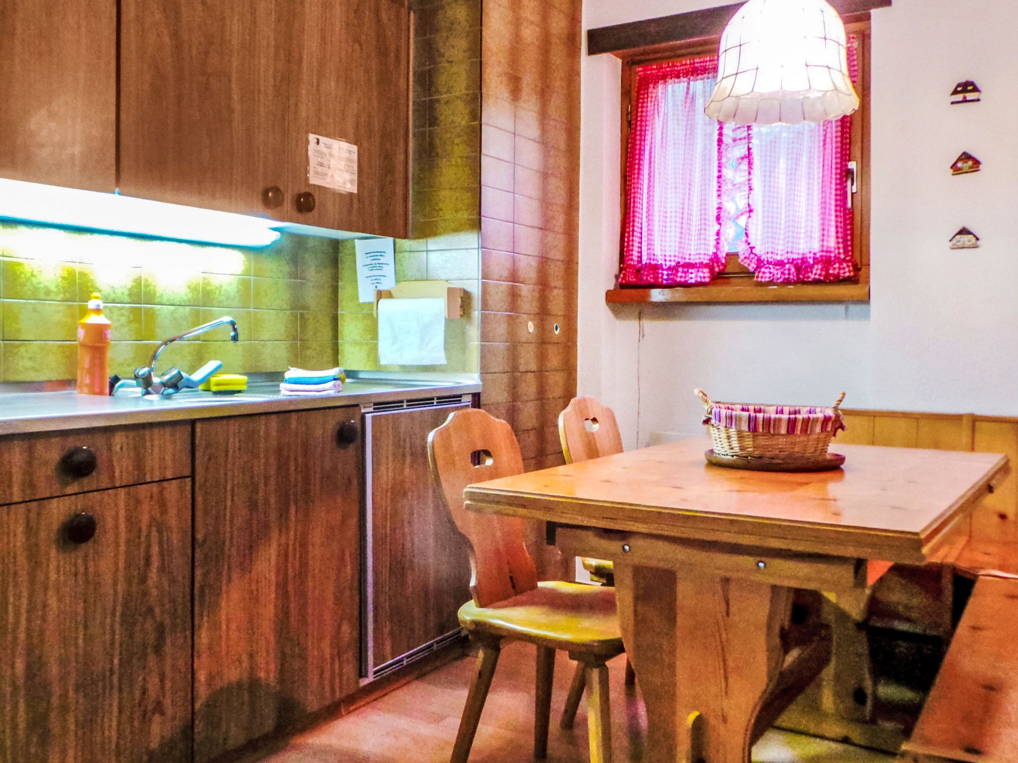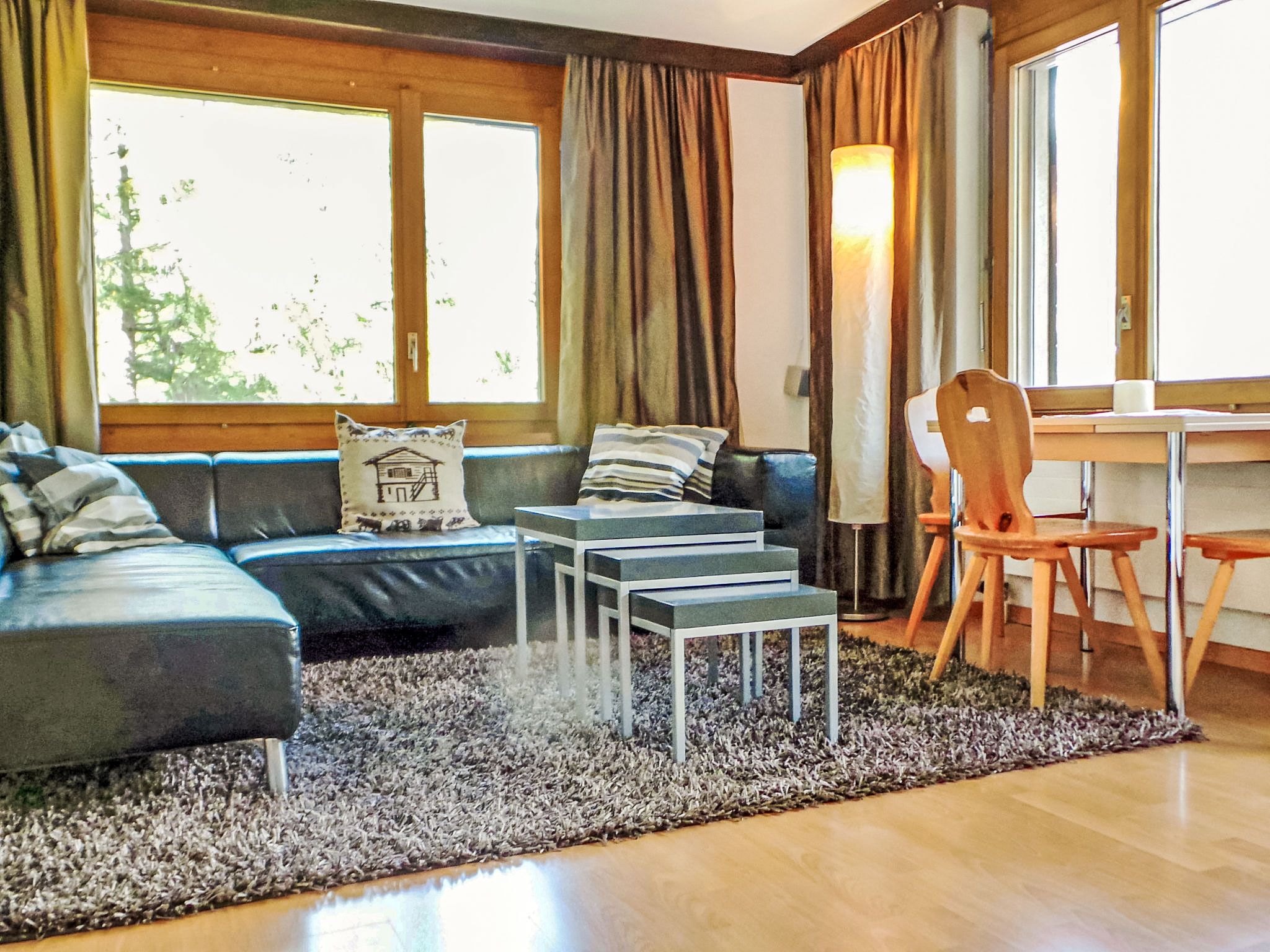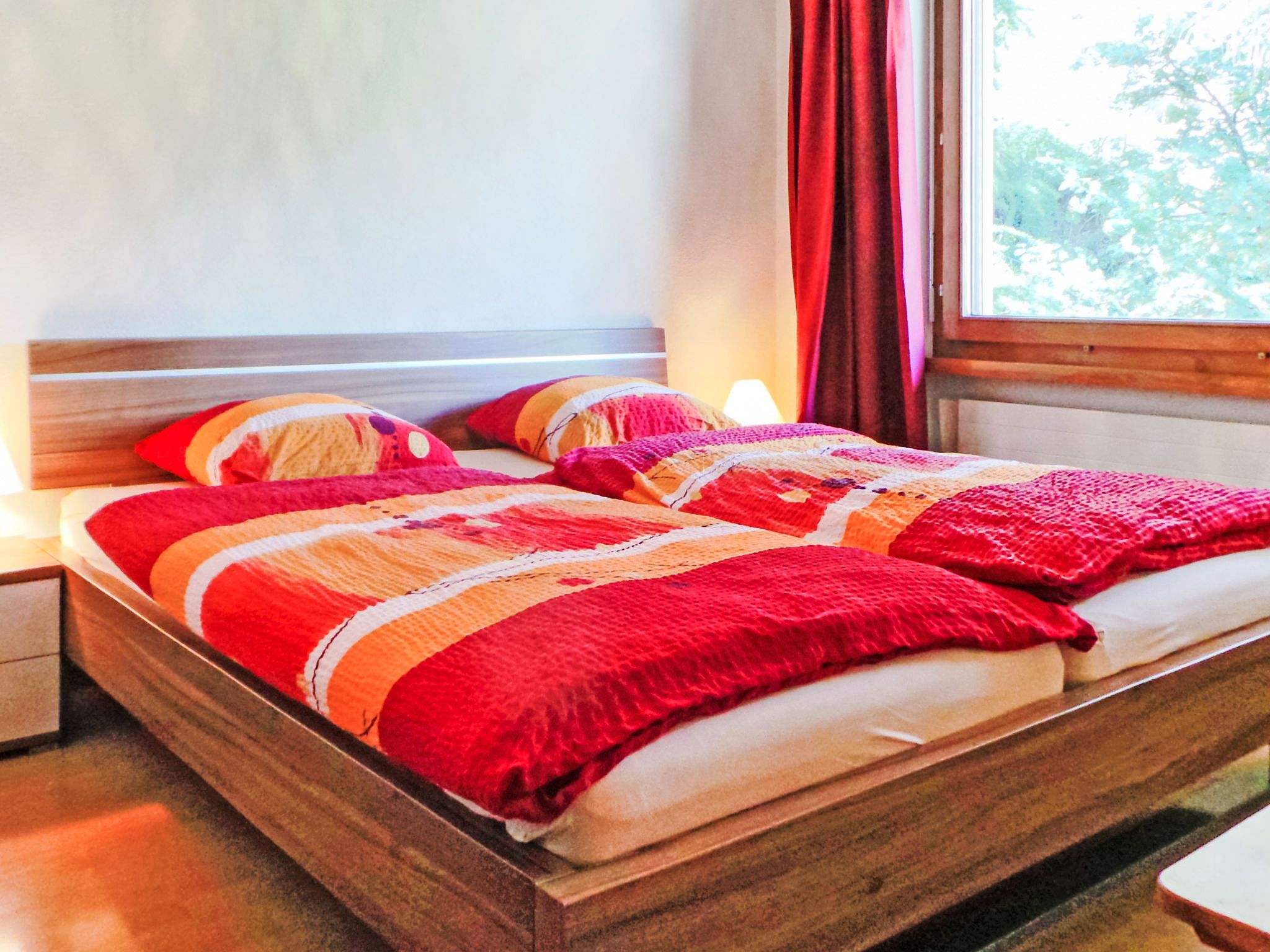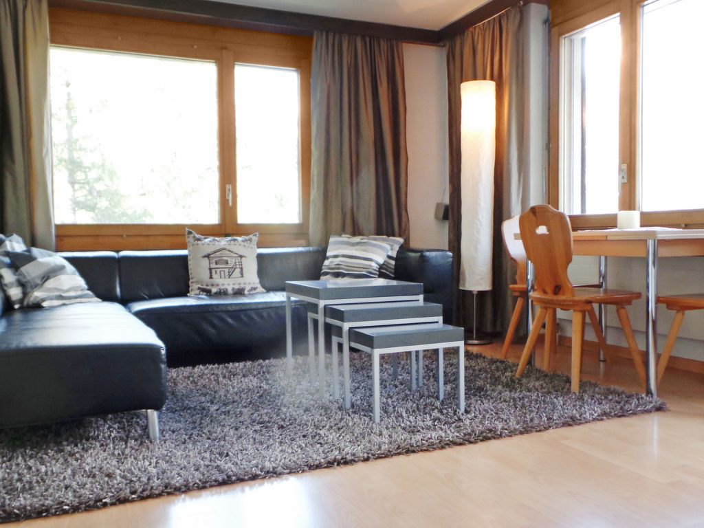 3-Zimmer-Wohnung 70 m2 im 2. Stock. Einfach und zweckmässig eingerichtet: Wohnzimmer mit TV, Radio und DVD. Ausgang zum Balkon. 1 Zimmer mit 1 Doppelbett (2 x 90 cm, Länge 200 cm). 1 Zimmer mit 1 Bett (90 cm, Länge 200 cm), 1 x 2 Etagenbetten (90 cm, Länge 200 cm). Wohnküche (4 Kochplatten, Backofen, Toaster, Wasserkocher, Tiefkühler, elektrische Kaffeemaschine, Fondue Set (Chinoise)) mit Esstisch. Bad/WC. Balkon. Balkonmöbel. Schöne Sicht auf die Berge und die Ortschaft. Zur Verfügung: Haartrockner. Internet (Wireless LAN, gratis). Bitte beachten: Nichtraucher-Unterkunft.