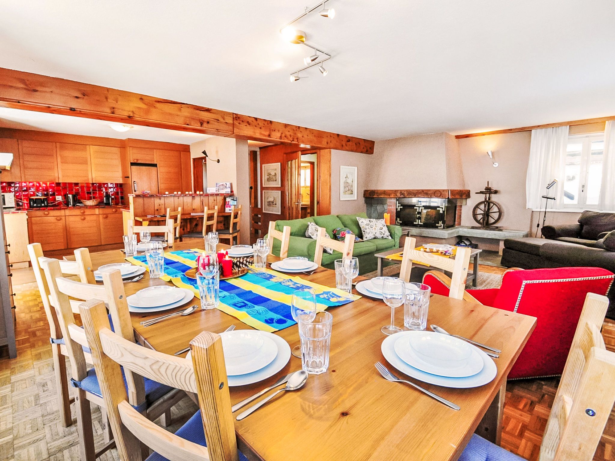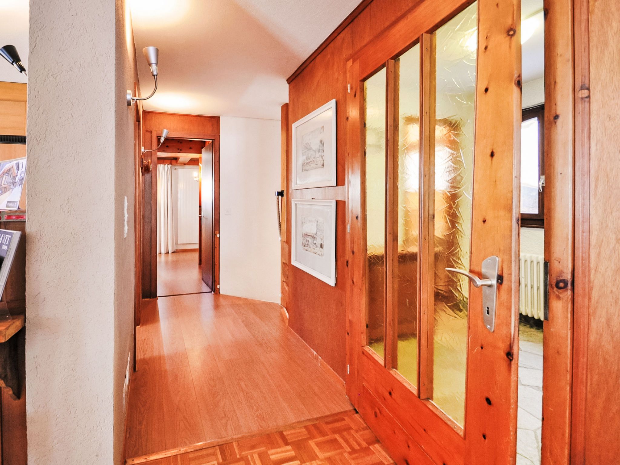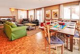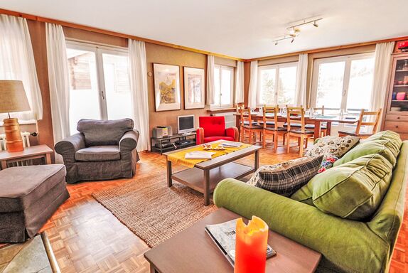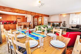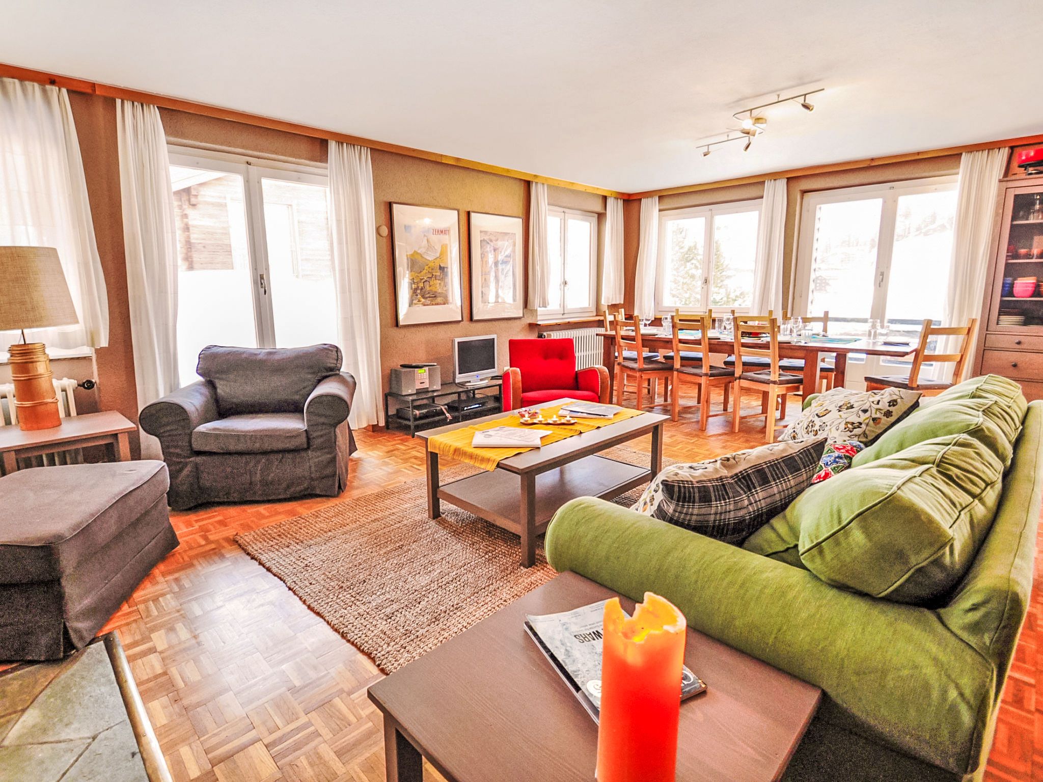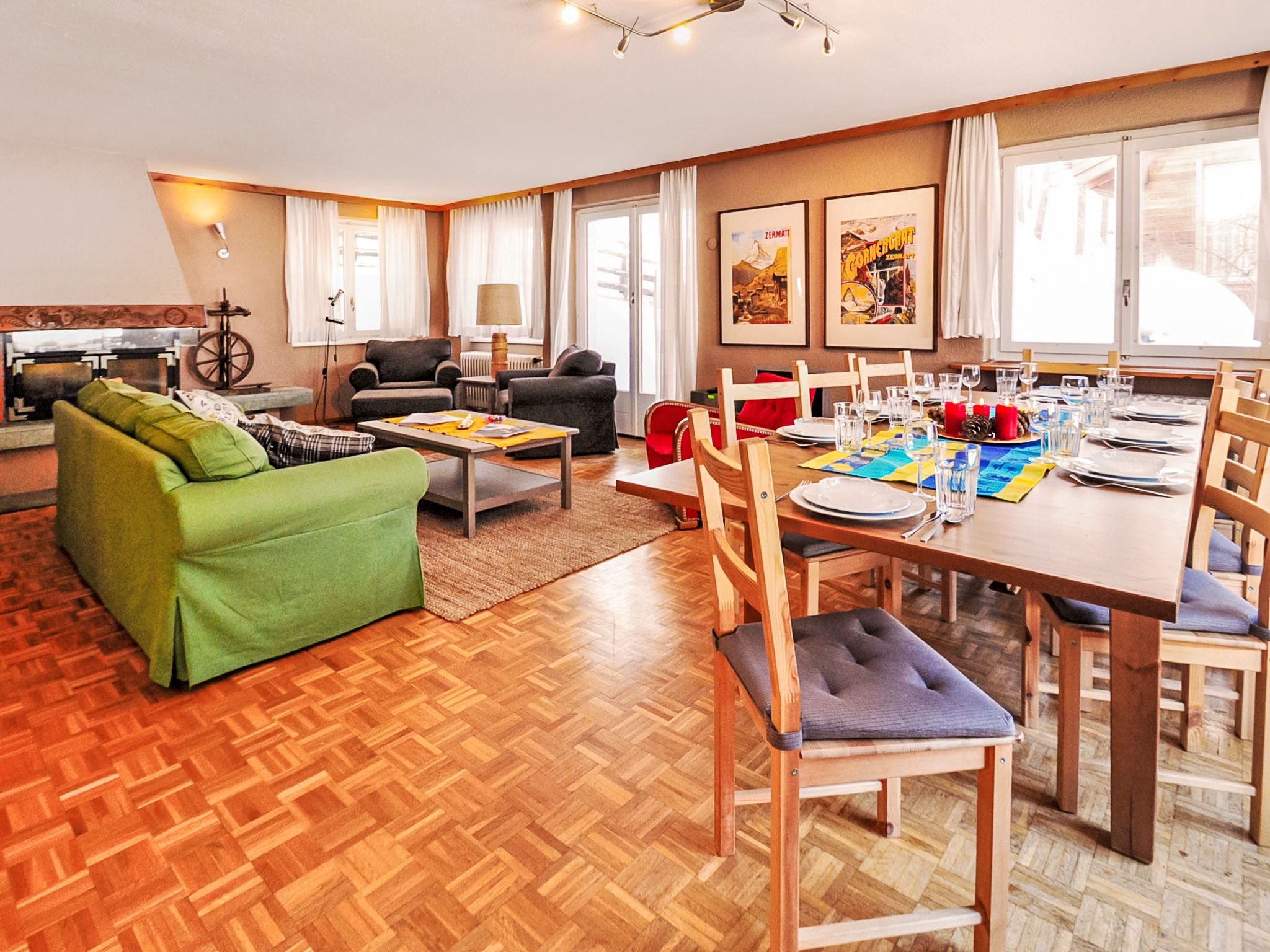 6-Zimmer-Wohnung 200 m2 auf 2 Stockwerken im 1. Stock, Südwestlage. Geräumig, komfortabel und geschmackvoll eingerichtet: Wohn-/Esszimmer mit offenem Kamin, Esstisch, TV, Stereoanlage und DVD. Ausgang zum Balkon. 1 Zimmer mit Schiebetür mit 1 x 2 Etagenbetten (90 cm, Länge 200 cm), 1 Doppelbett (160 cm, Länge 200 cm), Bad/Bidet/WC. Offene Küche (Backofen, Geschirrspüler, 4 Glaskeramikplatten, Toaster, Wasserkocher, Mikrowelle, Tiefkühler, elektrische Kaffeemaschine, Racletteofen, Fondue Set (Chinoise, Käse)). Sep. WC. Unteres Geschoss: (Wendeltreppe) 1 Zimmer, ohne Fenster mit 1 x 2 Etagenbetten (90 cm, Länge 200 cm). 1 Zimmer mit 1 Doppelbett (2 x 90 cm, Länge 200 cm). 1 Zimmer mit 1 Doppelbett (2 x 90 cm, Länge 200 cm). 1 Zimmer mit 1 Doppelbett (2 x 90 cm, Länge 200 cm). Bad/Bidet/WC. Grosser Balkon, Südlage und Westlage. Balkonmöbel. Sicht auf das Matterhorn. Zur Verfügung: Haartrockner. Internet (Wireless LAN, gratis). Bitte beachten: Nichtraucher-Unterkunft. TIN