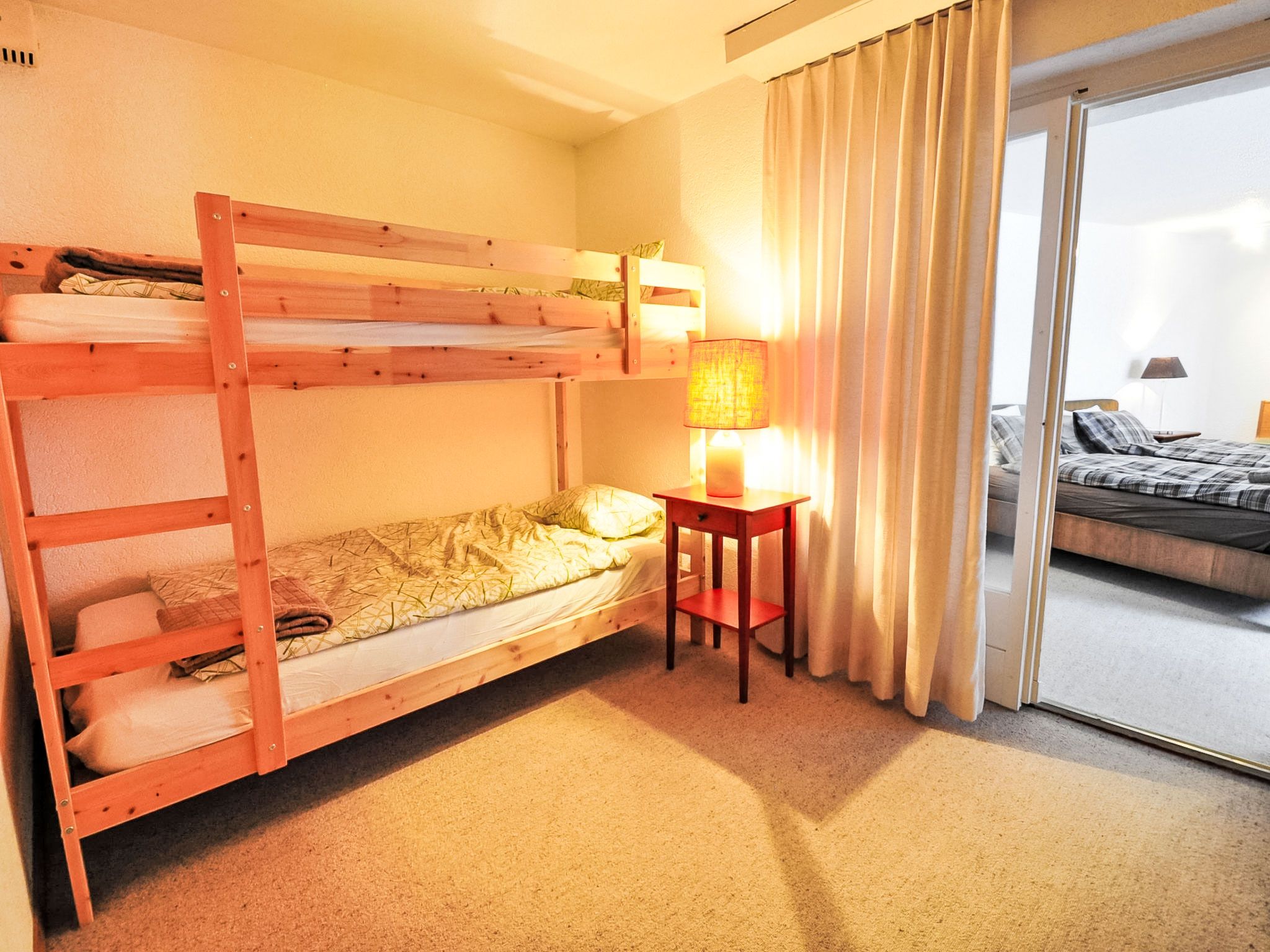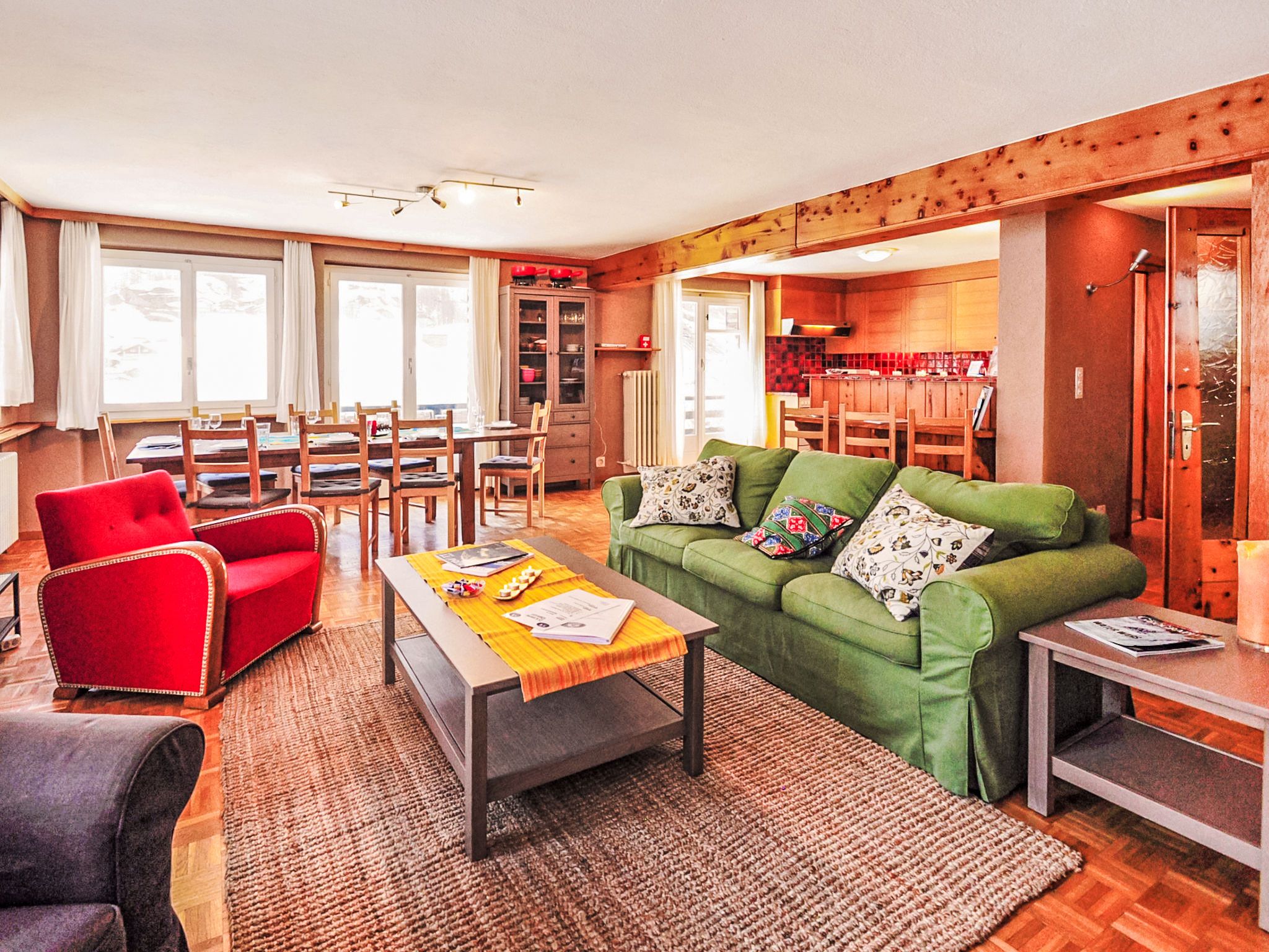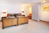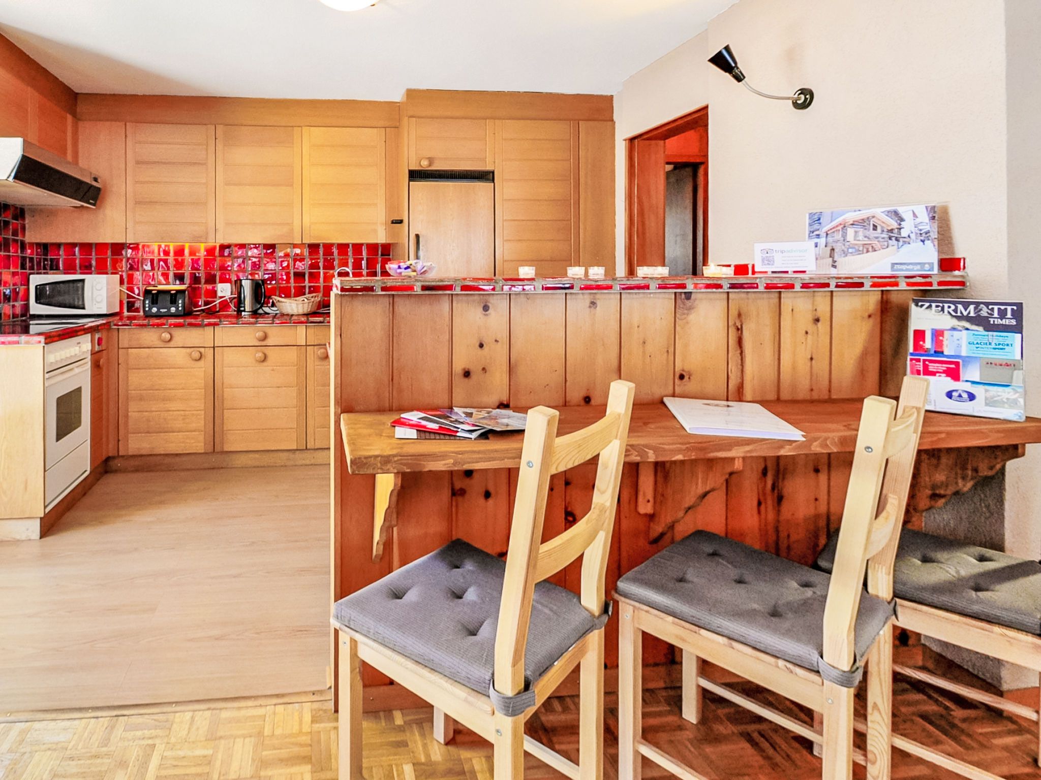 6-Zimmer-Wohnung 200 m2 auf 2 Stockwerken im 1. Stock, Südwestlage. Geräumig, komfortabel und geschmackvoll eingerichtet: Wohn-/Esszimmer mit offenem Kamin, Esstisch, TV, Stereoanlage und DVD. Ausgang zum Balkon. 1 Zimmer mit Schiebetür mit 1 x 2 Etagenbetten (90 cm, Länge 200 cm), 1 Doppelbett (160 cm, Länge 200 cm), Bad/Bidet/WC. Offene Küche (Backofen, Geschirrspüler, 4 Glaskeramikplatten, Toaster, Wasserkocher, Mikrowelle, Tiefkühler, elektrische Kaffeemaschine, Racletteofen, Fondue Set (Chinoise, Käse)). Sep. WC. Unteres Geschoss: (Wendeltreppe) 1 Zimmer, ohne Fenster mit 1 x 2 Etagenbetten (90 cm, Länge 200 cm). 1 Zimmer mit 1 Doppelbett (2 x 90 cm, Länge 200 cm). 1 Zimmer mit 1 Doppelbett (2 x 90 cm, Länge 200 cm). 1 Zimmer mit 1 Doppelbett (2 x 90 cm, Länge 200 cm). Bad/Bidet/WC. Grosser Balkon, Südlage und Westlage. Balkonmöbel. Sicht auf das Matterhorn. Zur Verfügung: Haartrockner. Internet (Wireless LAN, gratis). Bitte beachten: Nichtraucher-Unterkunft. TIN