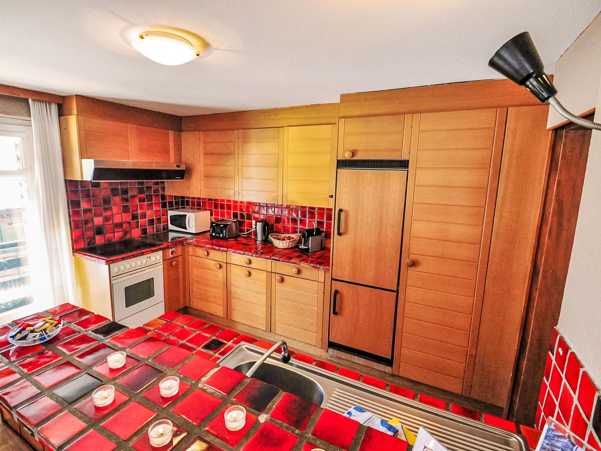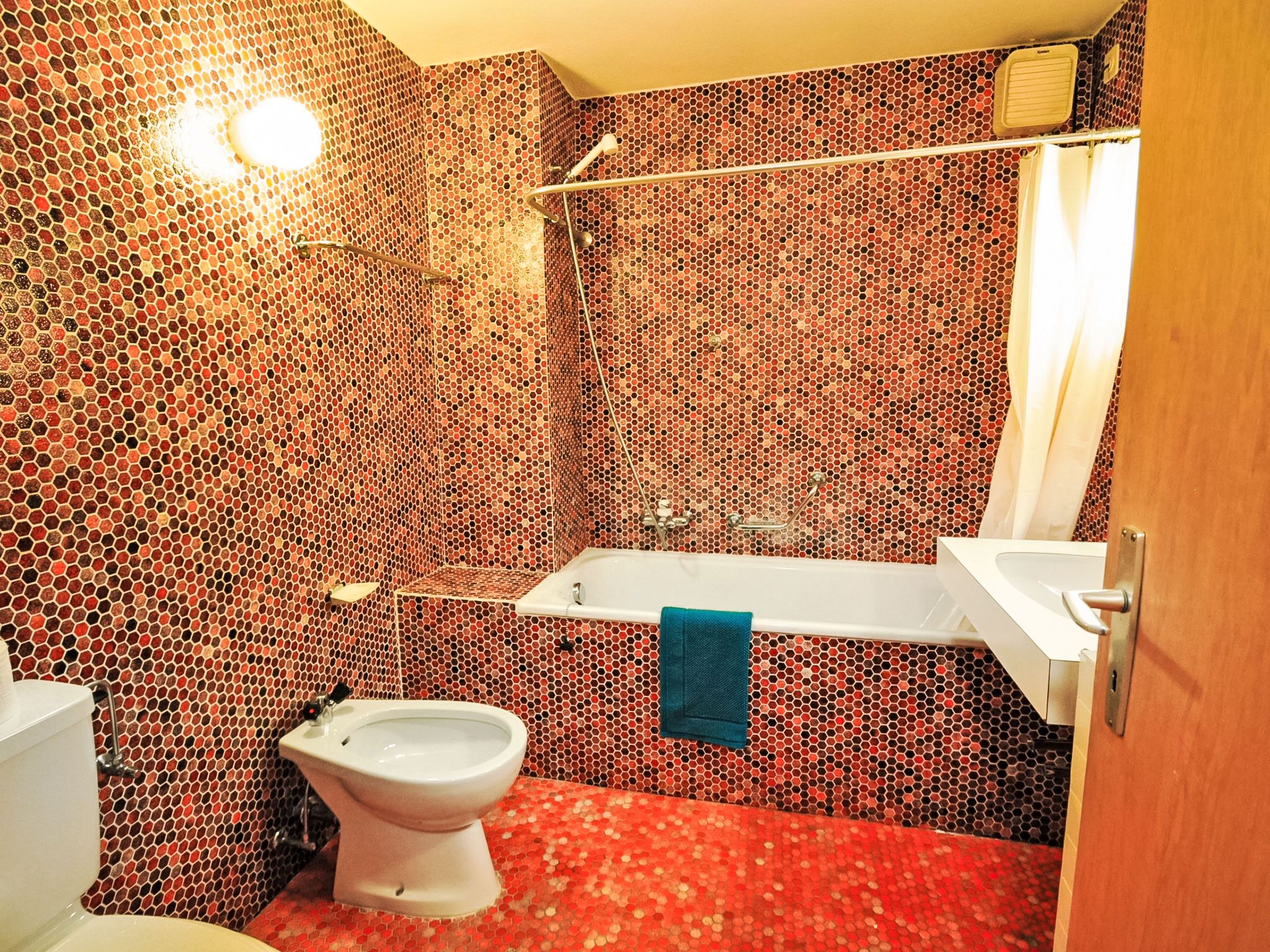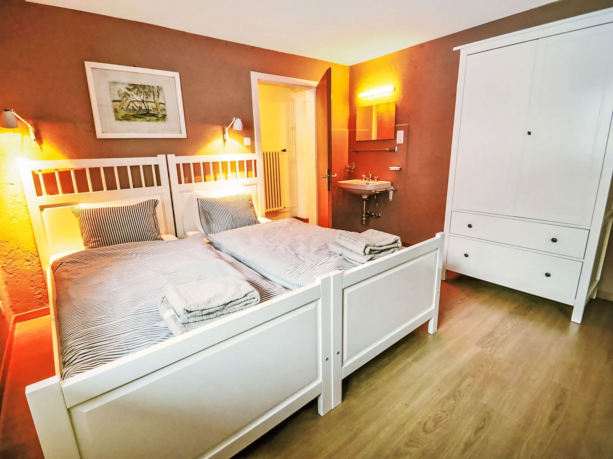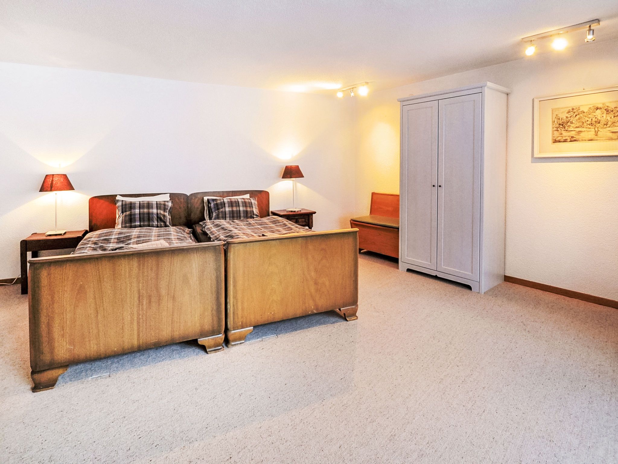 6-Zimmer-Wohnung 200 m2 auf 2 Stockwerken im 1. Stock, Südwestlage. Geräumig, komfortabel und geschmackvoll eingerichtet: Wohn-/Esszimmer mit offenem Kamin, Esstisch, TV, Stereoanlage und DVD. Ausgang zum Balkon. 1 Zimmer mit Schiebetür mit 1 x 2 Etagenbetten (90 cm, Länge 200 cm), 1 Doppelbett (160 cm, Länge 200 cm), Bad/Bidet/WC. Offene Küche (Backofen, Geschirrspüler, 4 Glaskeramikplatten, Toaster, Wasserkocher, Mikrowelle, Tiefkühler, elektrische Kaffeemaschine, Racletteofen, Fondue Set (Chinoise, Käse)). Sep. WC. Unteres Geschoss: (Wendeltreppe) 1 Zimmer, ohne Fenster mit 1 x 2 Etagenbetten (90 cm, Länge 200 cm). 1 Zimmer mit 1 Doppelbett (2 x 90 cm, Länge 200 cm). 1 Zimmer mit 1 Doppelbett (2 x 90 cm, Länge 200 cm). 1 Zimmer mit 1 Doppelbett (2 x 90 cm, Länge 200 cm). Bad/Bidet/WC. Grosser Balkon, Südlage und Westlage. Balkonmöbel. Sicht auf das Matterhorn. Zur Verfügung: Haartrockner. Internet (Wireless LAN, gratis). Bitte beachten: Nichtraucher-Unterkunft. TIN