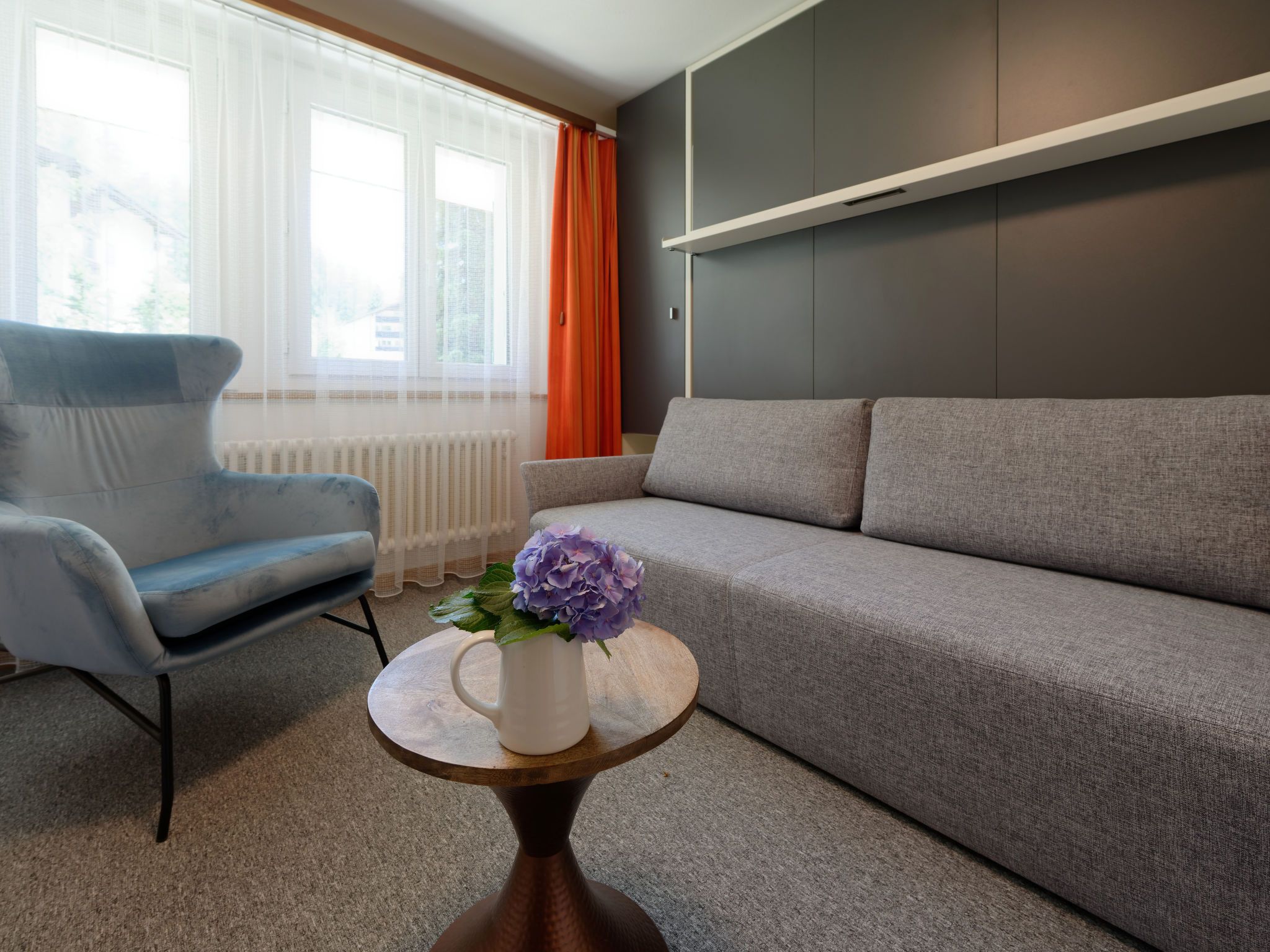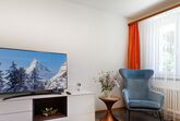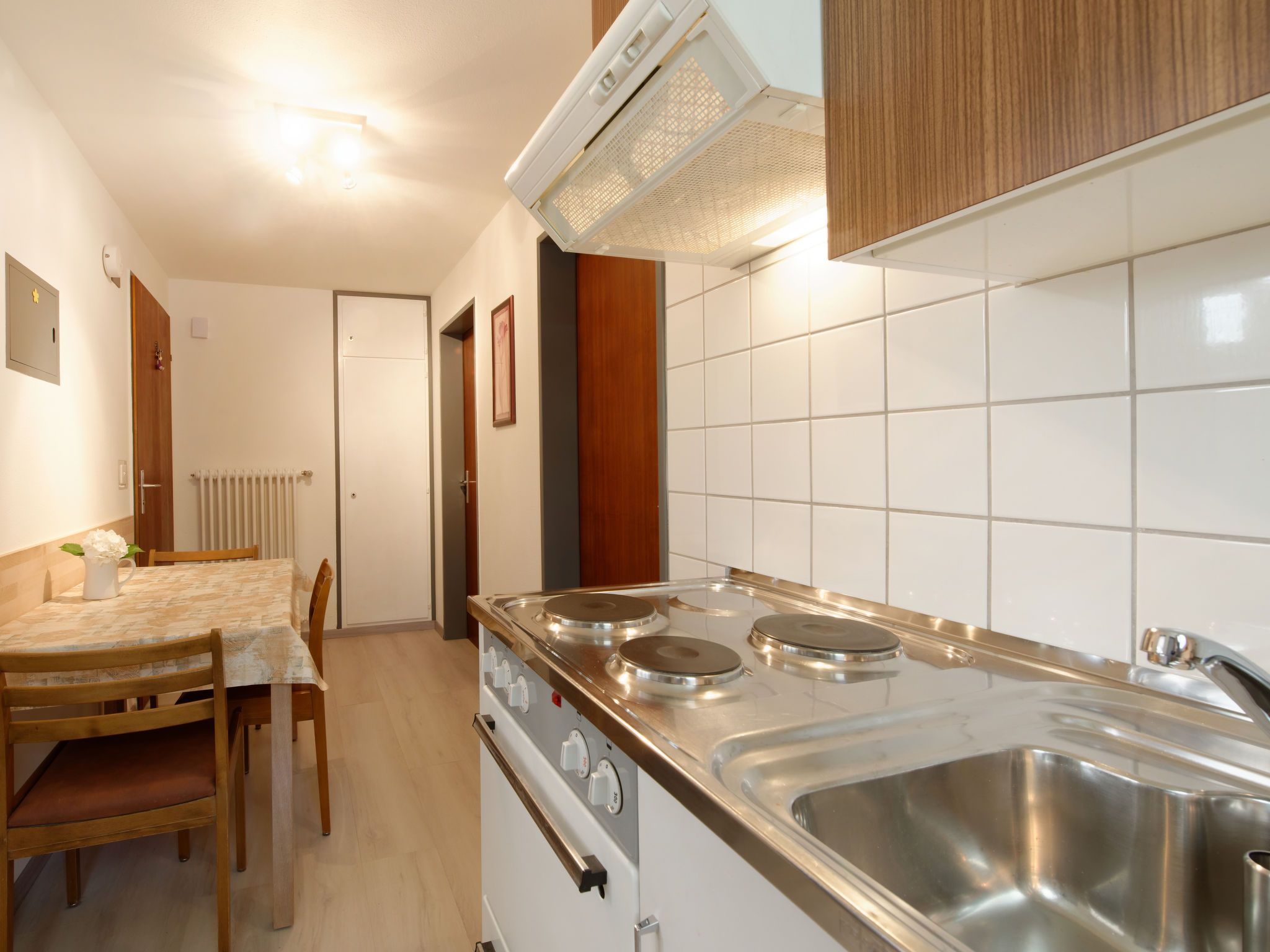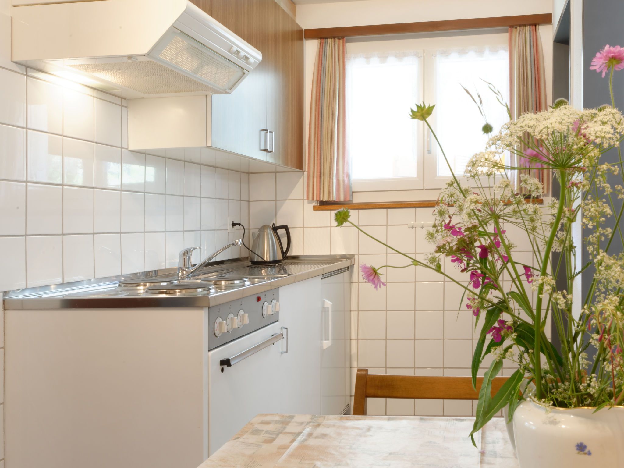 2-Zimmer-Wohnung 30 m2, im Erdgeschoss, Südwestlage. Einfach und gemütlich eingerichtet: Wohn-/Schlafzimmer mit 1 Doppelwandklappbett (1 x 160 cm, Länge 200 cm), TV und Radio. 1 Zimmer mit 1 Bett (90 cm, Länge 200 cm). Offene Küche (3 Kochplatten, Backofen, Wasserkocher, Mikrowelle, Tiefkühler, elektrische Kaffeemaschine). Dusche/WC. Heizung. Kleine Terrasse, Südlage. Terrassenmöbel. Seitliche Sicht auf die Berge. Zur Verfügung: Internet (Wireless LAN). Bitte beachten: Nichtraucher-Unterkunft.
