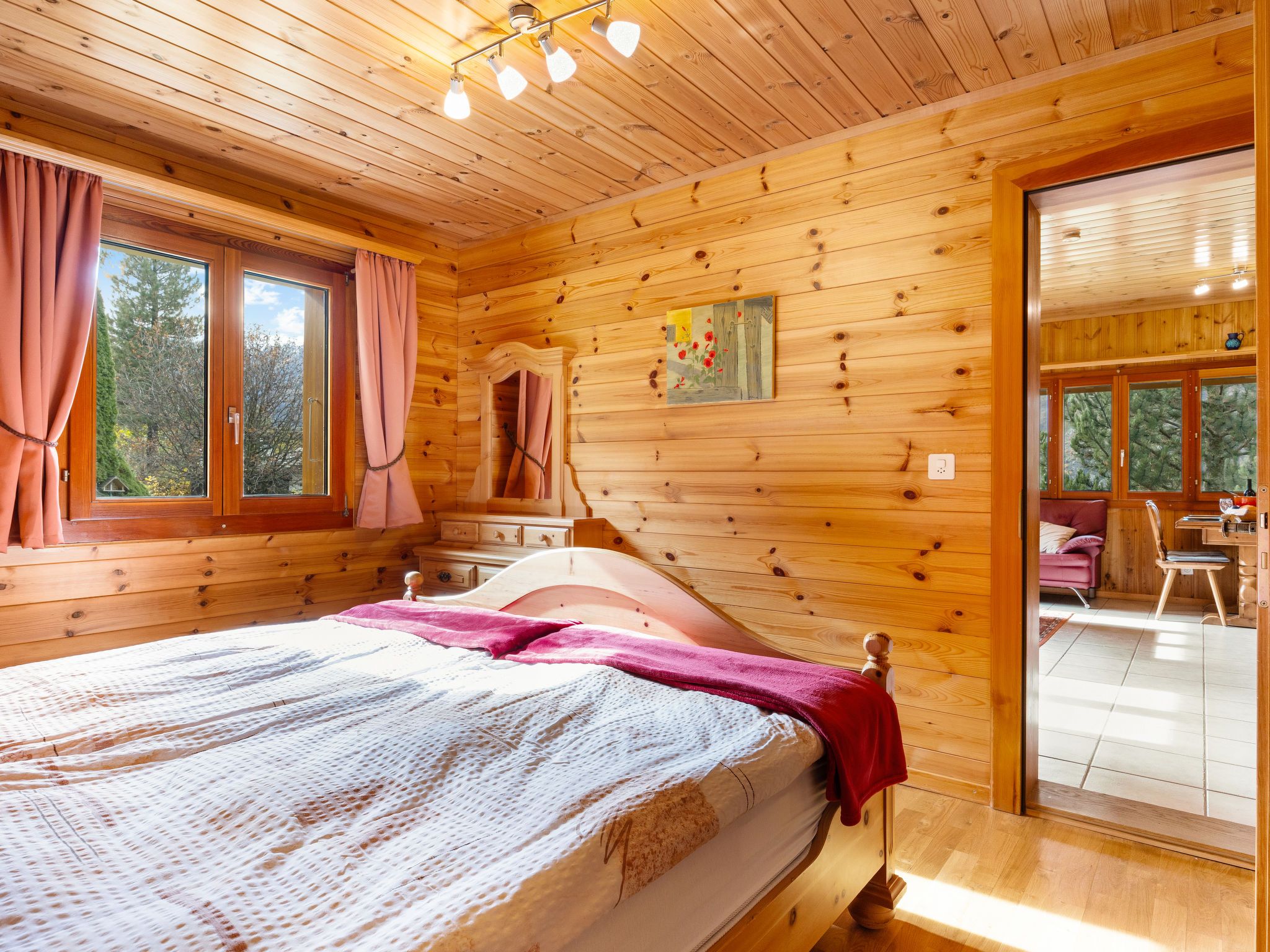 3-Zimmer-Chalet 72 m2. Rustikal und gemütlich eingerichtet: Wohn-/Esszimmer mit offenem Kamin und Sat-TV (Flachbildschirm), Radio. Ausgang zum Gartensitzplatz. 2 Zimmer, jedes Zimmer mit 2 Betten. Offene Küche (Backofen, Geschirrspüler, 4 Glaskeramikplatten) mit Esstisch. Dusche/WC. E-Heizung, Holzheizung, Boiler (130 Liter). Grosser Gartensitzplatz 150 m2. Terrassenmöbel, Gartengrill. Sehr schöne Sicht auf die Berge, das Tal und die Landschaft. Zur Verfügung: Waschmaschine, Haartrockner. Internet (Wireless LAN, gratis). Garage in 200 m. Bitte beachten: Nichtraucher-Unterkunft. 'Keine Haustiere erlaubt.