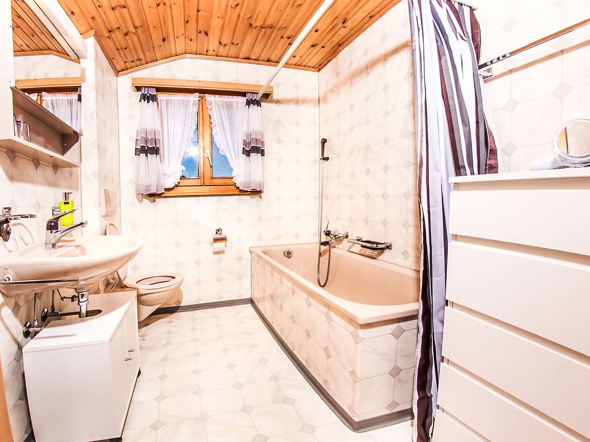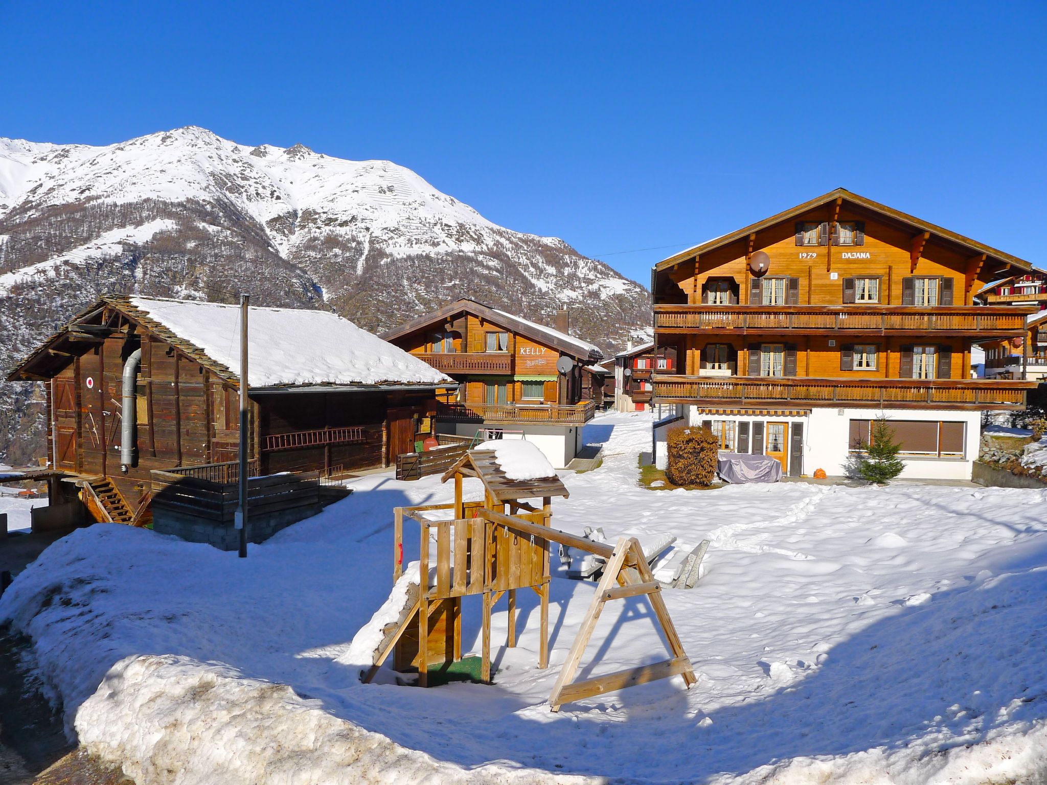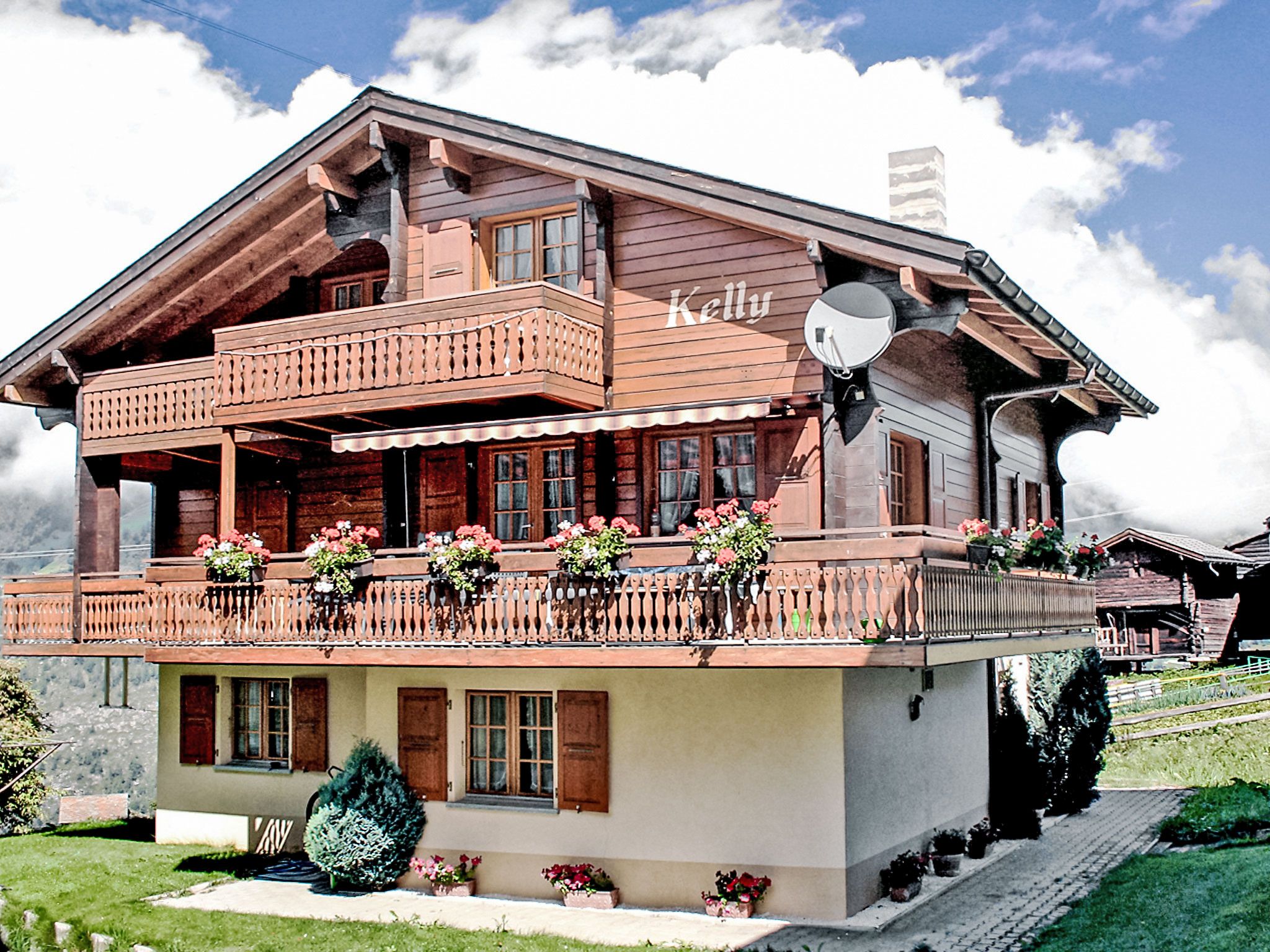 Kinderfreundliches, gemütliches Chalet Kelly, 1'500 m.ü.M., auf 3 Stockwerken, Baujahr 1997. Im Ortsteil Bina, 1.2 km vom Zentrum von Grächen, ruhige, sonnige Lage, 500 m vom Skigebiet. Zur Mitbenutzung: Garten, Liegewiese. Tischtennis. Im Hause: Skiraum, Zentralheizung. Zufahrt bis 50 m zum Haus (Bergstrasse). Im Winter bitte Schneeketten mitbringen, im Winter 4x4 empfohlen. Parkplatz in 50 m. Lebensmittelgeschäft 100 m, Supermarkt 500 m, Restaurant 500 m, Bar, Bushaltestelle 50 m, 2 km. Tennis 400 m, Luftseilbahn 500 m, Skilift, Gondelbahn, Skisportanlagen, Skibushaltestelle 50 m, Skischule, Schlittelbahn, Eisfeld 1 km, Kinderspielplatz 500 m. Bekannte Skigebiete sind gut erreichbar: Zermatt 25 km, Saas Fee 30 km. Bitte beachten: Der Besitzer wohnt im selben Haus. Gratis-Parkplatz in der Nähe des Hauses, auf der anderen Strassenseite. Umzäumter Garten mit Spielplatz (Schaukel) zur Mitbenutzung auf dem Nachbarsgrundstück (gegenüber). Privater Skiraum mit Schuhwärmesystem neben der Bergbahn Hanigalp.