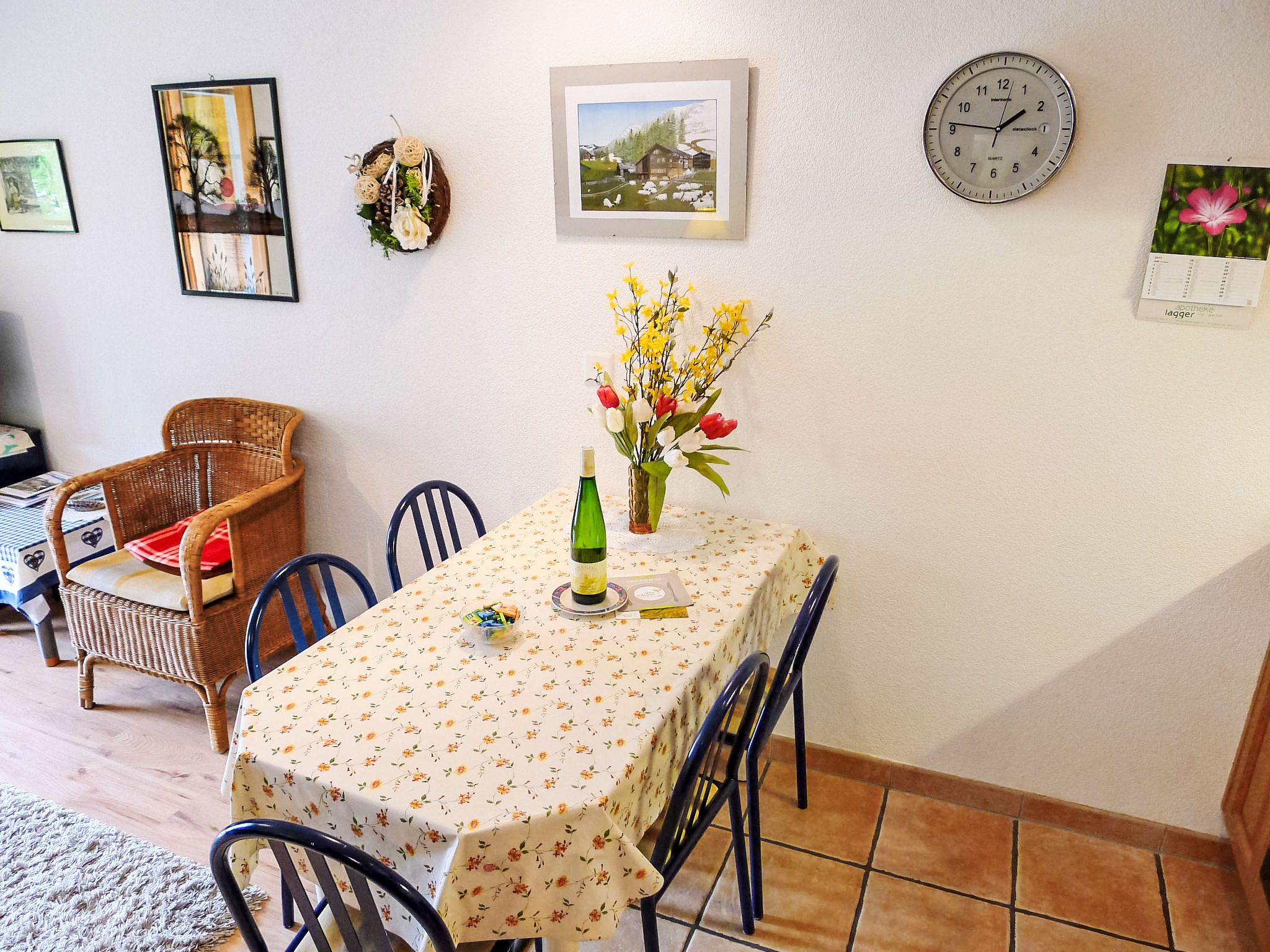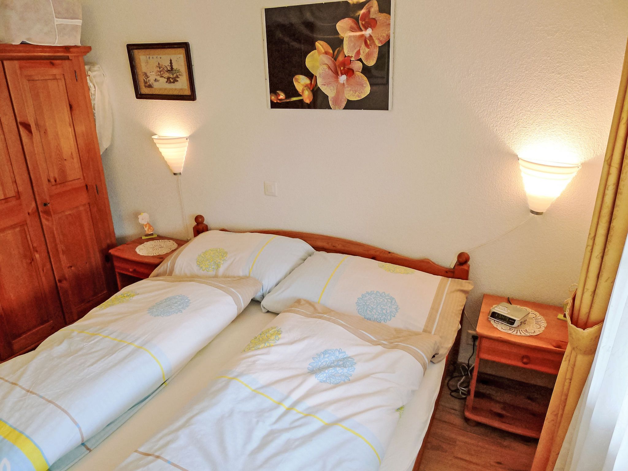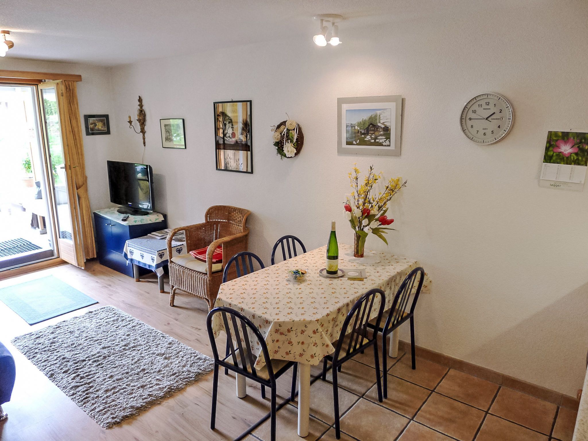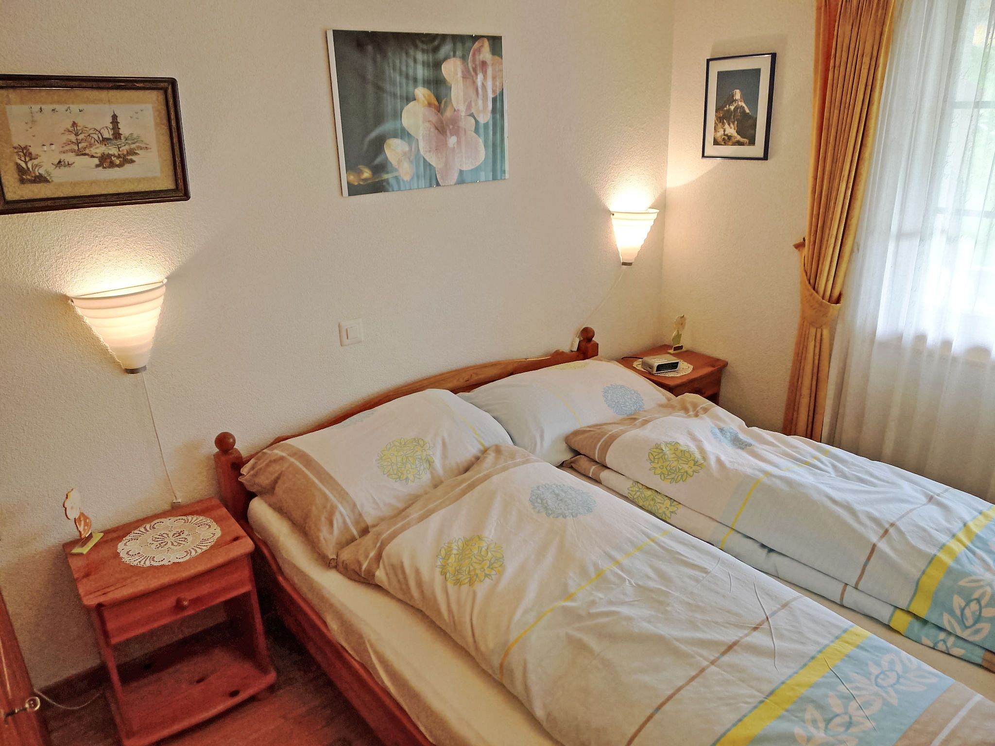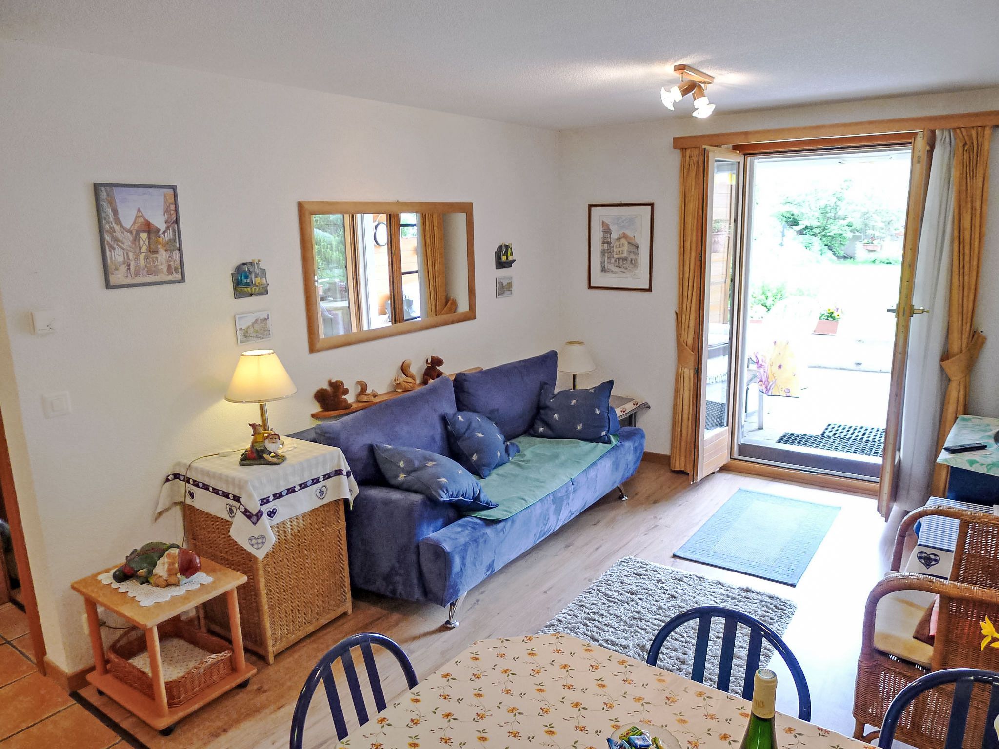 2-Zimmer-Wohnung 38 m2, im Erdgeschoss. Schön und gemütlich eingerichtet: Wohn-/Schlafzimmer mit 1 Doppeldiwanbett, Esstisch und Sat-TV (Flachbildschirm). Ausgang zur Terrasse, Richtung Süden. 1 Zimmer mit 1 Doppelbett. Offene Küche (4 Kochplatten, Backofen, elektrische Kaffeemaschine). Dusche/WC. Grosse Terrasse. Terrassenmöbel, Liegestühle (2). Schöne Sicht auf die Berge. Zur Verfügung: Babybett, Haartrockner. Internet (Wireless LAN, gratis). Parkplatz (extra). Bitte beachten: Nichtraucher-Unterkunft.