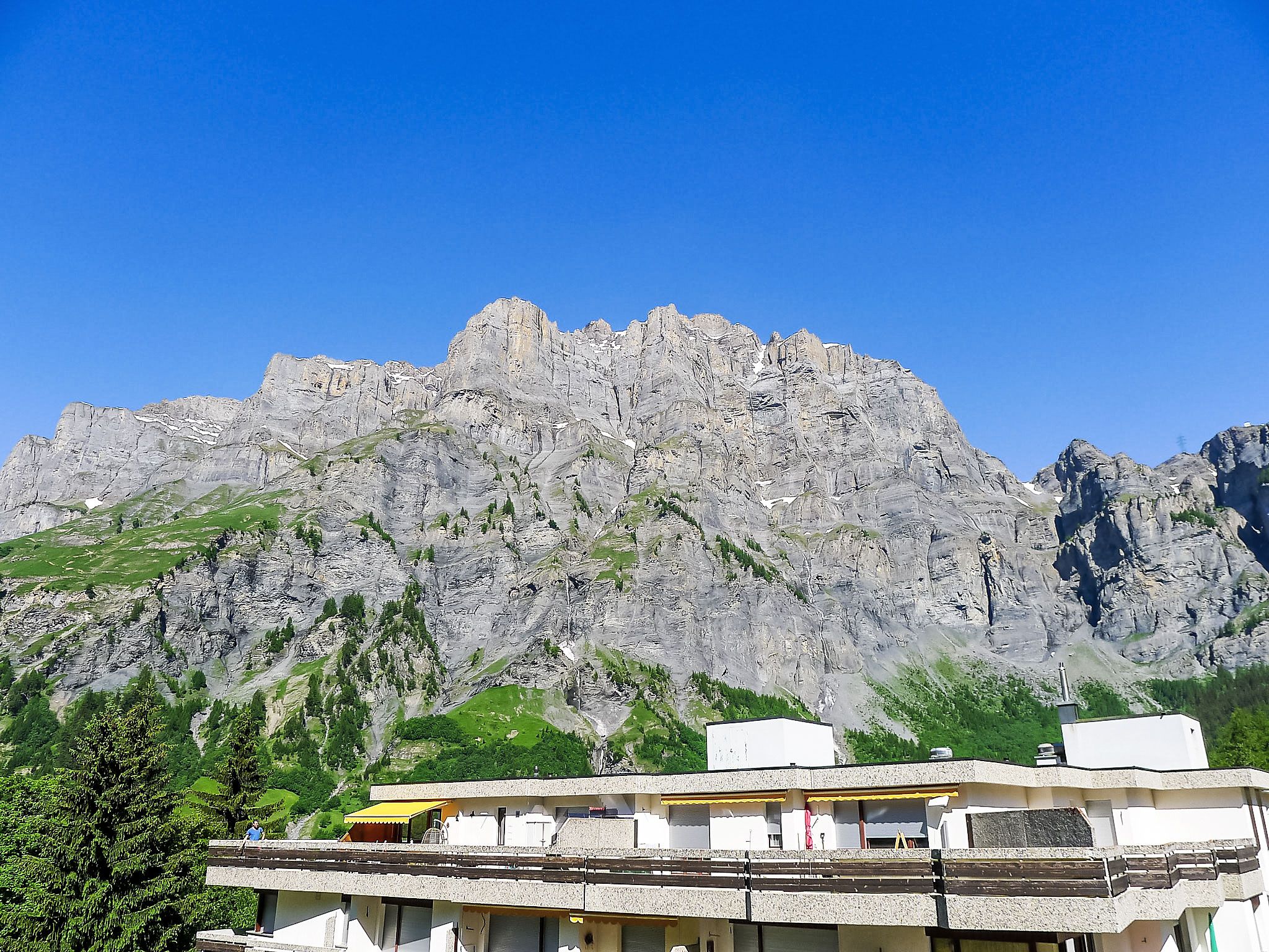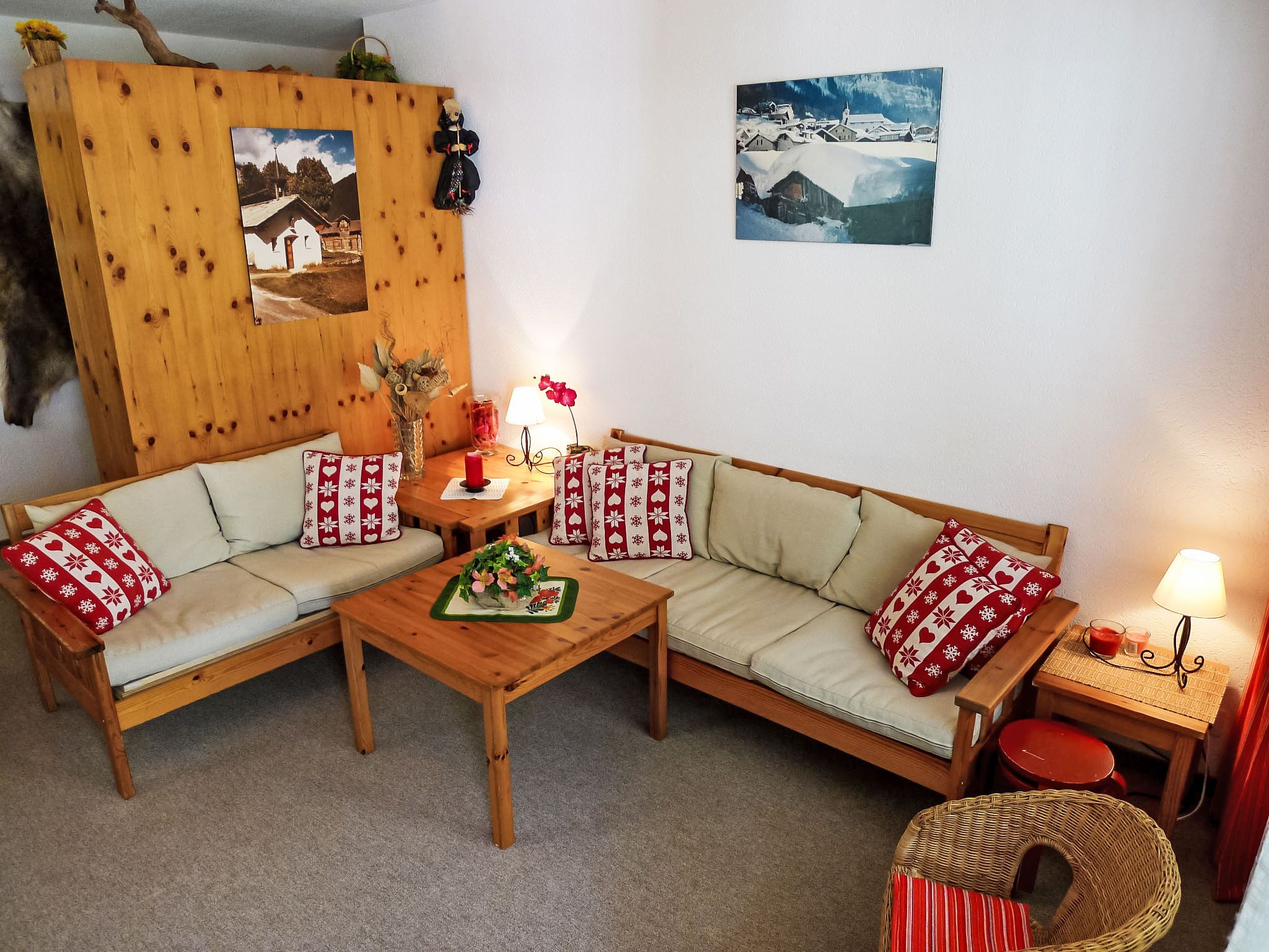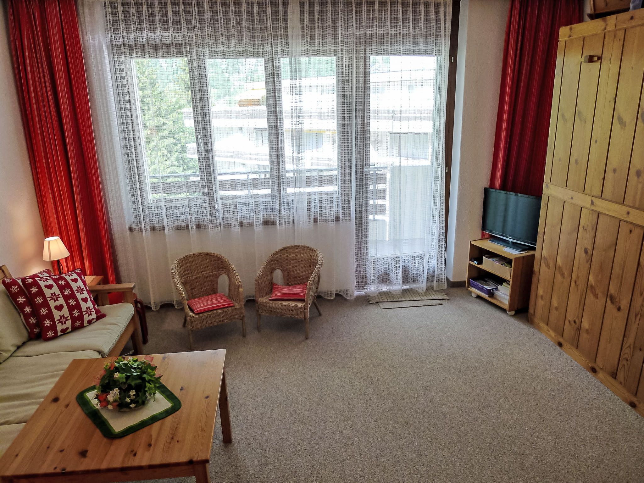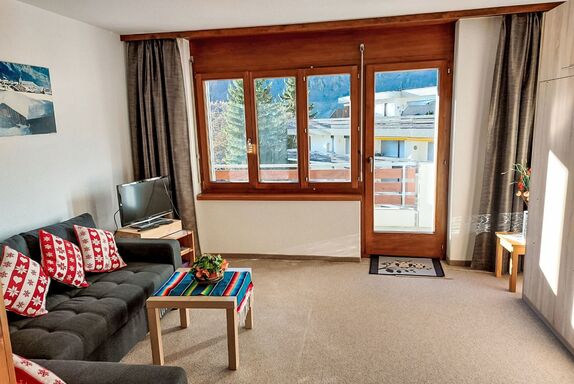 2-Zimmer-Wohnung 65 m2 im 3. Stock. Zweckmässig und gemütlich eingerichtet: Wohn-/Esszimmer mit 1 franz. Wandschrankbett (140 cm, Länge 190 cm), Esstisch und Kabel-TV (Flachbildschirm), Stereoanlage. Ausgang zum Balkon, Richtung Süden. 1 Zimmer mit 2 Wandschrankbetten. Küche (4 Kochplatten, Backofen, Mikrowelle, elektrische Kaffeemaschine). Bad/WC. Balkonmöbel, Liegestühle (2). Sehr schöne Sicht auf die Berge und die Ortschaft. Zur Verfügung: Babybett bis 2 Jahre. Internet (Wireless LAN, gratis). Parkplatz Nr. 10 (überdacht). Bitte beachten: Nichtraucher-Unterkunft.