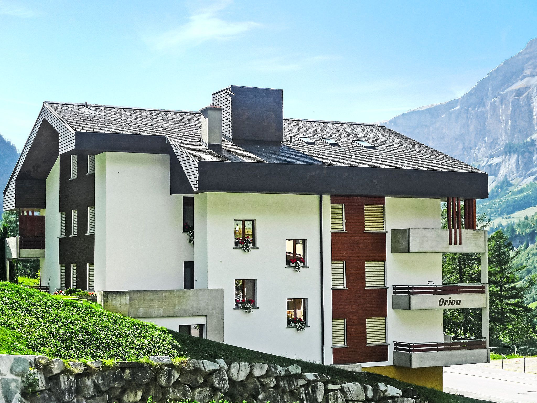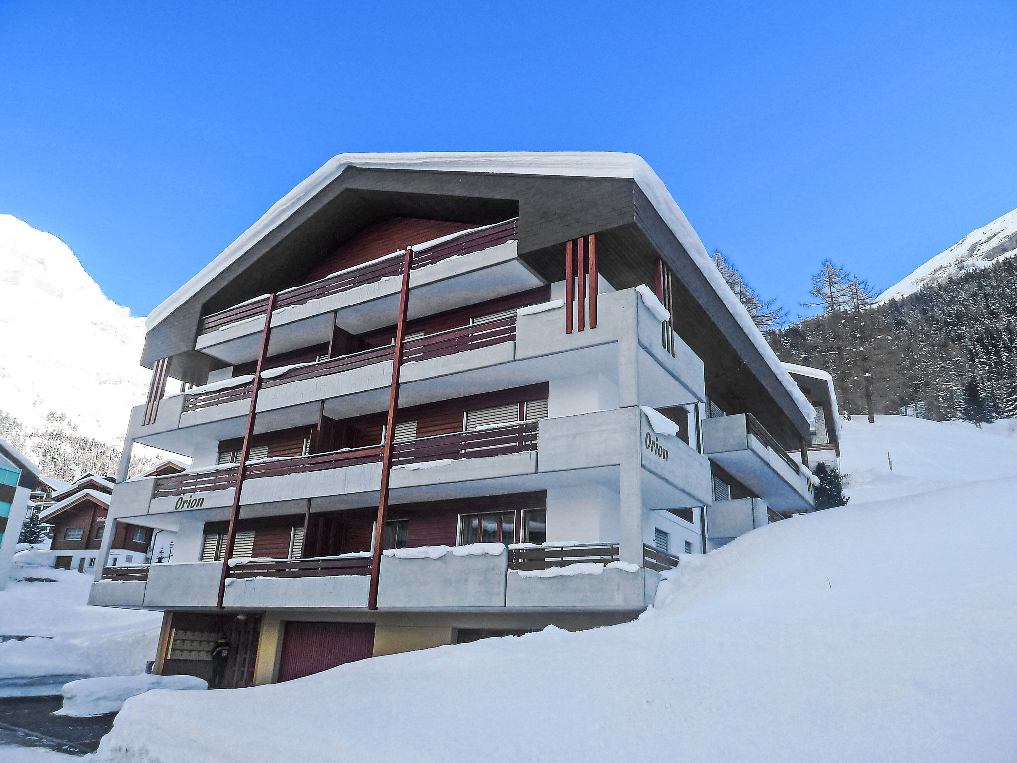 Gemütliches Appartementhaus Orion, auf 3 Stockwerken, Baujahr 1987. Zentrale, sonnige, erhöhte Lage, an einer Strasse. Im Hause: Fahrstuhl, Skiraum, Zentralheizung. Parkplatz (überdacht), Gemeinschaftsgarage. Einkaufsgeschäft, Lebensmittelgeschäft 400 m, Restaurant 100 m, Bar, Café 400 m, Bushaltestelle Leukerbad, Obere Maressen 200 m, Thermalbad 400 m. Bergeisenbahn, Skisportanlagen 600 m, Skibushaltestelle 150 m, Eisfeld 1 km.